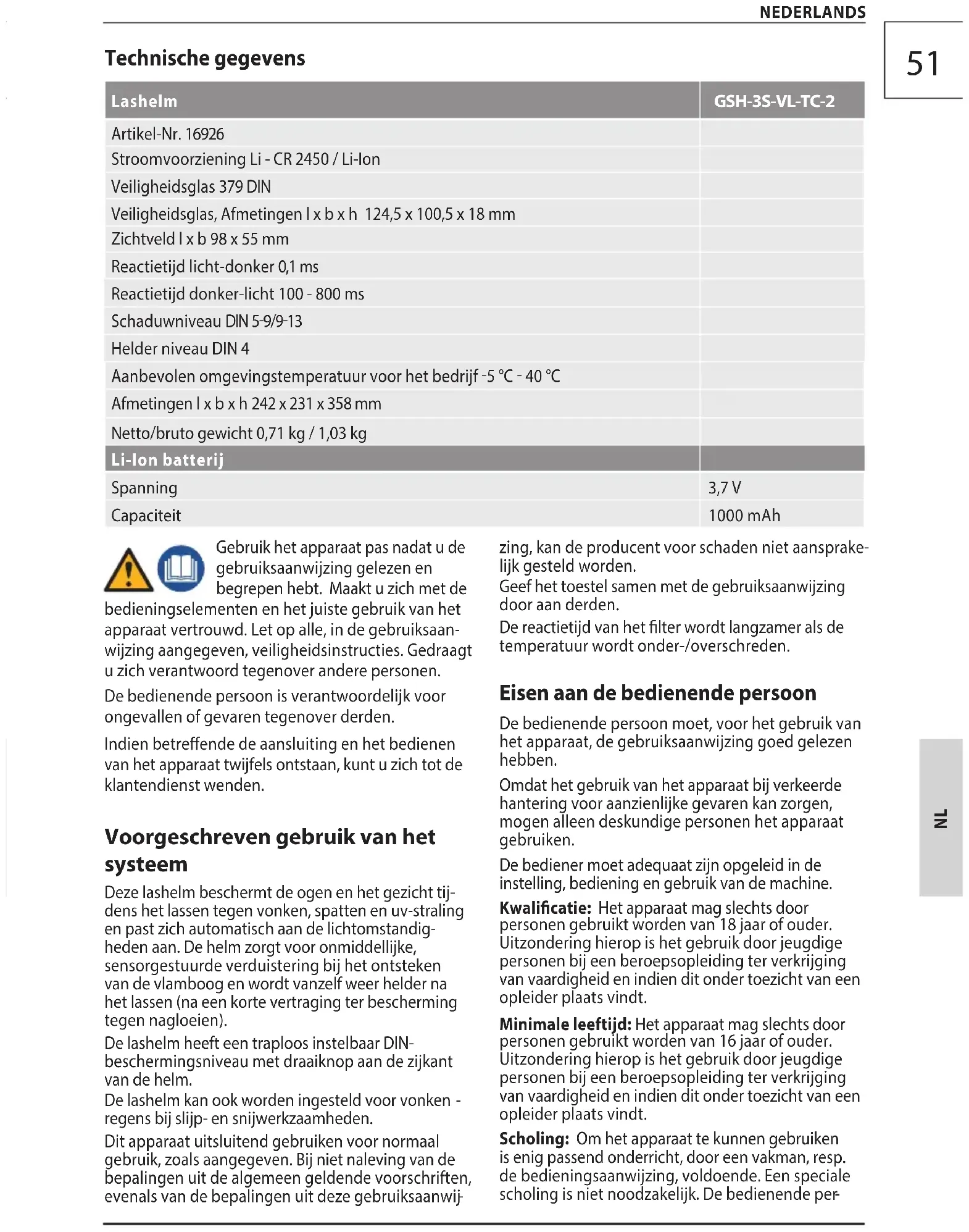 Technische gegevens Lashelm GSH-3S-VL-TC-2 Artikel-Nr. 16926 Stroomvoorziening Li - CR 2450 / Li-Ion Veiligheidsglas 379 DIN Veiligheidsglas, Afmetingen l x b x h 124,5 x 100,5 x 18 mm Zichtveld l x b 98 x 55 mm Reactietijd licht-donker 0,1 ms Reactietijd donker-licht 100 - 800 ms Schaduwniveau DIN 59/913 Helder niveau DIN 4 Aanbevolen omgevingstemperatuur voor het bedrijf 5 °C 40 °C Afmetingen l x b x h 242 x 231 x 358 mm Netto/bruto gewicht 0,71 kg / 1,03 kg Li-Ion batterij Spanning 3,7 V Capaciteit 1000 mAh NEDERLANDS Gebruik het apparaat pas nadat u de gebruiksaanwijzing gelezen en begrepen hebt. Maakt u zich met de bedieningselementen en het juiste gebruik van het apparaat vertrouwd. Let op alle, in de gebruiksaan- wijzing aangegeven, veiligheidsinstructies. Gedraagt u zich verantwoord tegenover andere personen. De bedienende persoon is verantwoordelijk voor ongevallen of gevaren tegenover derden. Indien betreende de aansluiting en het bedienen van het apparaat twijfels ontstaan, kunt u zich tot de klantendienst wenden. Voorgeschreven gebruik van het systeem Deze lashelm beschermt de ogen en het gezicht tij- dens het lassen tegen vonken, spatten en uv-straling en past zich automatisch aan de lichtomstandig- heden aan. De helm zorgt voor onmiddellijke, sensorgestuurde verduistering bij het ontsteken van de vlamboog en wordt vanzelf weer helder na het lassen (na een korte vertraging ter bescherming tegen nagloeien). De lashelm heeft een traploos instelbaar DIN- beschermingsniveau met draaiknop aan de zijkant van de helm. De lashelm kan ook worden ingesteld voor vonken