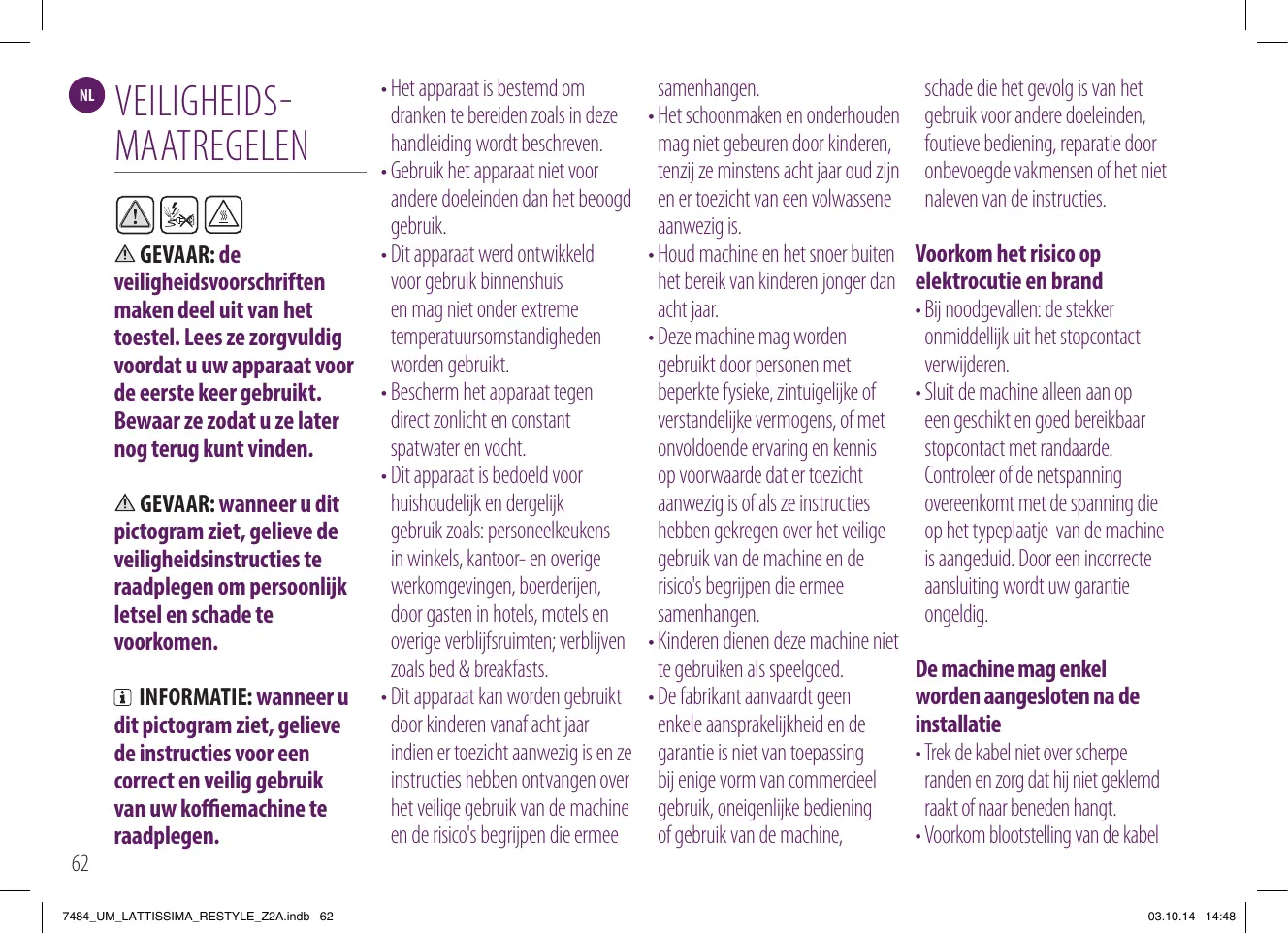 INFORMATIE: wanneer u dit pictogram ziet, gelieve de instructies voor een correct en veilig gebruik van uw koffiemachine te raadplegen. 7484_UM_LATTISSIMA_RESTYLE_Z2A.indb 62