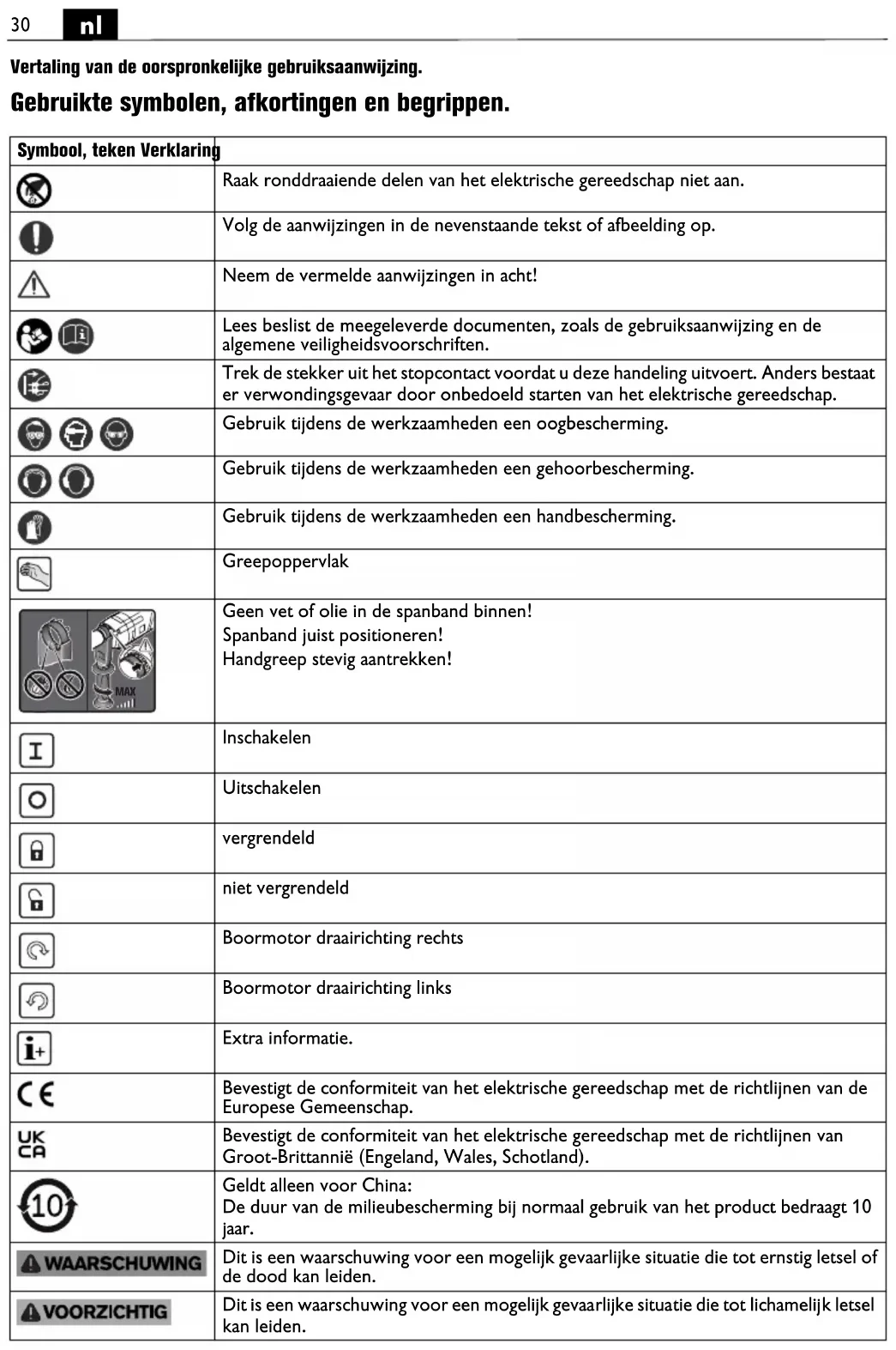 Vertaling van de oorspronkelijke gebruiksaanwijzing. Gebruikte symbolen, afkortingen en begrippen. Symbool, teken Verklaring Raak ronddraaiende delen van het elektrische gereedschap niet aan. Volg de aanwijzingen in de nevenstaande tekst of afbeelding op. Neem de vermelde aanwijzingen in acht! Lees beslist de meegeleverde documenten, zoals de gebruiksaanwijzing en de algemene veiligheidsvoorschriften. Trek de stekker uit het stopcontact voordat u deze handeling uitvoert. Anders bestaat er verwondingsgevaar door onbedoeld starten van het elektrische gereedschap. Gebruik tijdens de werkzaamheden een oogbescherming. Gebruik tijdens de werkzaamheden een gehoorbescherming. Gebruik tijdens de werkzaamheden een handbescherming. Greepoppervlak Geen vet of olie in de spanband binnen! Spanband juist positioneren! Handgreep stevig aantrekken! Inschakelen Uitschakelen vergrendeld niet vergrendeld Boormotor draairichting rechts Boormotor draairichting links Extra informatie. Bevestigt de conformiteit van het elektrische gereedschap met de richtlijnen van de Europese Gemeenschap. Bevestigt de conformiteit van het elektrische gereedschap met de richtlijnen van Groot-Brittannië (Engeland, Wales, Schotland). Geldt alleen voor China: De duur van de milieubescherming bij normaal gebruik van het product bedraagt 10 jaar. Dit is een waarschuwing voor een mogelijk gevaarlijke situatie die tot ernstig letsel of de dood kan leiden. Dit is een waarschuwing voor een mogelijk gevaarlijke situatie die tot lichamelijk letsel kan leiden. MAX31