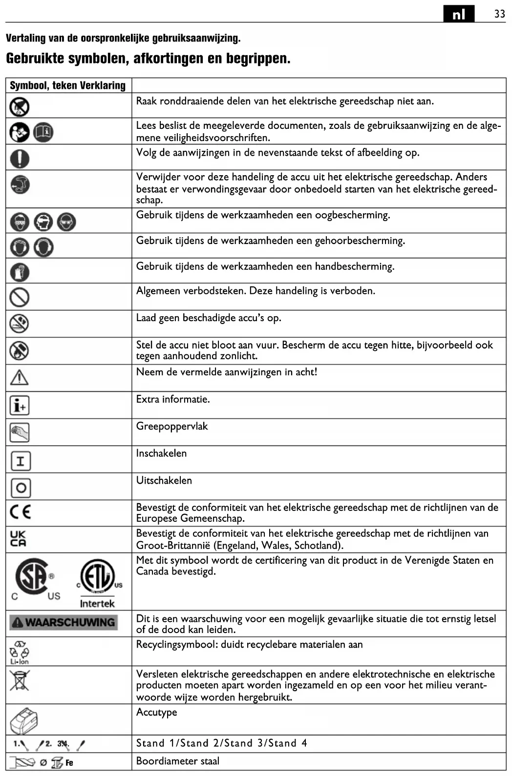 Vertaling van de oorspronkelijke gebruiksaanwijzing. Gebruikte symbolen, afkortingen en begrippen. Symbool, teken Verklaring Raak ronddraaiende delen van het elektrische gereedschap niet aan. Lees beslist de meegeleverde documenten, zoals de gebruiksaanwijzing en de alge- mene veiligheidsvoorschriften. Volg de aanwijzingen in de nevenstaande tekst of afbeelding op. Verwijder voor deze handeling de accu uit het elektrische gereedschap. Anders bestaat er verwondingsgevaar door onbedoeld starten van het elektrische gereed- schap. Gebruik tijdens de werkzaamheden een oogbescherming. Gebruik tijdens de werkzaamheden een gehoorbescherming. Gebruik tijdens de werkzaamheden een handbescherming. Algemeen verbodsteken. Deze handeling is verboden. Laad geen beschadigde accu’s op. Stel de accu niet bloot aan vuur. Bescherm de accu tegen hitte, bijvoorbeeld ook tegen aanhoudend zonlicht. Neem de vermelde aanwijzingen in acht! Extra informatie. Greepoppervlak Inschakelen Uitschakelen Bevestigt de conformiteit van het elektrische gereedschap met de richtlijnen van de Europese Gemeenschap. Bevestigt de conformiteit van het elektrische gereedschap met de richtlijnen van Groot-Brittannië (Engeland, Wales, Schotland). Met dit symbool wordt de certificering van dit product in de Verenigde Staten en Canada bevestigd. Dit is een waarschuwing voor een mogelijk gevaarlijke situatie die tot ernstig letsel of de dood kan leiden. Recyclingsymbool: duidt recyclebare materialen aan Versleten elektrische gereedschappen en andere elektrotechnische en elektrische producten moeten apart worden ingezameld en op een voor het milieu verant- woorde wijze worden hergebruikt. Accutype Stand 1/Stand 2/Stand 3/Stand 4 Boordiameter staal
