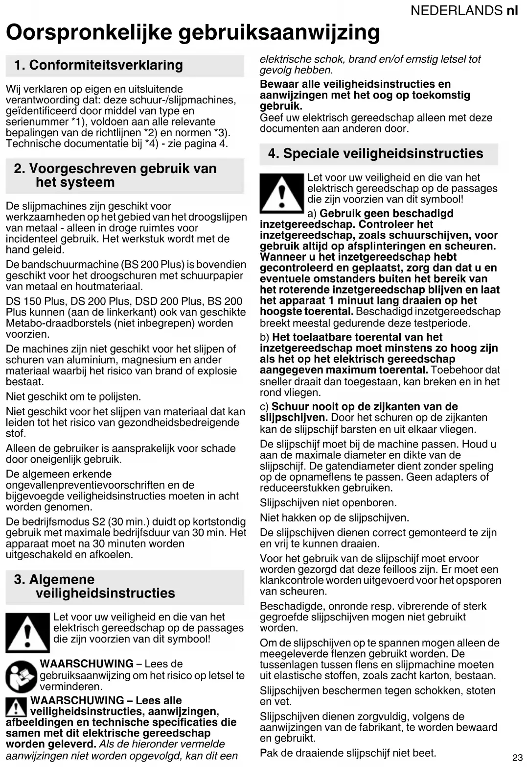 Oorspronkelijke gebruiksaanwijzing Wij verklaren op eigen en uitsluitende verantwoording dat: deze schuur-/slijpmachines, geïdentificeerd door middel van type en serienummer *1), voldoen aan alle relevante bepalingen van de richtlijnen *2) en normen *3). Technische documentatie bij *4) - zie pagina 4. De slijpmachines zijn geschikt voor werkzaamheden op het gebied van het droogslijpen van metaal - alleen in droge ruimtes voor incidenteel gebruik. Het werkstuk wordt met de hand geleid. De bandschuurmachine (BS 200 Plus) is bovendien geschikt voor het droogschuren met schuurpapier van metaal en houtmateriaal. DS 150 Plus, DS 200 Plus, DSD 200 Plus, BS 200 Plus kunnen (aan de linkerkant) ook van geschikte Metabo-draadborstels (niet inbegrepen) worden voorzien. De machines zijn niet geschikt voor het slijpen of schuren van aluminium, magnesium en ander materiaal waarbij het risico van brand of explosie bestaat. Niet geschikt om te polijsten. Niet geschikt voor het slijpen van materiaal dat kan leiden tot het risico van gezondheidsbedreigende stof. Alleen de gebruiker is aansprakelijk voor schade door oneigenlijk gebruik. De algemeen erkende ongevallenpreventievoorschriften en de bijgevoegde veiligheidsinstructies moeten in acht worden genomen. De bedrijfsmodus S2 (30 min.) duidt op kortstondig gebruik met maximale bedrijfsduur van 30 min. Het apparaat moet na 30 minuten worden uitgeschakeld en afkoelen. Let voor uw veiligheid en die van het elektrisch gereedschap op de passages die zijn voorzien van dit symbool! WAARSCHUWING – Lees de gebruiksaanwijzing om het risico op letsel te verminderen. WAARSCHUWING – Lees alle veiligheidsinstructies, aanwijzingen, afbeeldingen en technische specificaties die samen met dit elektrische gereedschap worden geleverd. Als de hieronder vermelde aanwijzingen niet worden opgevolgd, kan dit een elektrische schok, brand en/of ernstig letsel tot gevolg hebben. Bewaar alle veiligheidsinstructies en aanwijzingen met het oog op toekomstig gebruik. Geef uw elektrisch gereedschap alleen met deze documenten aan anderen door. Let voor uw veiligheid en die van het elektrisch gereedschap op de passages die zijn voorzien van dit symbool! a) Gebruik geen beschadigd inzetgereedschap. Controleer het inzetgereedschap, zoals schuurschijven, voor gebruik altijd op afsplinteringen en scheuren. Wanneer u het inzetgereedschap hebt gecontroleerd en geplaatst, zorg dan dat u en eventuele omstanders buiten het bereik van het roterende inzetgereedschap blijven en laat het apparaat 1 minuut lang draaien op het hoogste toerental. Beschadigd inzetgereedschap breekt meestal gedurende deze testperiode. b) Het toelaatbare toerental van het inzetgereedschap moet minstens zo hoog zijn als het op het elektrisch gereedschap aangegeven maximum toerental. Toebehoor dat sneller draait dan toegestaan, kan breken en in het rond vliegen. c) Schuur nooit op de zijkanten van de slijpschijven. Door het schuren op de zijkanten kan de slijpschijf barsten en uit elkaar vliegen. De slijpschijf moet bij de machine passen. Houd u aan de maximale diameter en dikte van de slijpschijf. De gatendiameter dient zonder speling op de opnameflens te passen. Geen adapters of reduceerstukken gebruiken. Slijpschijven niet openboren. Niet hakken op de slijpschijven. De slijpschijven dienen correct gemonteerd te zijn en vrij te kunnen draaien. Voor het gebruik van de slijpschijf moet ervoor worden gezorgd dat deze feilloos zijn. Er moet een klankcontrole worden uitgevoerd voor het opsporen van scheuren. Beschadigde, onronde resp. vibrerende of sterk gegroefde slijpschijven mogen niet gebruikt worden. Om de slijpschijven op te spannen mogen alleen de meegeleverde flenzen gebruikt worden. De tussenlagen tussen flens en slijpmachine moeten uit elastische stoffen, zoals zacht karton, bestaan. Slijpschijven beschermen tegen schokken, stoten en vet. Slijpschijven dienen zorgvuldig, volgens de aanwijzingen van de fabrikant, te worden bewaard en gebruikt. Pak de draaiende slijpschijf niet beet.