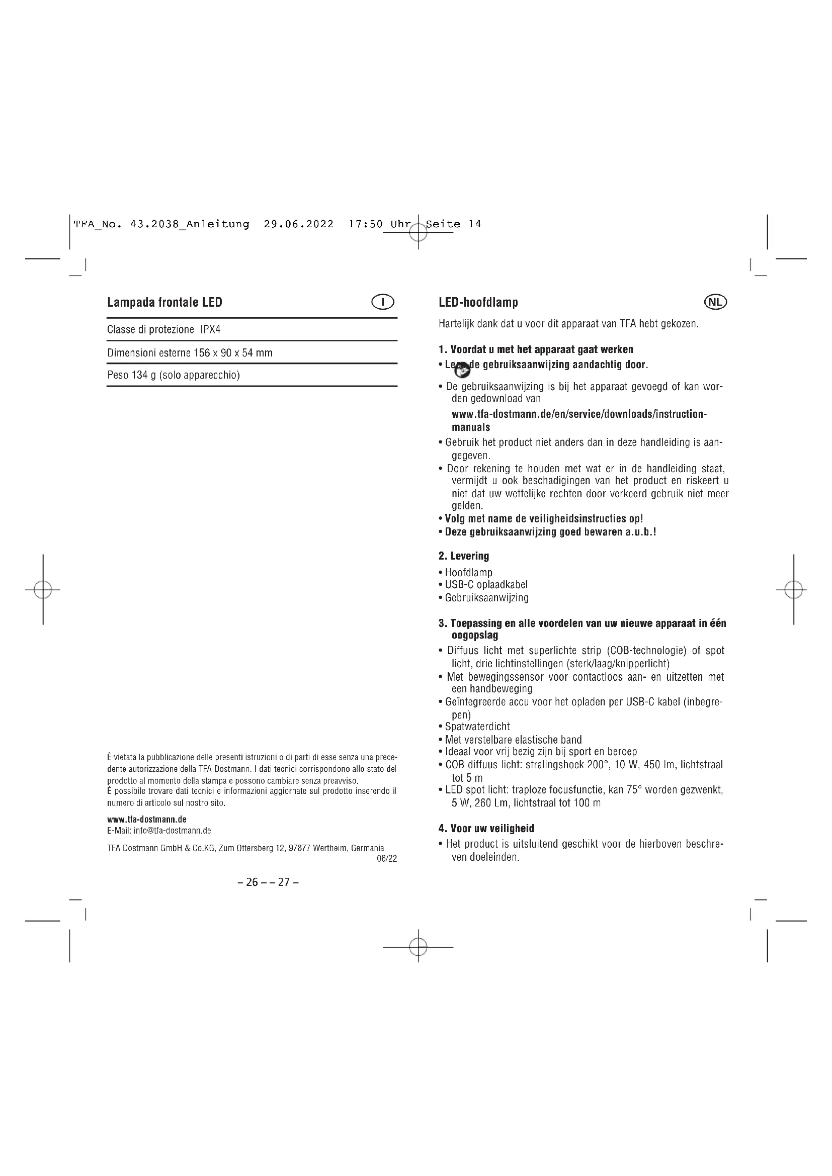 - Het product is uitsluitend geschikt voor de hierboven beschre- ven doeleinden. TFA_No. 43.2038_Anleitung 29.06.2022 17:50 Uhr Seite 14– 28 – – 29 – LED-hoofdlamp