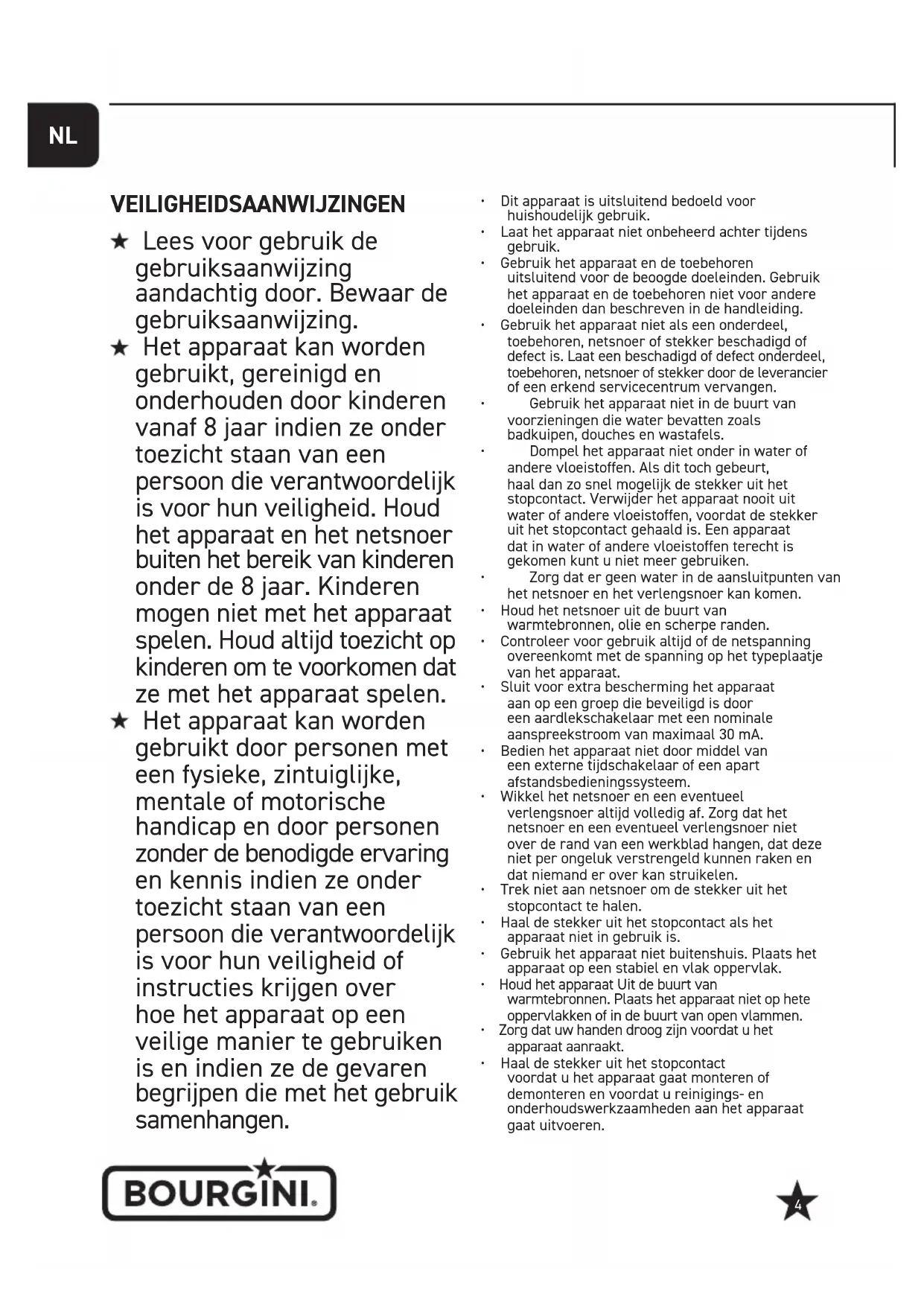 Garantie wordt verleend gedurende 2 jaar vanaf de aankoop datum volgens de kassabon, welke tevens het garantiebewijs is. Voor garantie wendt u zich tot de winkelier. Geen garantie voor defecten welke het gevolg zijn van verkeerd gebruik, ondeskundige demontage, schade door vallen, stoten e.d. en schade door niet tijdig ontkalken van apparaten welke met water worden gebruikt. Indien bij een bepaald product specifieke garantievoorwaarden worden vermeld, hebben deze prioriteit boven de algemene voorwaarden. De garantie is niet van toepassing op gevolgschade. Voor vragen over het gebruik van het product kunt u onze website raadplegen www.bourgini.com. DISCLAIMER Wijzigingen voorbehouden; specificaties kunnen zonder opgave van redenen worden gewijzigd. NL9 SAFETY INSTRUCTIONS Read these instructions carefully before use and keep them in a safe place. This appliance may be used, cleaned and serviced by children older than 8 years of age provided they are supervised by a person responsible for their safety. Keep the appliance and the power cord away from children younger than 8. Children are not allowed to play with the appliance. Children should always be monitored to prevent them from playing with the appliance. The appliance may be used by persons with a physical, sensory, mental or motor disability and by persons without the necessary experience and knowledge, provided they are supervised by a person responsible for their safety, or when they are given instructions on how to safely use the appliance and if understand the dangers that come with the use of the appliance.