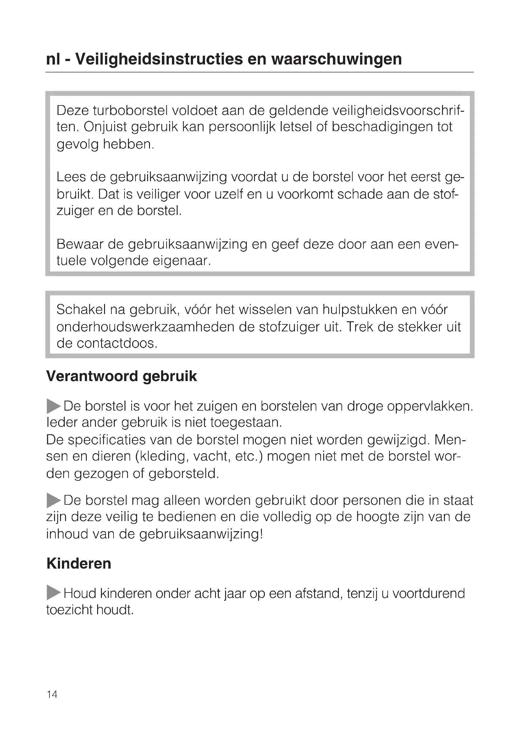 Houd kinderen onder acht jaar op een afstand, tenzij u voortdurend toezicht houdt. nl - Veiligheidsinstructies en waarschuwingen 14~ Kinderen vanaf acht jaar mogen de stofzuiger en de borstel alleen zonder toezicht gebruiken als ze weten hoe ze deze veilig moeten be