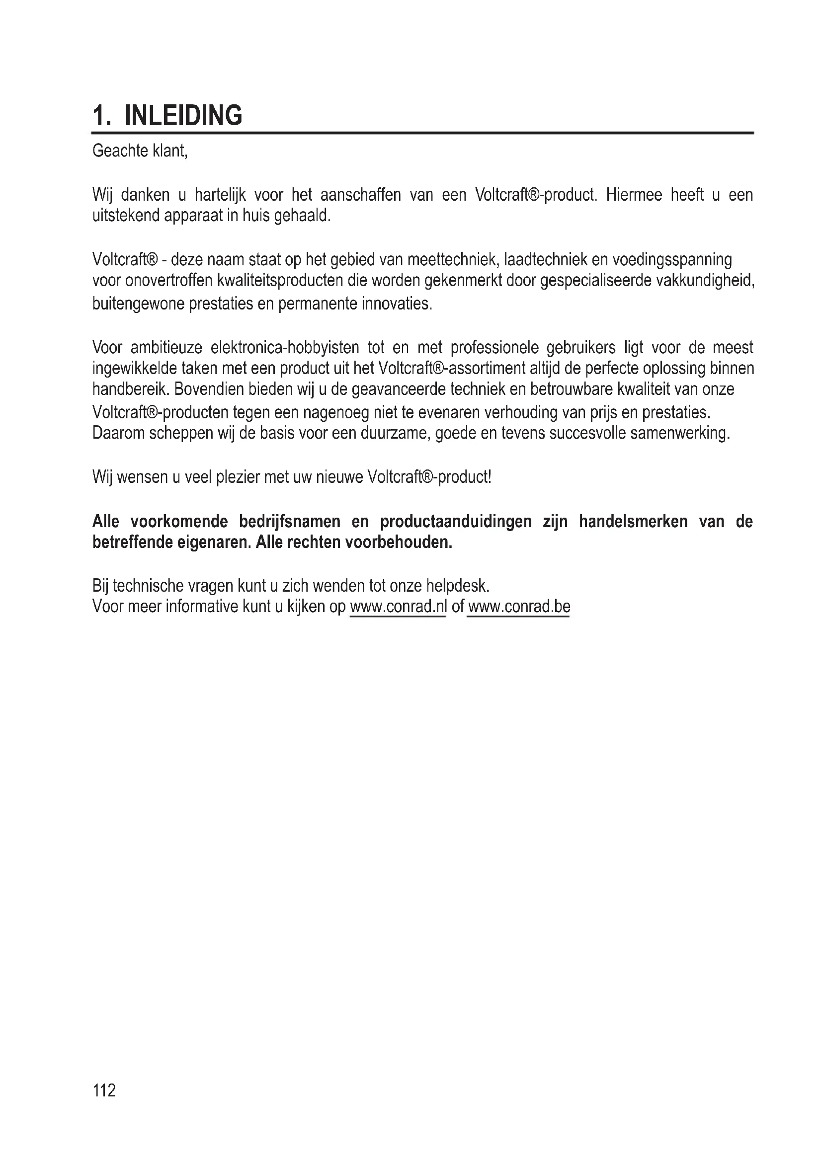 Geachte klant, Wij danken u hartelijk voor het aanschaffen van een Voltcraft®-product. Hiermee heeft u een uitstekend apparaat in huis gehaald. Voltcraft® - deze naam staat op het gebied van meettechniek, laadtechniek en voedingsspanning voor onovertroffen kwaliteitsproducten die worden gekenmerkt door gespecialiseerde vakkundigheid, buitengewone prestaties en permanente innovaties. Voor ambitieuze elektronica-hobbyisten tot en met professionele gebruikers ligt voor de meest ingewikkelde taken met een product uit het Voltcraft®-assortiment altijd de perfecte oplossing binnen handbereik. Bovendien bieden wij u de geavanceerde techniek en betrouwbare kwaliteit van onze Voltcraft®-producten tegen een nagenoeg niet te evenaren verhouding van prijs en prestaties. Daarom scheppen wij de basis voor een duurzame, goede en tevens succesvolle samenwerking. Wij wensen u veel plezier met uw nieuwe Voltcraft®-product! Alle voorkomende bedrijfsnamen en productaanduidingen zijn handelsmerken van de betreffende eigenaren. Alle rechten voorbehouden. Bij technische vragen kunt u zich wenden tot onze helpdesk. Voor meer informative kunt u kijken op www.conrad.nl of www.conrad.be113