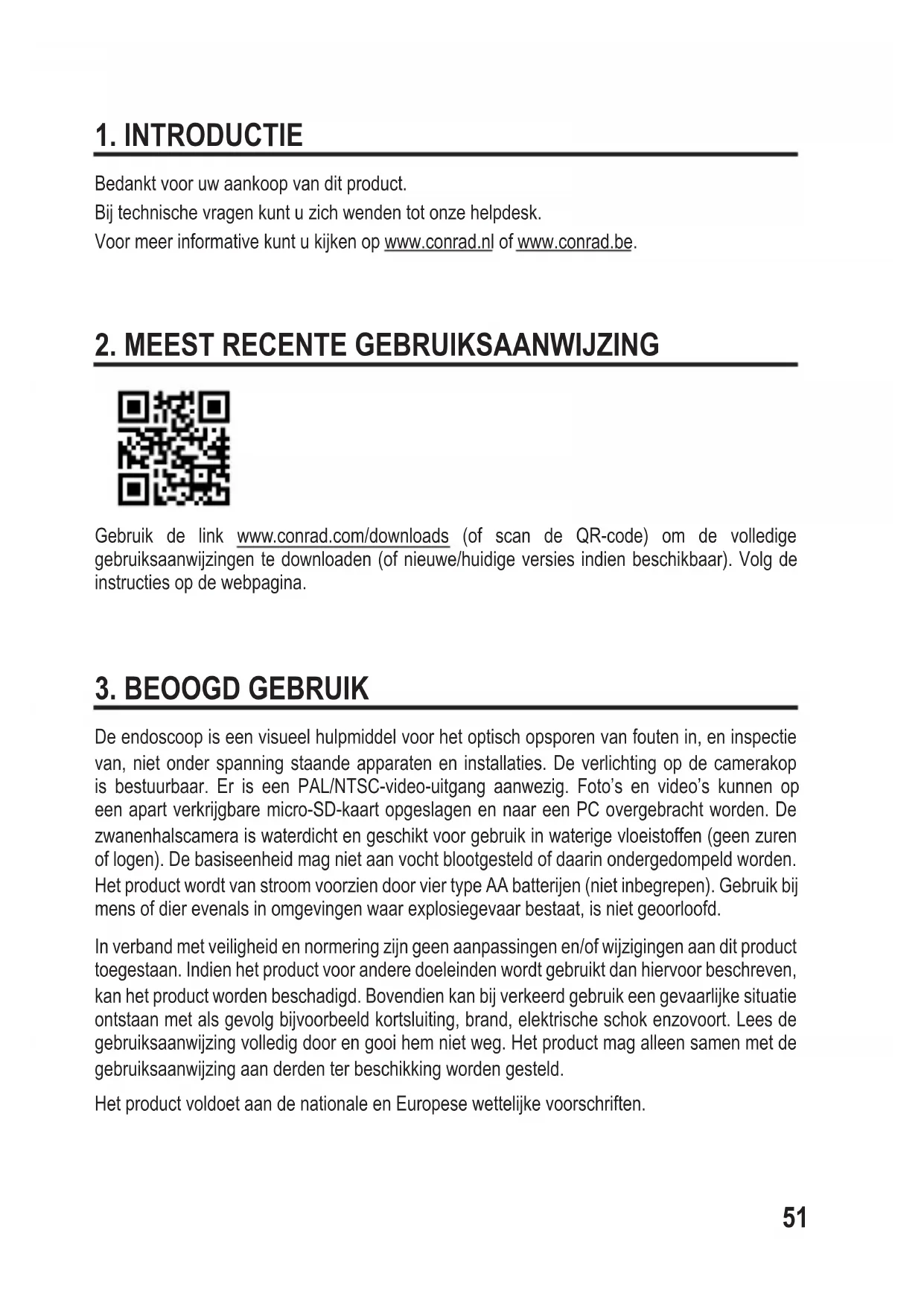 De endoscoop is een visueel hulpmiddel voor het optisch opsporen van fouten in, en inspectie van, niet onder spanning staande apparaten en installaties. De verlichting op de camerakop is bestuurbaar. Er is een PAL/NTSC-video-uitgang aanwezig. Foto’s en video’s kunnen op een apart verkrijgbare micro-SD-kaart opgeslagen en naar een PC overgebracht worden. De zwanenhalscamera is waterdicht en geschikt voor gebruik in waterige vloeistoffen (geen zuren of logen). De basiseenheid mag niet aan vocht blootgesteld of daarin ondergedompeld worden. Het product wordt van stroom voorzien door vier type AA batterijen (niet inbegrepen). Gebruik bij mens of dier evenals in omgevingen waar explosiegevaar bestaat, is niet geoorloofd. In verband met veiligheid en normering zijn geen aanpassingen en/of wijzigingen aan dit product toegestaan. Indien het product voor andere doeleinden wordt gebruikt dan hiervoor beschreven, kan het product worden beschadigd. Bovendien kan bij verkeerd gebruik een gevaarlijke situatie ontstaan met als gevolg bijvoorbeeld kortsluiting, brand, elektrische schok enzovoort. Lees de gebruiksaanwijzing volledig door en gooi hem niet weg. Het product mag alleen samen met de gebruiksaanwijzing aan derden ter beschikking worden gesteld. Het product voldoet aan de nationale en Europese wettelijke voorschriften.52