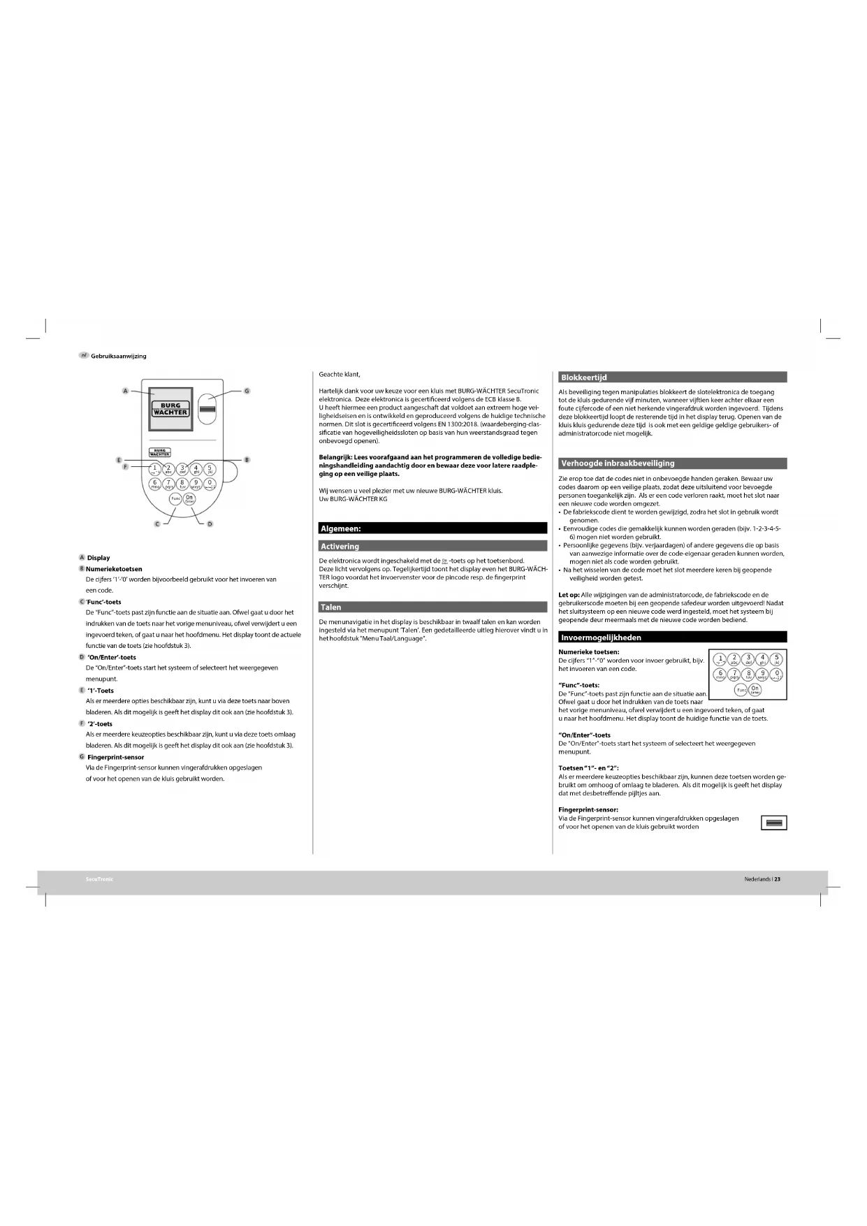 -toets op het toetsenbord. Deze licht vervolgens op. Tegelijkertijd toont het display even het BURG-WÄCH- TER logo voordat het invoervenster voor de pincode resp. de ngerprint verschijnt. De menunavigatie in het display is beschikbaar in twaalf talen en kan worden ingesteld via het menupunt ’Talen’. Een gedetailleerde uitleg hierover vindt u in het hoofdstuk “Menu Taal/Language”. Algemeen: Blokkeertijd Verhoogde inbraakbeveiliging Als beveiliging tegen manipulaties blokkeert de slotelektronica de toegang tot de kluis gedurende vijf minuten, wanneer vijftien keer achter elkaar een foute cijfercode of een niet herkende vingerafdruk worden ingevoerd. Tijdens deze blokkeertijd loopt de resterende tijd in het display terug. Openen van de kluis kluis gedurende deze tijd is ook met een geldige geldige gebruikers- of administratorcode niet mogelijk. Zie erop toe dat de codes niet in onbevoegde handen geraken. Bewaar uw codes daarom op een veilige plaats, zodat deze uitsluitend voor bevoegde personen toegankelijk zijn. Als er een code verloren raakt, moet het slot naar een nieuwe code worden omgezet.