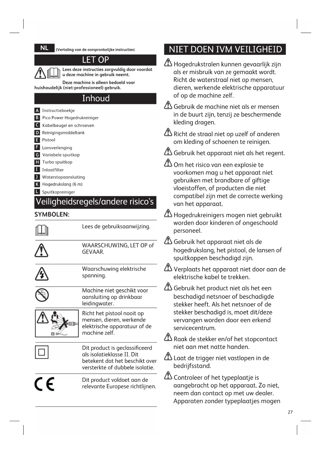 Spuitkopreiniger Veiligheidsregels/andere risico's SYMBOLEN: Lees de gebruiksaanwijzing. WAARSCHUWING, LET OP of GEVAAR. Waarschuwing elektrische spanning. Machine niet geschikt voor aansluiting op drinkbaar leidingwater. Richt het pistool nooit op mensen, dieren, werkende elektrische apparatuur of de machine zelf. Dit product is geclassificeerd als isolatieklasse II. Dit betekent dat het beschikt over versterkte of dubbele isolatie. Dit product voldoet aan de relevante Europese richtlijnen.