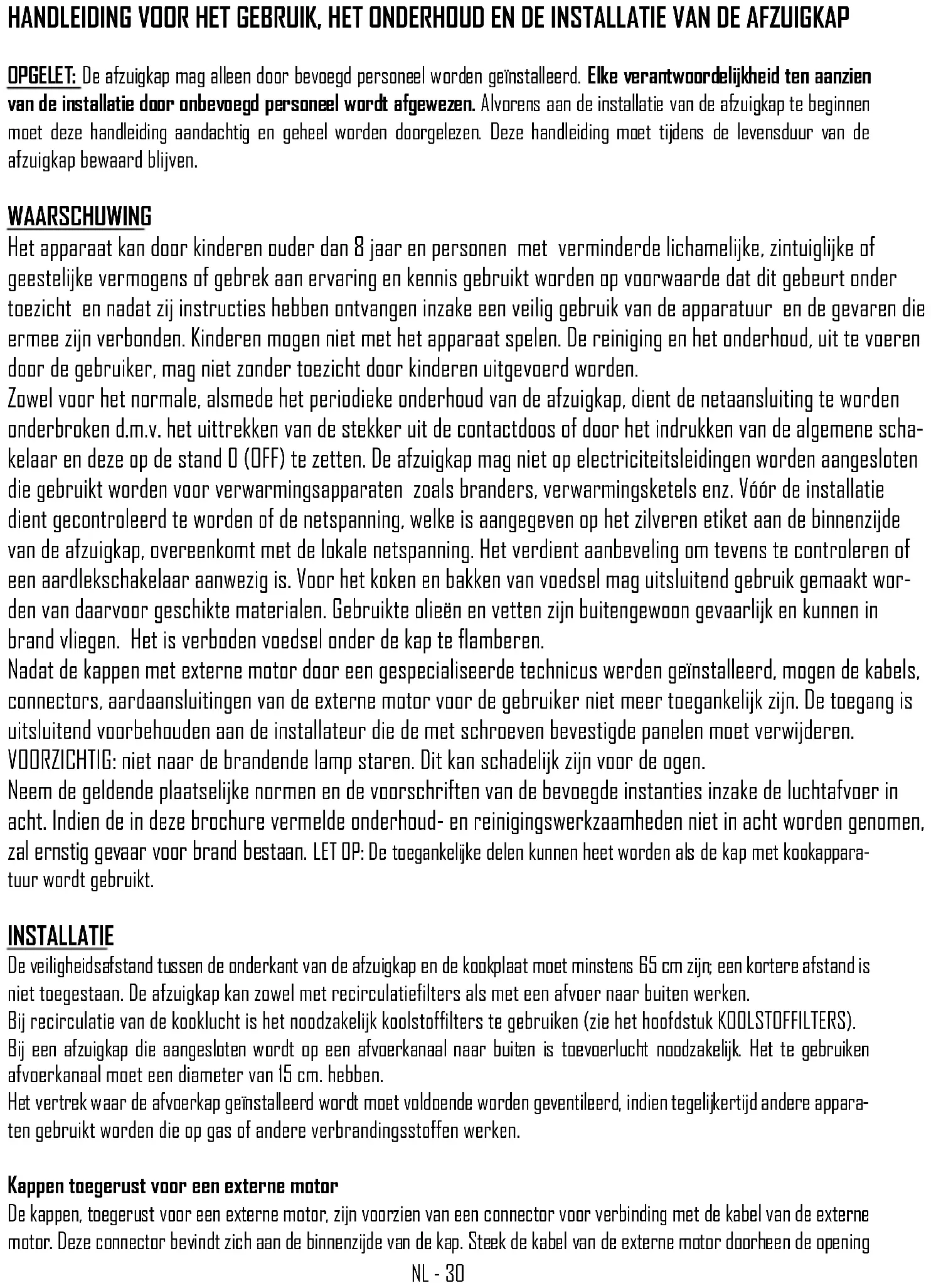 Avant d’effectuer toute intervention de nettoyage et de maintenance, couper l’alimentation de la hotte en mettant l'interrupteur général en position 0 (OFF). Remplacement des lampes Spot à led : Le spot ne doit être remplacé que par des techniciens qualifiés et uniquement en utilisant des pièces de rechange originales. Nettoyage des filtres métalliques Les filtres métalliques en dotation avec la hotte doivent être lavés tous les 2-3 mois en fonction de l'intensité d’utilisation, avec de l’eau chaude et du détergent liquide non agressif. Les filtres métalliques doivent être enlevés en utilisant la poignée spéciale en décrochant en premier le filtre dans la partie avant en le tirant vers le bas. Filtres au carbone Si la hotte est utilisée avec système filtrant avec recyclage interne, il est nécessaire d’employer des filtres au carbone qui contiennent du carbone actif. Le carbone actif contenu dans les filtres, sert à retenir les odeurs des fumées de cuisine. Pour l’enlèvement et le remplacement des filtres faire réf. à la fig Les filtres au carbone en POLYESTER ne peuvent pas être régénérés ou lavés et doivent être remplacés périodiquement (tous les 4 mois si on utilise la hotte pendant deux heures par jour). Les filtres saturés de graisses peuvent en effet être cause d’incendies. Sur la base du modèle de hotte, les filtres au carbone peuvent être de forme circulaire ou bien rectangu- laire.FR - 29 Le filtre à charbon LONG LIFE peut être nettoyé et reutilize. Le filtre doit être nettoyé tous les deux mois en utilization norma- le. II est recommandé de nettoyer le filtre dans un lave-vaisselle, à la température maximum ; utiliser un détergent normal. Aucun ustensile ménager ne doit être présent dans le lave – vaisselle lors du nettoyage du filtre, afin d’éviter tout dépôt de particules d’aliments qui risqueraient de causer ultérieurement de mauvaises odeurs. Pour réactiver le charbon, il suffit de mettre le filtre à sacher au four. Régler le four sur chaleur normale (pas sur “Gril”), à une temperature maximum de 100 °, et y laisser le filtre pendant 10 minutes. Une fois le filtre refroidi, remettez-le dans la hotte. Le filtre doit être remplacé quand il n’est plus en mesure d’absorber de façon satisfaisante les odeurs de cuisson. Condensation dans la hotte Les plaques à induction ou vitrocéramique réchauffent la nourriture très rapidement en produisant de la vapeur avec la cuisson avant que la surface en verre ou en acier de la hotte ne se soit réchauffée. Ce qui provoque de la condensation sur la hotte avec comme conséquence la formation de gouttes d’eau. Une autre cause de la condensation pourrait être le fait que le conduit de sortie des fumées ne correspond pas aux dimensions que nous avons conseillé (voir paragraphe INSTALLATION). La vapeur qui reste dans la hotte pendant le refroidissement se condense en produisant des gouttes d’eau. Il est conseillé d'allumer la hotte dix minutes avant de commencer à cuisiner et, après avoir terminé, de la laisser allumée pour que toutes les fumées qui se sont accumulées dans le conduit puissent s’échapper. En outre il est très important de nettoyer régulièrement les filtres et, en cas de détérioration, de les remplacer (voir NET- TOYAGE des FILTRES MÉTALLIQUES). Nettoyage de la hotte Le nettoyage périodique des surfaces permet d'éviter de devoir par la suite éliminer avec beaucoup de difficulté des dépôts de salissures incrustées. Si la hotte est peinte ou cuivrée, utiliser un chiffon souple avec de l’eau tiède et un détergent neutre. Il est interdit de verser des liquides directement sur la hotte et d’utiliser des produits granuleux et/ou abrasifs. Si la hotte est en acier inox, utiliser des produits et des chiffons spéciaux pour l’acier inox satiné (non abrasifs et/ou corrosifs et sans chlore), en ayant soin de suivre avec le chiffon le sens du satinage. Ne pas utiliser de produits agressifs, dissolvants chimiques ou dérivés de distillats de pétrole qui pourraient laisser des résidus huileux susceptibles d’oxydation et de polymé- risation. La firme constructrice ne répond pas de dommages esthétiques causés par la non observation des indications énumérées ci-dessus.NL - 30 HANDLEIDING VOOR HET GEBRUIK, HET ONDERHOUD EN DE INSTALLATIE VAN DE AFZUIGKAP OPGELET: De afzuigkap mag alleen door bevoegd personeel worden geïnstalleerd. Elke verantwoordelijkheid ten aanzien van de installatie door onbevoegd personeel wordt afgewezen. Alvorens aan de installatie van de afzuigkap te beginnen moet deze handleiding aandachtig en geheel worden doorgelezen. Deze handleiding moet tijdens de levensduur van de afzuigkap bewaard blijven. WAARSCHUWING Het apparaat kan door kinderen ouder dan 8 jaar en personen met verminderde lichamelijke, zintuiglijke of geestelijke vermogens of gebrek aan ervaring en kennis gebruikt worden op voorwaarde dat dit gebeurt onder toezicht en nadat zij instructies hebben ontvangen inzake een veilig gebruik van de apparatuur en de gevaren die ermee zijn verbonden. Kinderen mogen niet met het apparaat spelen. De reiniging en het onderhoud, uit te voeren door de gebruiker, mag niet zonder toezicht door kinderen uitgevoerd worden. Zowel voor het normale, alsmede het periodieke onderhoud van de afzuigkap, dient de netaansluiting te worden onderbroken d.m.v. het uittrekken van de stekker uit de contactdoos of door het indrukken van de algemene scha- kelaar en deze op de stand 0 (OFF) te zetten. De afzuigkap mag niet op electriciteitsleidingen worden aangesloten die gebruikt worden voor verwarmingsapparaten zoals branders, verwarmingsketels enz. Vóór de installatie dient gecontroleerd te worden of de netspanning, welke is aangegeven op het zilveren etiket aan de binnenzijde van de afzuigkap, overeenkomt met de lokale netspanning. Het verdient aanbeveling om tevens te controleren of een aardlek