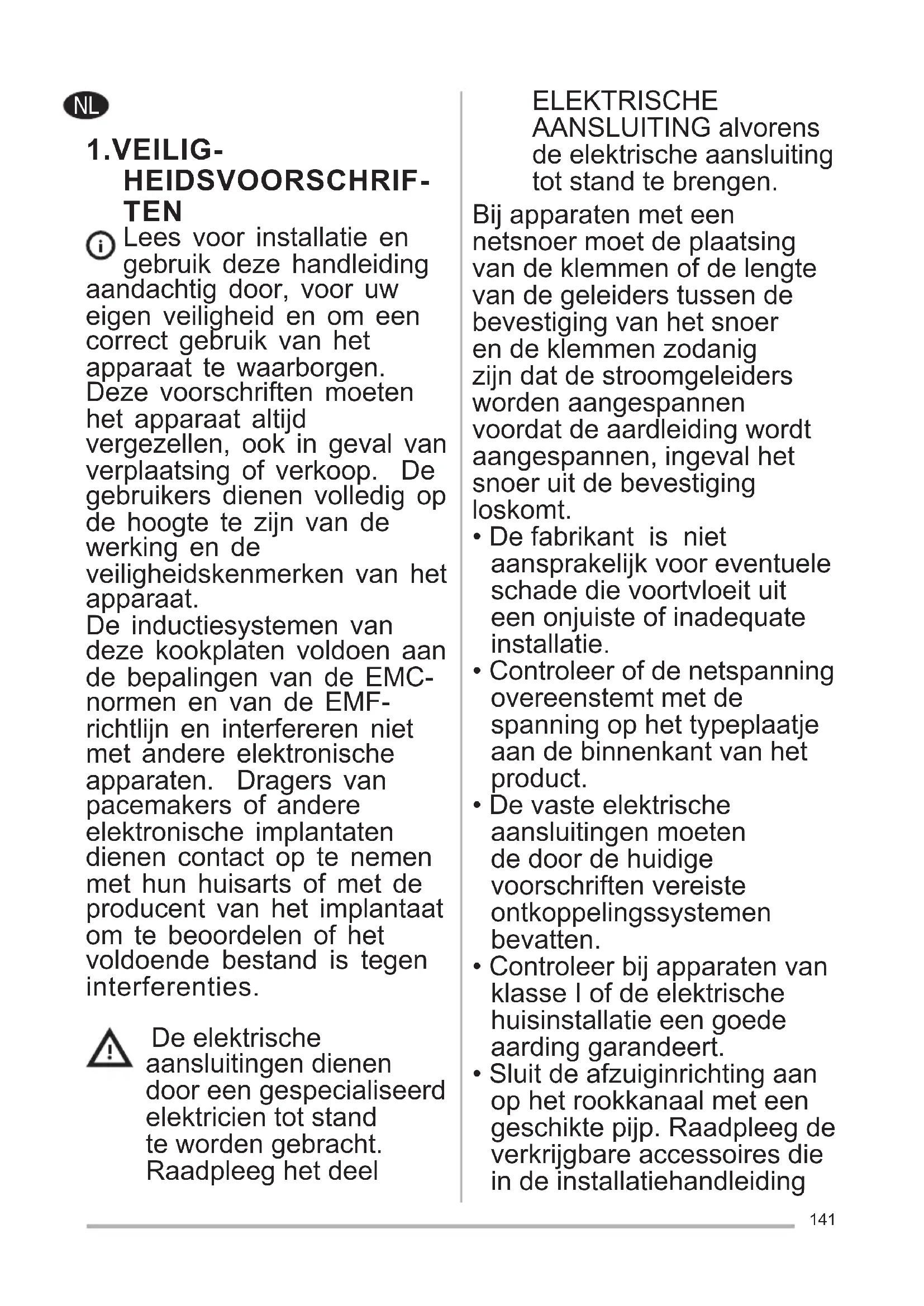 HEIDSVOORSCHRIF- TEN Lees voor installatie en gebruik deze handleiding aandachtig door, voor uw eigen veiligheid en om een correct gebruik van het apparaat te waarborgen. Deze voorschriften moeten het apparaat altijd vergezellen, ook in geval van verplaatsing of verkoop. De gebruikers dienen volledig op de hoogte te zijn van de werking en de veiligheidskenmerken van het apparaat. De inductiesystemen van deze kookplaten voldoen aan de bepalingen van de EMC- normen en van de EMF- richtlijn en interfereren niet met andere elektronische apparaten. Dragers van pacemakers of andere elektronische implantaten dienen contact op te nemen met hun huisarts of met de producent van het implantaat om te beoordelen of het voldoende bestand is tegen interferenties. De elektrische aansluitingen dienen door een gespecialiseerd elektricien tot stand te worden gebracht. Raadpleeg het deel ELEKTRISCHE AANSLUITING alvorens de elektrische aansluiting tot stand te brengen. Bij apparaten met een netsnoer moet de plaatsing van de klemmen of de lengte van de geleiders tussen de bevestiging van het snoer en de klemmen zodanig zijn dat de stroomgeleiders worden aangespannen voordat de aardleiding wordt aangespannen, ingeval het snoer uit de bevestiging loskomt.