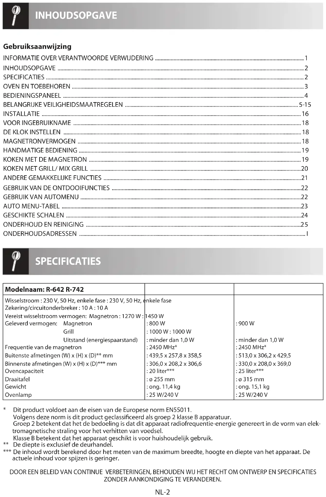 - Dit product voldoet aan de eisen van de Europese norm EN55011. Volgens deze norm is dit product geclassi ceerd als groep 2 klasse B apparatuur. Groep 2 betekent dat het de bedoeling is dat dit apparaat radiofrequentie-energie genereert in de vorm van elek- tromagnetische straling voor het verhitten van voedsel. Klasse B betekent dat het apparaat geschikt is voor huishoudelijk gebruik. ** De diepte is exclusief de deurhandel. *** De inhoud wordt berekend door het meten van de maximum breedte, hoogte en diepte van het apparaat. De actuele inhoud voor spijzen is geringer. DOOR EEN BELEID VAN CONTINUE VERBETERINGEN, BEHOUDEN WIJ HET RECHT OM ONTWERP EN SPECIFICATIES ZONDER AANKONDIGING TE VERANDEREN.