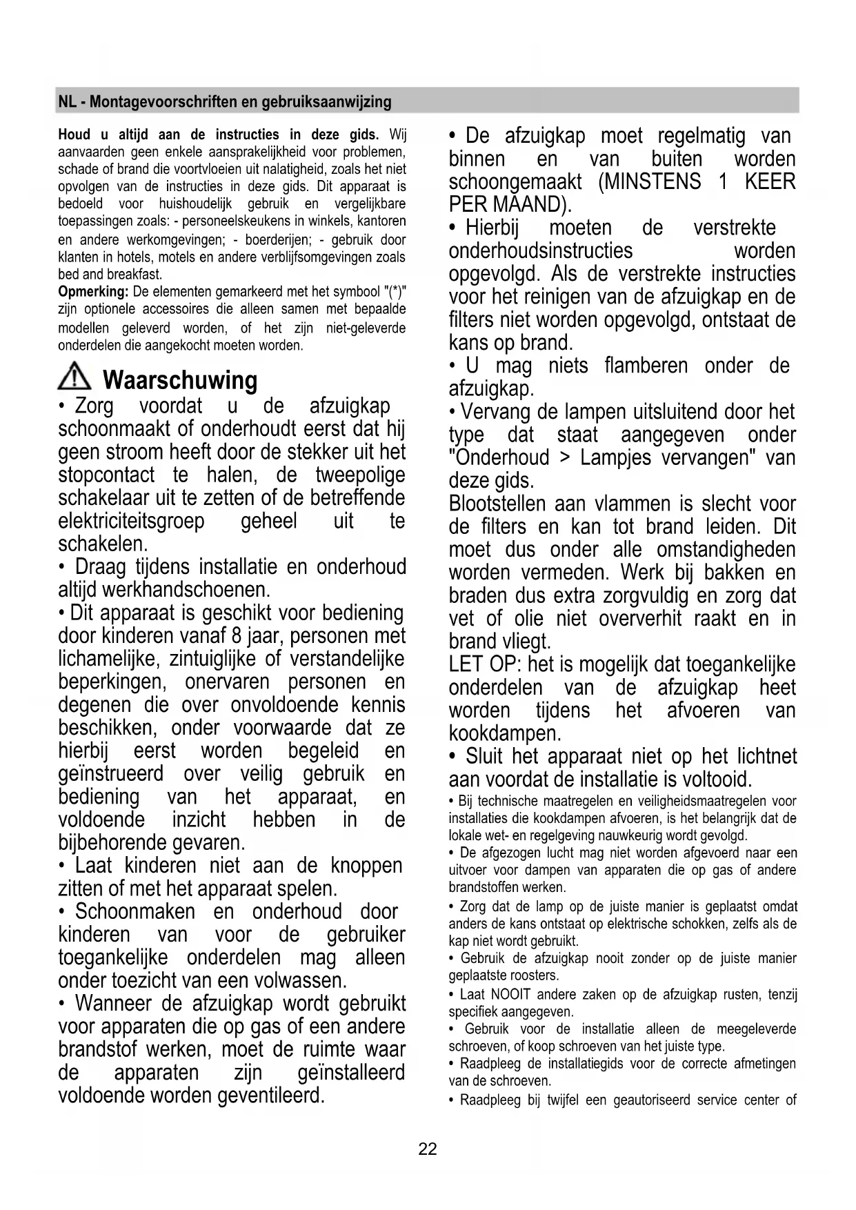 - Hierbij moeten de verstrekte onderhoudsinstructies worden opgevolgd. Als de verstrekte instructies voor het reinigen van de afzuigkap en de filters niet worden opgevolgd, ontstaat de kans op brand.