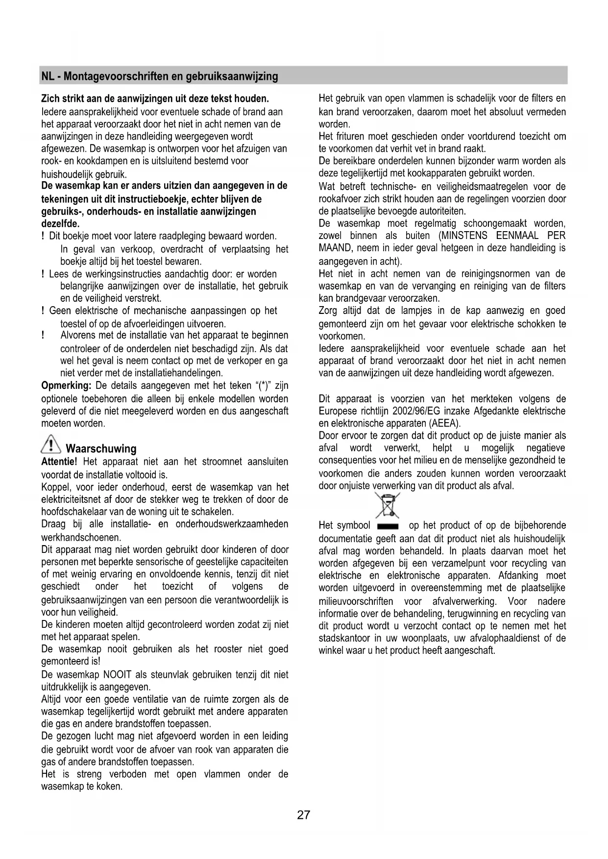 Dans l’éventualité où l’éclairage ne devait pas fonctionner, vérifier si les lampes ont été introduites correctement dans leur logement, avant de contacter le service après-vente. - Modèle avec lampes LED La hotte est dotée d’un système d’éclairage basé sur la technologie LED. Les LEDS garantissent un éclairage optimal, une durée jusqu’à 10 fois supérieures aux ampoules traditionnelles et permettent une épargne de 90% en énergie électrique. Pour le remplacement, s’adresser au service d’assistance technique.27 NL - Montagevoorschriften en gebruiksaanwijzing Zich strikt aan de aanwijzingen uit deze tekst houden. Iedere aansprakelijkheid voor eventuele schade of brand aan het apparaat veroorzaakt door het niet in acht nemen van de aanwijzingen in deze handleiding weergegeven wordt afgewezen. De wasemkap is ontworpen voor het afzuigen van rook- en kookdampen en is uitsluitend bestemd voor huishoudelijk gebruik. De wasemkap kan er anders uitzien dan aangegeven in de tekeningen uit dit instructieboekje, echter blijven de gebruiks-, onderhouds- en installatie aanwijzingen dezelfde. ! Dit boekje moet voor latere raadpleging bewaard worden. In geval van verkoop, overdracht of verplaatsing het boekje altijd bij het toestel bewaren. ! Lees de werkingsinstructies aandachtig door: er worden belangrijke aanwijzingen over de installatie, het gebruik en de veiligheid verstrekt. ! Geen elektrische of mechanische aanpassingen op het toestel of op de afvoerleidingen uitvoeren. ! Alvorens met de installatie van het apparaat te beginnen controleer of de onderdelen niet beschadigd zijn. Als dat wel het geval is neem contact op met de verkoper en ga niet verder met de installatiehandelingen. Opmerking: De details aangegeven met het teken “(*)” zijn optionele toebehoren die alleen bij enkele modellen worden geleverd of die niet meegeleverd worden en dus aangeschaft moeten worden. Waarschuwing Attentie! Het apparaat niet aan het stroomnet aansluiten voordat de installatie voltooid is. Koppel, voor ieder onderhoud, eerst de wasemkap van het elektriciteitsnet af door de stekker weg te trekken of door de hoofdschakelaar van de woning uit te schakelen. Draag bij alle installatie- en onderhoudswerkzaamheden werkhandschoenen. Dit apparaat mag niet worden gebruikt door kinderen of door personen met beperkte sensorische of geestelijke capaciteiten of met weinig ervaring en onvoldoende kennis, tenzij dit niet geschiedt onder het toezicht of volgens de gebruiksaanwijzingen van een persoon die verantwoordelijk is voor hun veiligheid. De kinderen moeten altijd gecontroleerd worden zodat zij niet met het apparaat spelen. De wasemkap nooit gebruiken als het rooster niet goed gemonteerd is! De wasemkap NOOIT als steunvlak gebruiken tenzij dit niet uitdrukkelijk is aangegeven. Altijd voor een goede ventilatie van de ruimte zorgen als de wasemkap tegelijkertijd wordt gebruikt met andere apparaten die gas en andere brandstoffen toepassen. De gezogen lucht mag niet afgevoerd worden in een leiding die gebruikt wordt voor de afvoer van rook van apparaten die gas of andere brandstoffen toepassen. Het is streng verboden met open vlammen onder de wasemkap te koken. Het gebruik van open vlammen is schadelijk voor de filters en kan brand veroorzaken, daarom moet het absoluut vermeden worden. Het frituren moet geschieden onder voortdurend toezicht om te voorkomen dat verhit vet in brand raakt. De bereikbare onderdelen kunnen bijzonder warm worden als deze tegelijkertijd met kookapparaten gebruikt worden. Wat betreft technische- en veiligheidsmaatregelen voor de rookafvoer zich strikt houden aan de regelingen voorzien door de plaatselijke bevoegde autoriteiten. De wasemkap moet regelmatig schoongemaakt worden, zowel binnen als buiten (MINSTENS EENMAAL PER MAAND, neem in ieder geval hetgeen in deze handleiding is aangegeven in acht). Het niet in acht nemen van de reinigingsnormen van de wasemkap en van de vervanging en reiniging van de filters kan brandgevaar veroorzaken. Zorg altijd dat de lampjes in de kap aanwezig en goed gemonteerd zijn om het gevaar voor elektrische schokken te voorkomen. Iedere aansprakelijkheid voor eventuele schade aan het apparaat of brand veroorzaakt door het niet in acht nemen van de aanwijzingen uit deze handleiding wordt afgewezen. Dit apparaat is voorzien van het merkteken volgens de Europese richtlijn 2002/96/EG inzake Afgedankte elektrische en elektronische apparaten (AEEA). Door ervoor te zorgen dat dit product op de juiste manier als afval wordt verwerkt, helpt u mogelijk negatieve consequenties voor het milieu en de menselijke gezondheid te voorkomen die anders zouden kunnen worden veroorzaakt door onjuiste verwerking van dit product als afval. Het symbool op het product of op de bijbehorende documentatie geeft aan dat dit product niet als huishoudelijk afval mag worden behandeld. In plaats daarvan moet het worden afgegeven bij een verzamelpunt voor recycling van elektrische en elektronische apparaten. Afdanking moet worden uitgevoerd in overeenstemming met de plaatselijke milieuvoorschriften voor afvalverwerking. Voor nadere informatie over de behandeling, terugwinning en recycling van dit product wordt u verzocht contact op te nemen met het stadskantoor in uw woonplaats, uw afvalophaaldienst of de winkel waar u het product heeft aangeschaft.28 Het gebruik De kap is vervaardigd voor gebruik in de afzuigversie met afvoer naar buiten, of de filtrerende versie, met luchtcirculatie. Uitvoering als afzuigend apparaat De aangezogen rook en damp worden naar buiten geleid via een afvoerpijp die is aangesloten op de verbindingsring aan de bovenkant van de wasemkap. Attentie: De afvoerpijp wordt hierbij niet geleverd en moet apart aangekocht worden. De middellijn van de afvoerpijp moet even groot zijn als die van de verbindingsring. De horizontale stukken van de buis moeten enigszins omhoog hellen (ongeveer 10°) om de lucht gemakkelijk naar buiten te voeren. Note. Als de wase