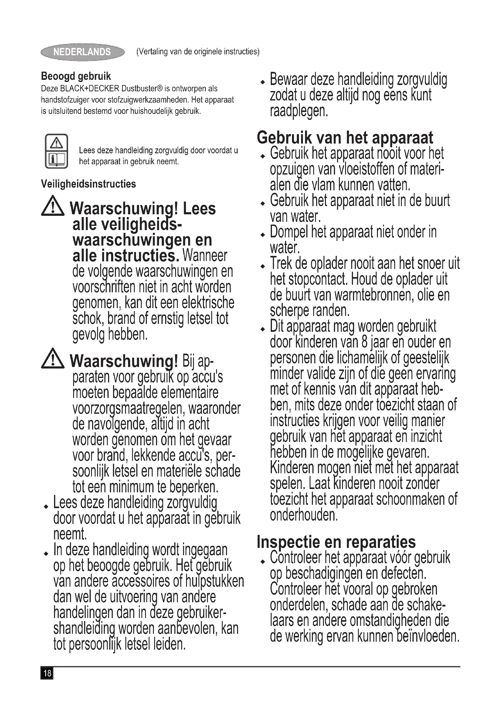Gescheiden inzameling van gebruikte producten en verpakkingsmaterialen maakt het mogelijk materialen te recycleren en opnieuw te gebruiken. Hergebruik van gerecycleerde materialen zorgt voor minder milieuvervuiling en dringt de vraag naar grondstoffen terug. Plaatselijke verordeningen kunnen voorzien in gescheiden inzameling van huishoudelijke elektrische producten via gemeentelijke stortplaatsen of via de leverancier bij wie u een nieuw product aanschaft. BLACK+DECKER biedt de mogelijkheid tot het recyclen van afgedankte BLACK+DECKER-producten. Om gebruik te maken van deze service, dient u het product naar een van onze serv-icecentra te sturen, die de inzameling voor ons verzorgen. U kunt het adres van het dichtstbijzijnde BLACK+DECKER- serv-icecentrum opvragen via de adressen op de achterzijde van deze handleiding. U kunt ook een lijst van BLACK +DECKER-servicecentra en meer informatie m.b.t. onze klantenservice vinden op het volgende internetadres: www.2helpU.com Garantie Black & Decker heeft vertrouwen in haar producten en biedt een uitstekende garantie. Deze garantiebepalingen vormen een aanvulling op uw wettelijke rechten en beperken deze niet. De garantie geldt in de lidstaten van de Europese Unie en de Europese Vrijhandelsassociatie. Mocht uw Black & Decker product binnen 24 maanden na de datum van aankoop defect raken ten gevolge van materi- aal- of constructiefouten, dan garanderen wij de kosteloze vervanging van defecte onderdelen, de reparatie van het product of de vervanging van het product, tenzij: u Het product is gebruikt voor handelsdoeleinden, profes- sionele toepassingen of verhuurdoeleinden. u Het product onoordeelkundig is gebruikt. u Het product is beschadigd door invloeden van buitenaf of door een ongeval. u Reparaties zijn uitgevoerd door anderen dan onze serv- icecentra of Black & Decker-personeel. Om een beroep te doen op de garantie, dient u een aankoopbewijs te overhandigen aan de verkoper of een van onze servicecentra. U kunt het adres van het dichtstbijzijnde Black & Decker-servicecentrum opvragen via de adressen op de achterzijde van deze handleiding. U kunt ook een lijst van Black & Decker-servicecentra en meer informatie m.b.t. onze klantenservice vinden op het volgende internetadres: www.2helpU.com Meld u aan op onze website www.blackanddecker.nl om te worden geïnformeerd over nieuwe producten en speciale aan- biedingen. Verdere informatie over het merk Black & Decker en onze producten vindt u op www.blackanddecker.nl Vergeet niet uw product te registreren. www.blackanddecker.nl/productregistration Registreer uw product online op www.blackanddecker.nl/productregistration of stuur uw naam, achternaam en productcode naar Black & Decker in uw land.22 (Traducción de las instrucciones originales) ESPAÑOL Uso específico La aspiradora de mano Dustbuster® de BLACK+DECKER se ha diseñado para proporcionar una limpieza mediante aspiración en seco. Este aparato está pensado únicamente para uso doméstico. Lea todo el manual detenidamente antes de utilizar el aparato. Instrucciones de seguridad
