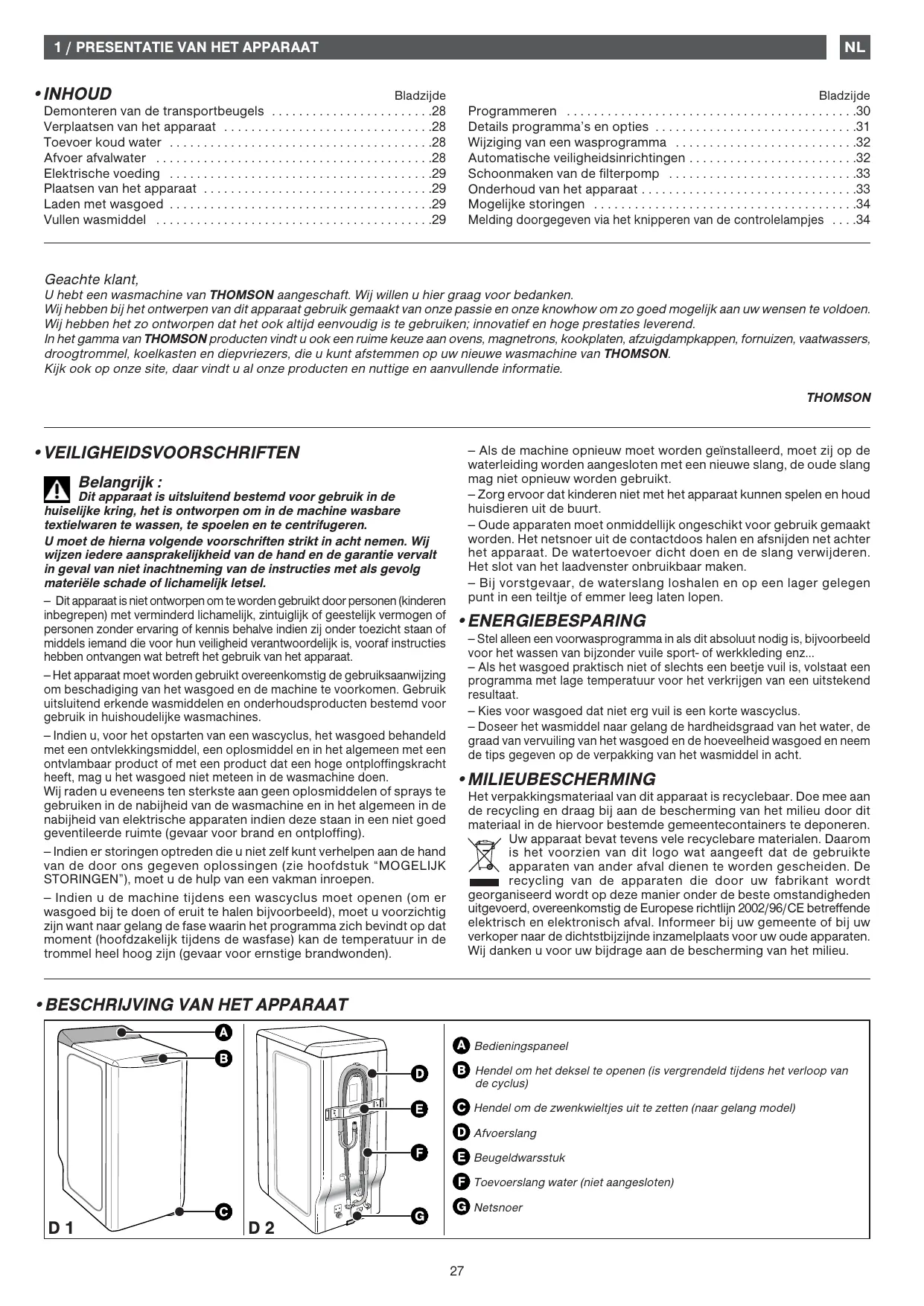 - Melding doorgegeven via het knipperen van de controlelampjes Geachte klant, U hebt een wasmachine van THOMSON aangeschaft. Wij willen u hier graag voor bedanken. Wij hebben bij het ontwerpen van dit apparaat gebruik gemaakt van onze passie en onze knowhow om zo goed mogelijk aan uw wensen te voldoen. Wij hebben het zo ontworpen dat het ook altijd eenvoudig is te gebruiken; innovatief en hoge prestaties leverend. In het gamma van THOMSON producten vindt u ook een ruime keuze aan ovens, magnetrons, kookplaten, afzuigdampkappen, fornuizen, vaatwassers, droogtrommel, koelkasten en diepvriezers, die u kunt afstemmen op uw nieuwe wasmachine van THOMSON. Kijk ook op onze site, daar vindt u al onze producten en nuttige en aanvullende informatie. THOMSON p. 34