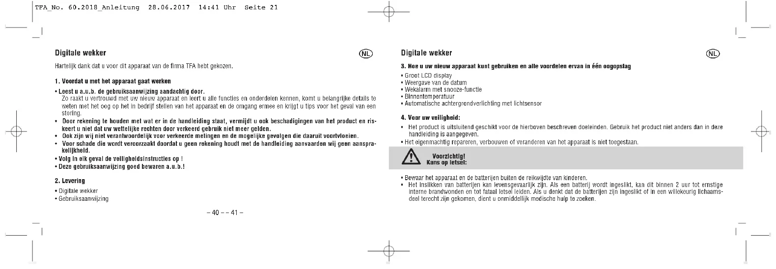 - Het inslikken van batterijen kan levensgevaarlijk zijn. Als een batterij wordt ingeslikt, kan dit binnen 2 uur tot ernstige interne brandwonden en tot fataal letsel leiden. Als u denkt dat de batterijen zijn ingeslikt of in een willekeurig lichaams- deel terecht zijn gekomen, dient u onmiddellijk medische hulp te zoeken. TFA_No. 60.2018_Anleitung 28.06.2017 14:41 Uhr Seite 21– 42 – – 43 –