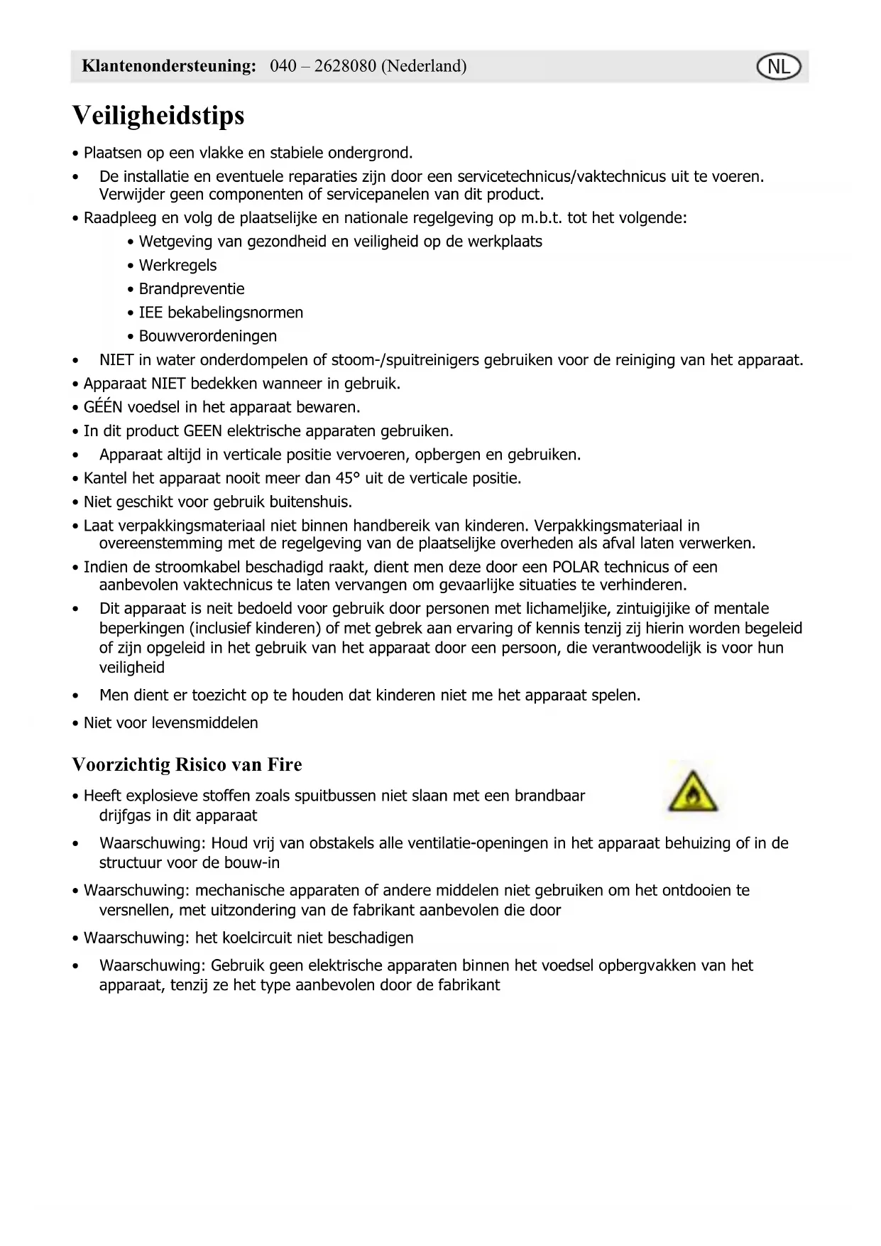 - Waarschuwing: Gebruik geen elektrische apparaten binnen het voedsel opbergvakken van het apparaat, tenzij ze het type aanbevolen door de fabrikantNL Klantenondersteuning: 050 – 609999 (België) Productbeschrijving Inleiding Neem de tijd en lees deze handleiding aandachtig door. Een correct gebruik en onderhoud van deze machine waarborgt de beste prestatie van uw POLAR product. Verpakkingsinhoud De verpakking bevat het volgende: POLAR is trots op de haar productkwaliteit en dienstverlening en controleer de inhoud van de verpakkingen, tijdens de verpakkingsfase, op functionaliteit en schade. Mocht u product door transport zijn beschadigd, neem dan onmiddellijk contact op met uw POLAR dealer. Installatie