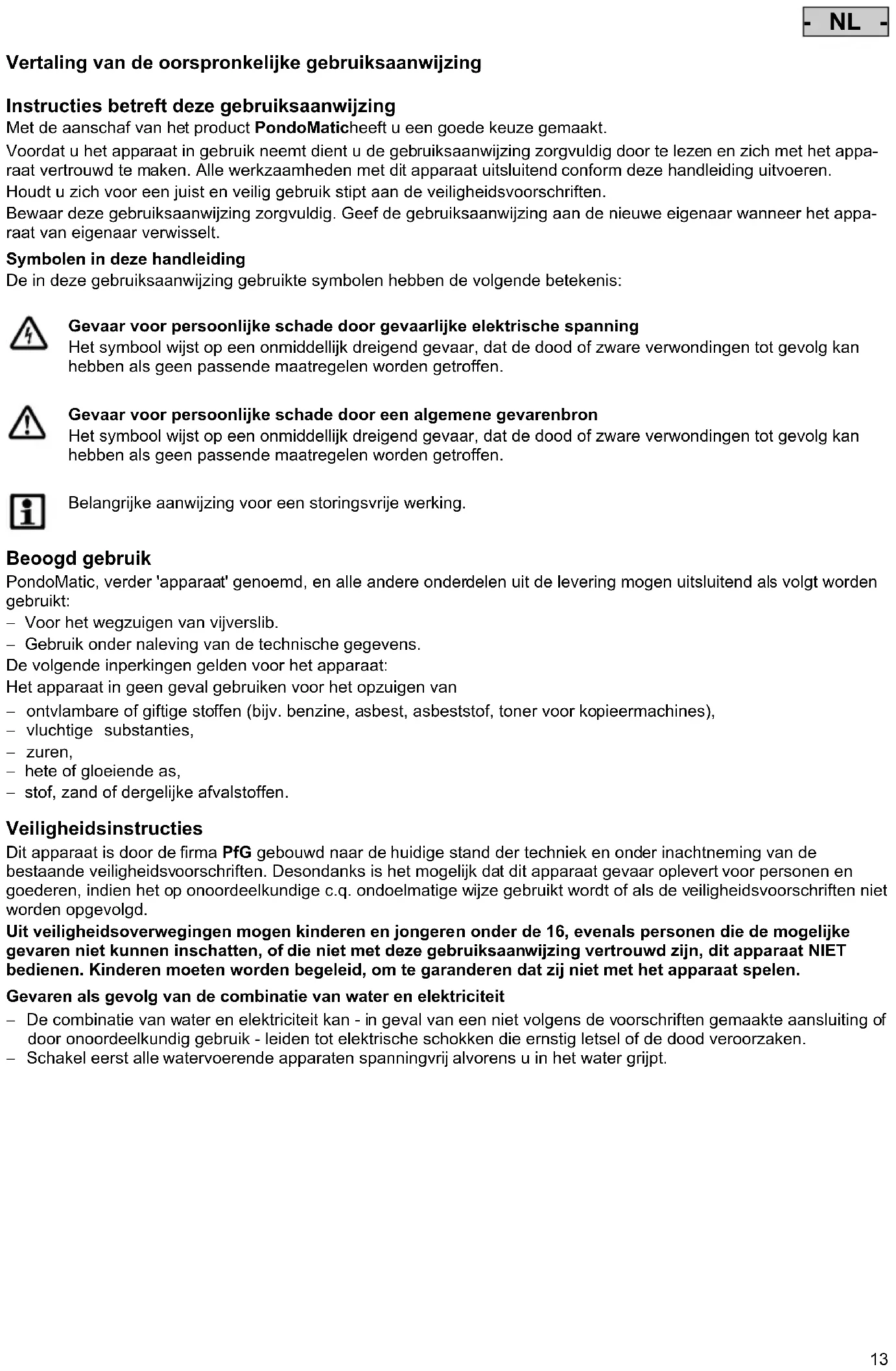 Dit apparaat is door de firma PfG gebouwd waar de huidige stand der techniek en onder inachtneming van de bestaande veiligheidsvoorschriften. Desondanks is het möglichk dat dit apparaat gevaar oplevert voor personen en goederen, indien het op onoordeelkundige c.q. ondoelmatige wijze gezruikt worden opgevolgd.