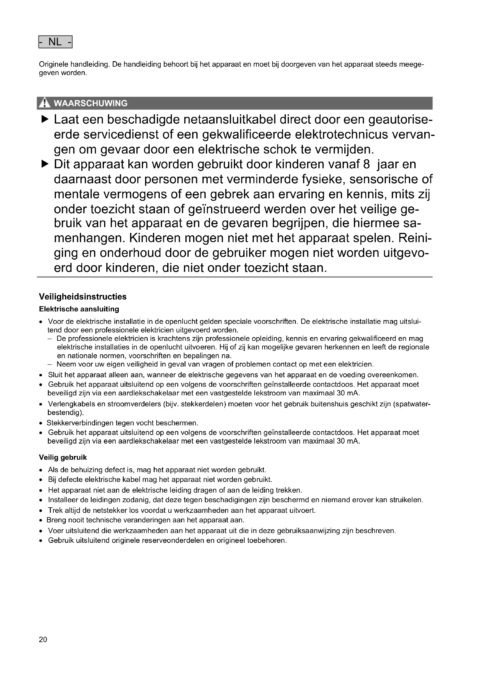 - Bij defecte elektrische kabel mag het apparaat niet worden gebruikt.