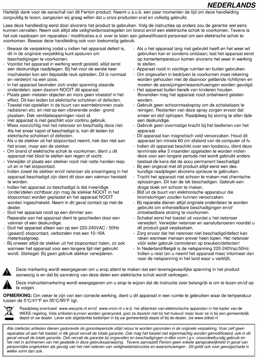 Alle (defecte) artikelen dienen gedurende de garantieperiode altijd retour te worden gezonden in de originele verpakking. Voer zelf geen reparaties uit aan het toestel; in élk geval vervalt de totale garantie. Ook mag het toestel niet eigenmachtig worden gemodificeerd, ook in dit geval vervalt de totale garantie. Ook vervalt de garantie bij ongevallen en beschadigingen in élke vorm t.g.v. onoordeelkundig gebruik en het niet in achtnemen van het gestelde in deze gebruiksaanwijzing. Tevens aanvaardt Fenton geen enkele aansprakelijkheid in geval van persoonlijke ongelukken als gevolg van het niet naleven van veiligheidsinstructies en waarschuwingen . Dit geldt ook voor gevolgschade in wélke vorm dan ook.6 UITPAKKEN LET OP! Pak na ontvangst de doos zorgvuldig uit. Controleer of alle onderdelen aanwezig- en in goede staat ontvangen zijn. Bij transportschade of bij het ontbreken van onderdelen onmiddellijk de verkopende partij inlichten. Bewaar de verpakking en het verpakkingsmateriaal. Indien het product moet worden teruggestuurd, is het belangrijk dat het product in originele verpakking wordt geretourneerd. Schakel het apparaat niet onmiddellijk in als het apparaat is blootgesteld aan drastische temperatuurverschillen (bv. na het transport). De ontstane condensatie kan het apparaat beschadigen. Zorg ervoor dat het apparaat eerst op kamertemperatuur komt alvorens het aan te sluiten. BEDIENINGSELEMENTEN