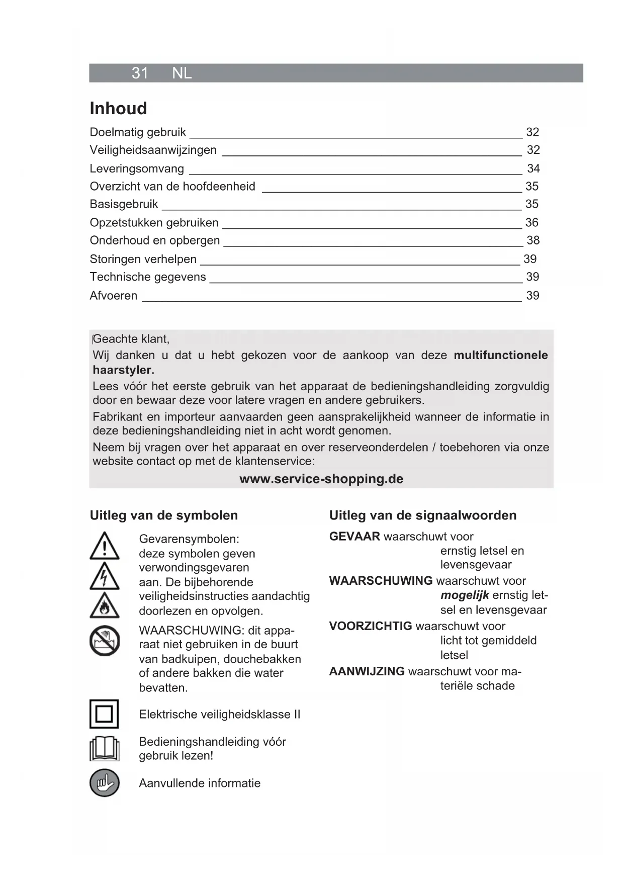 - Alle gebreken als gevolg van ondeskundige behandeling, beschadiging of repara- tiepogingen zijn uitgesloten van de garantie. Dit geldt ook voor de normale slijtage. Veiligheidsaanwijzingen ■ Dit apparaat kan worden gebruikt door kinderen vanaf 8 jaar en door personen met beperkte lichamelijke, sensorische of gees- telijke vermogens of personen die niet beschikken over ervaring en / of kennis, wanneer zij onder toezicht staan en instructies hebben gekregen hoe het apparaat op een veilige manier kan worden gebruikt en wanneer zij de daarmee gepaard gaande gevaren hebben begrepen. ■ Kinderen mogen niet met het apparaat spelen. ■ Reiniging en gebruikersonderhoud mogen niet worden uitge- voerd door kinderen, tenzij zij onder toezicht staan. ■ Kinderen jonger dan 8 jaar en dieren moeten uit de buurt wor- den gehouden van het apparaat en het netsnoer. WAARSCHUWING: dit apparaat niet gebruiken in de buurt van badkuipen, douchebakken of andere bakken die water bevatten. Nooit tijdens het baden of onder de douche gebruiken! ■ De stroomtoevoer naar het apparaat moet altijd worden onder- broken als het niet onder toezicht staat en voordat het wordt gemonteerd, gedemonteerd of gereinigd. ■ Geen veranderingen aanbrengen aan het apparaat. Ook het netsnoer niet zelf vervangen. Wanneer het apparaat, het net- snoer of de netstekker van het apparaat zijn beschadigd, moe- ten deze door de fabrikant, klantenservice of een professionele werkplaats worden vervangen om gevaren te voorkomen.33 NL GEVAAR – Gevaar voor een elektrische schok door water ■ Het apparaat uitsluitend gebruiken en bewaren in gesloten ruimten. Het apparaat niet gebruiken in ruimten met een hoge luchtvochtigheid. ■ Dompel het apparaat nooit in water of andere vloeistoffen! Zorg ervoor dat het ap- paraat, het netsnoer of de netstekker niet in het water kunnen vallen of nat kunnen worden. ■ Mocht het apparaat in het water vallen, onderbreekt u meteen de stroomtoevoer. Probeer niet om het apparaat uit het water te trekken, terwijl het is aangesloten op het stroomnet! ■ Raak de hoofdeenheid, het netsnoer en de netstekker nooit aan met vochtige handen wanneer deze onderdelen zijn aangesloten op het stroomnet. WAARSCHUWING – Brandgevaar ■ Gebruik het apparaat niet in ruimten met licht ontvlambare of explosieve substanties. ■ Houd brandbare materialen, bijv. karton, kunststof of papier, uit de buurt van het apparaat en plaats het apparaat tijdens en na het gebruik nooit op brandbare voor- werpen of ondergronden. ■ Wikkel het netsnoer vóór het aansluiten van het apparaat volledig af. VOORZICHTIG – Gevaar voor verwondingen ■ Verbrandingsgevaar! Het verwarmingselement en de opzetstukken worden heet tijdens het gebruik! Voorzichtig in de omgang met het apparaat. Pak het apparaat alleen beet bij de greep. ■ Valgevaar! Zorg ervoor dat niemand kan struikelen over het aangesloten netsnoer. AANWIJZING – Risico op materiële schade ■ Het apparaat alleen aansluiten op een contactdoos die is geïnstalleerd volgens de voorschriften. De contactdoos moet ook na het aansluiten goed toegankelijk zijn, zodat de verbinding met het stroomnet snel kan worden geïsoleerd. De netspanning moet overeenstemmen met de gegevens van het typeplaatje van het apparaat. ■ Het apparaat moet zijn uitgeschakeld, wanneer u de netstekker uit de contactdoos trekt of erin steekt. ■ Let op dat het netsnoer niet bekneld raakt, geknikt of over scherpe randen gelegd wordt en dat het niet in aanraking komt met hete oppervlakken (bijv. van het appa- raat). ■ Schakel het apparaat uit en trek de netstekker uit de contactdoos, wanneer tijdens het gebruik een storing optreedt of vóór een onweersbui. ■ Wanneer de netstekker uit de contactdoos wordt getrokken, altijd aan de netstekker en nooit aan het netsnoer trekken. ■ Het apparaat niet aan het netsnoer trekken of dragen. Wikkel het netsnoer nooit om het apparaat. ■ Gebruik uitsluitend originele toebehoren van de fabrikant. Bij gebruik van niet door de fabrikant toegelaten toebehoren vervalt elke aanspraak op garantie.NL 34 ■ Plaats nooit zware voorwerpen op het apparaat, het netsnoer of de netstekker. ■ Bescherm het apparaat tegen andere warmtebronnen, open vuur, temperaturen on- der nul, lang aanhoudend vocht, natheid en schokken. ■ Gebruik het apparaat niet wanneer het niet goed functioneerde, op de grond of in het water is gevallen. Laat het vóór ingebruikneming controleren in een gespecialiseerde werkplaats. Leveringsomvang LET OP! ■ WAARSCHUWING – Verstikkingsgevaar! Houd het verpakkingsmateriaal buiten bereik van kinderen en dieren. ■ Verwijder nooit het typeplaatje en eventuele waarschuwingen! Pak alle onderdelen uit en controleer de leveringsomvang op volledigheid en transport- schade. Eventuele stickers en folie verwijderen. Mocht het apparaat schade vertonen, gebruik het dan niet (!) maar neem contact op met de klantenservice.