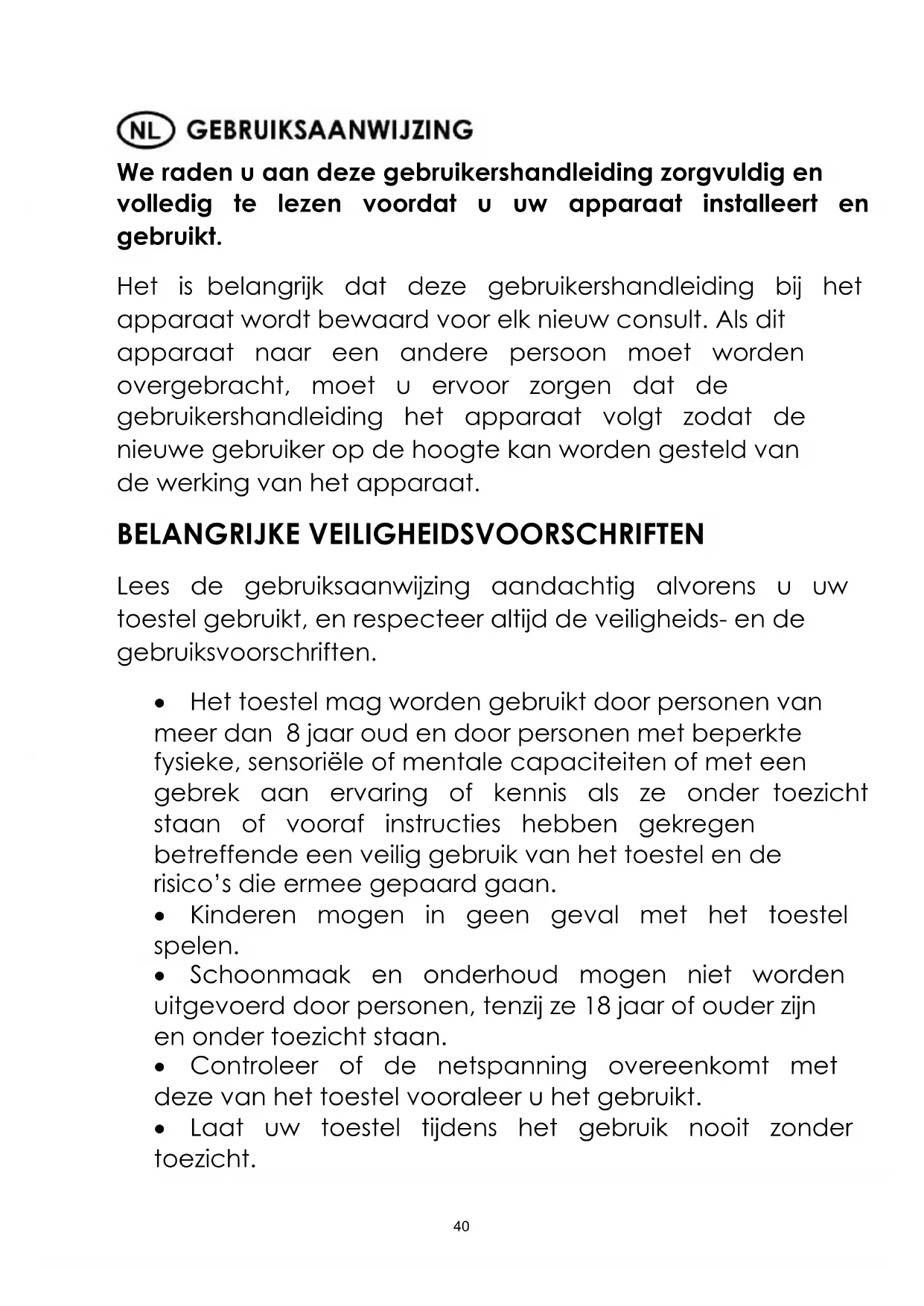SC GB 834-838 N - 180711 39We raden u aan deze gebruikershandleiding zorgvuldig en volledig te lezen voordat u uw apparaat installeert en gebruikt. Het is belangrijk dat deze gebruikershandleiding bij het apparaat wordt bewaard voor elk nieuw consult. Als dit apparaat naar een andere persoon moet worden overgebracht, moet u ervoor zorgen dat de gebruikershandleiding het apparaat volgt zodat de nieuwe gebruiker op de hoogte kan worden gesteld van de werking van het apparaat. BELANGRIJKE VEILIGHEIDSVOORSCHRIFTEN Lees de gebruiksaanwijzing aandachtig alvorens u uw toestel gebruikt, en respecteer altijd de veiligheids- en de gebruiksvoorschriften. Het toestel mag worden gebruikt door personen van meer dan 8 jaar oud en door personen met beperkte fysieke, sensoriële of mentale capaciteiten of met een gebrek aan ervaring of kennis als ze onder toezicht staan of vooraf instructies hebben gekregen betreffende een veilig gebruik van het toestel en de risico’s die ermee gepaard gaan. Kinderen mogen in geen geval met het toestel spelen. Schoonmaak en onderhoud mogen niet worden uitgevoerd door personen, tenzij ze 18 jaar of ouder zijn en onder toezicht staan. Controleer of de netspanning overeenkomt met deze van het toestel vooraleer u het gebruikt. Laat uw toestel tijdens het gebruik nooit zonder toezicht.