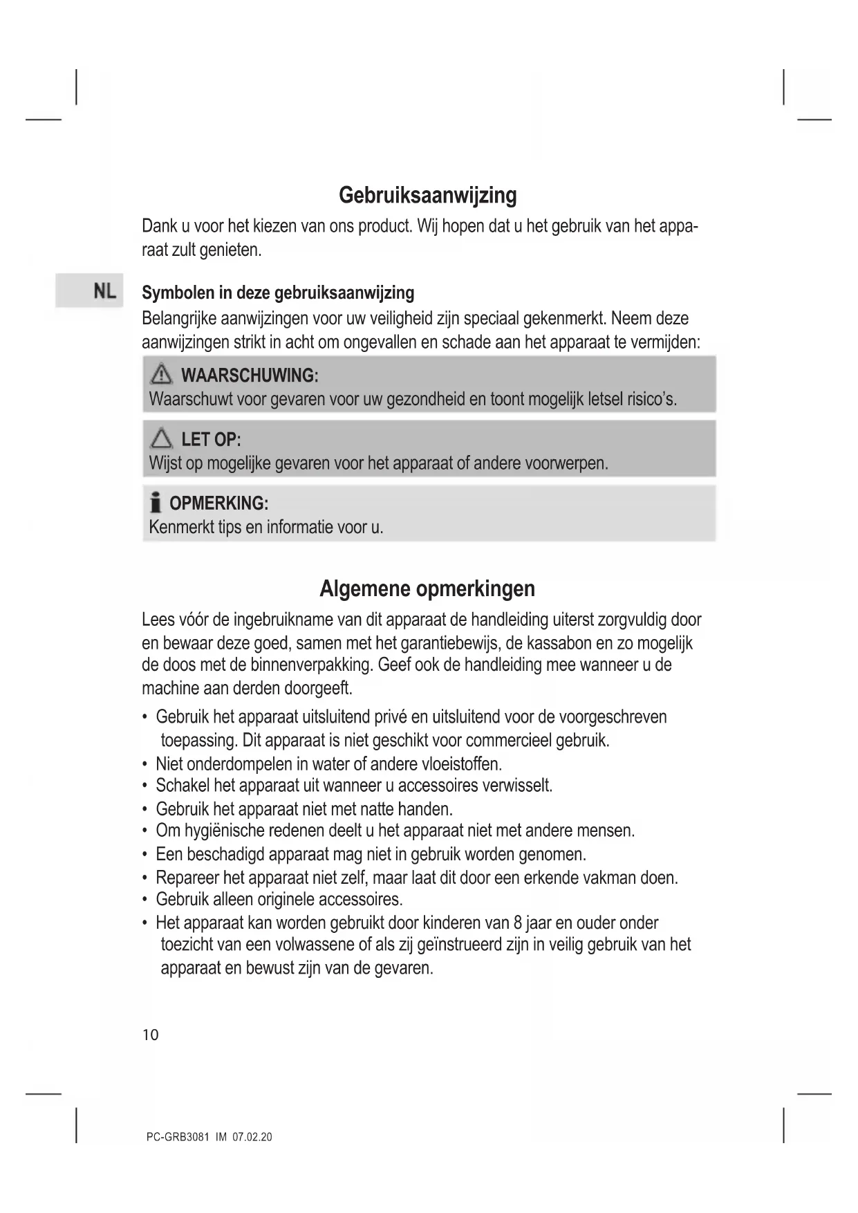 - Geben Sie das Gerät am Ende der Lebensdauer nicht in den Hausmüll. Bringen Sie es zum Recycling zu einer ofziellen Sam- melstelle. Auf diese Weise helfen Sie die Umwelt zu schonen.10 PC-GRB3081_IM 07.02.20 Gebruiksaanwijzing Dank u voor het kiezen van ons product. Wij hopen dat u het gebruik van het appa- raat zult genieten. Symbolen in deze gebruiksaanwijzing Belangrijke aanwijzingen voor uw veiligheid zijn speciaal gekenmerkt. Neem deze aanwijzingen strikt in acht om ongevallen en schade aan het apparaat te vermijden: WAARSCHUWING: Waarschuwt voor gevaren voor uw gezondheid en toont mogelijk letsel risico’s. LET OP: Wijst op mogelijke gevaren voor het apparaat of andere voorwerpen. OPMERKING: Kenmerkt tips en informatie voor u. Algemene opmerkingen Lees vóór de ingebruikname van dit apparaat de handleiding uiterst zorgvuldig door en bewaar deze goed, samen met het garantiebewijs, de kassabon en zo mogelijk de doos met de binnenverpakking. Geef ook de handleiding mee wanneer u de machine aan derden doorgeeft.