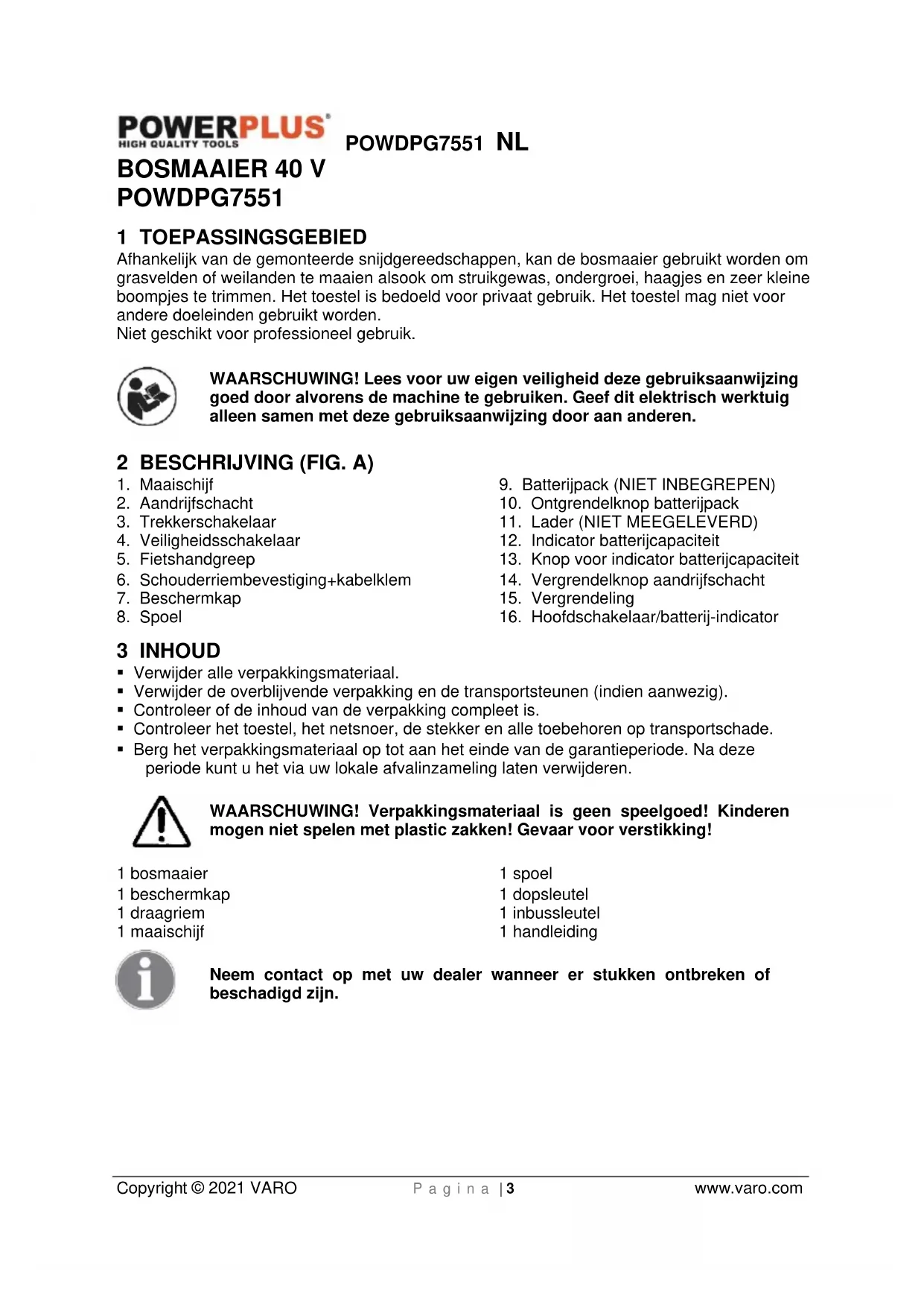 3 INHOUD Verwijder alle verpakkingsmateriaal. Verwijder de overblijvende verpakking en de transportsteunen (indien aanwezig). Controleer of de inhoud van de verpakking compleet is. Controleer het toestel, het netsnoer, de stekker en alle toebehoren op transportschade. Berg het verpakkingsmateriaal op tot aan het einde van de garantieperiode. Na deze periode kunt u het via uw lokale afvalinzameling laten verwijderen. WAARSCHUWING! Verpakkingsmateriaal is geen speelgoed! Kinderen mogen niet spelen met plastic zakken! Gevaar voor verstikking! 1 bosmaaier 1 beschermkap 1 draagriem 1 maaischijf 1 spoel 1 dopsleutel 1 inbussleutel 1 handleiding Neem contact op met uw dealer wanneer er stukken ontbreken of beschadigd zijn.POWDPG7551 NL Copyright © 2021 VARO P a g i n a | 4 www.varo.com