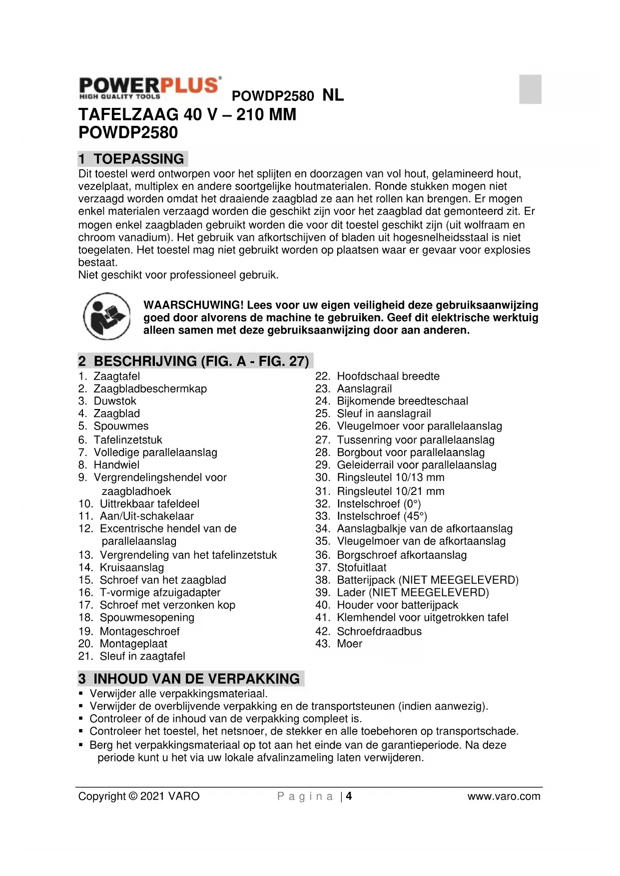 - Uw gereedschap moet als geheel naar uw dealer worden teruggebracht in een aanvaardbare staat van netheid, in zijn originele kunststof koffer (indien van toepassing op het product) en het moet vergezeld zijn van uw bewijs van aankoop. 17 MILIEU Indien u, na zekere tijd, beslist uw machine te vervangen, werp deze dan niet weg bij uw huishoudelijk afval maar doe dit op een milieuvriendelijke wijze. Het elektrische afval mag niet op dezelfde manier behandeld worden dan het gewone huishoudelijke afval. Breng het naar een recyclagecentrum op plaatsen waar zulke gepaste installaties bestaan. Raadpleeg de plaatselijke instanties of de verkoper voor adviezen over inzameling en verwerking.POWDP2580 NL Copyright © 2021 VARO P a g i n a | 22 www.varo.com 18 CONFORMITEITSVERKLARING VARO N.V. - Vic. Van Rompuy N.V. Joseph Van Instraat 9 - BE2500 Lier - BELGIUM, verklaart dat, Product: Tafelzaag – Batterijgevoed Handelsmerk: PowerPlus Model: POWDP2580 voldoet aan de essentiële eisen en aan de overige relevante bepalingen van de van toepassing zijnde Europese Richtlijnen, gebaseerd op de toepassing van Europese geharmoniseerde normen. Elke niet-toegelaten modificatie van het apparaat maakt deze verklaring nietig. Europese Richtlijnen (inclusief, indien van toepassing, hun wijzigingen tot op de datum van ondertekening): 2011/65/EU 2014/30/EC 2006/42/EC Europese geharmoniseerde normen (inclusief, indien van toepassing, hun wijzigingen tot op de datum van ondertekening): EN62841-1 : 2015 EN62841-3-1 : 2014 EN55014-1 : 2017 EN55014-2 : 2015 Beheerder van de technische documentatie: Philippe Vankerkhove, VARO – Vic. Van Rompuy N.V. Ondergetekende handelt in opdracht van de bedrijfsleider, Ludo Mertens Certificatiemanager 28/10/2021, Lier - BelgiumPOWDP2580 FR Copyright © 2021 VARO P a g e | 1 www.varo.com 1 UTILISATION ................................................................................... 4