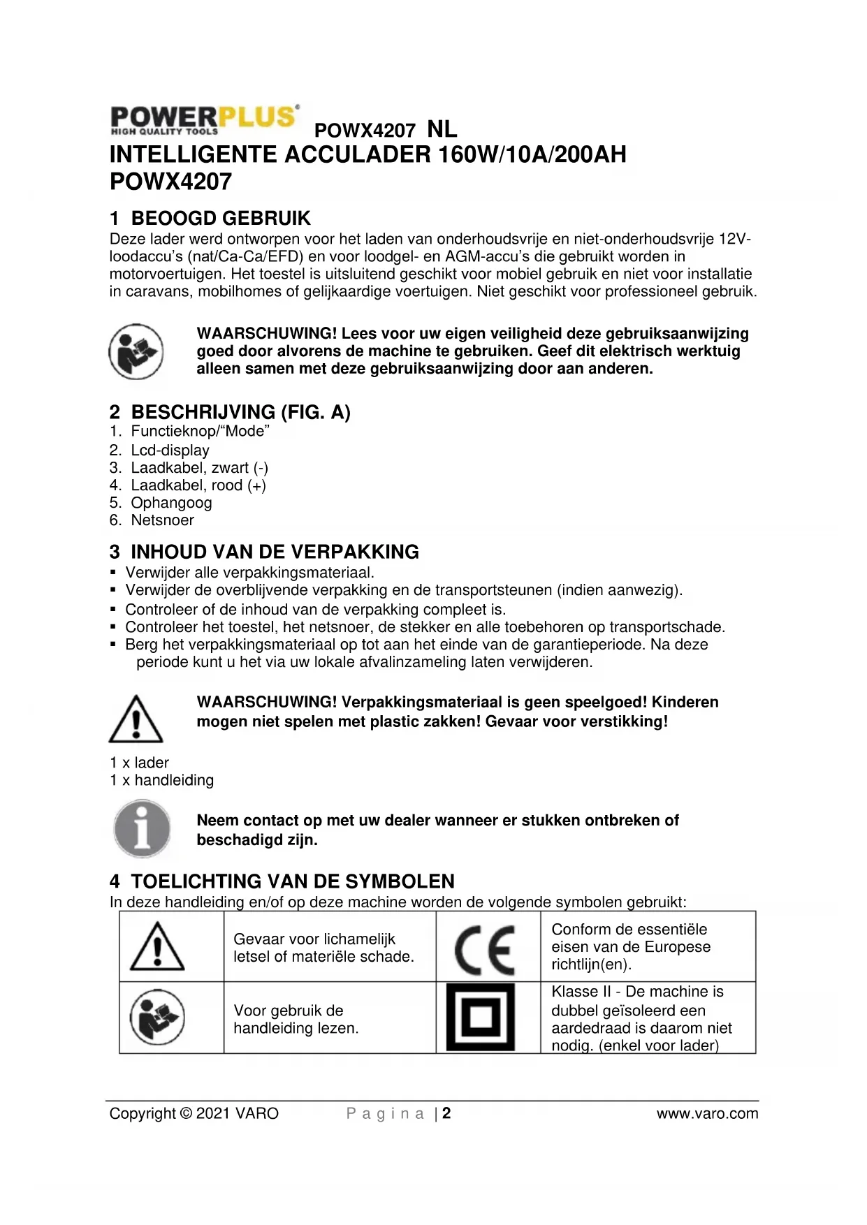- Belangrijk! Wanneer de stekker uit het stopcontact werd gehaald, maar de laadkabels wel nog op de accu zijn aangesloten, trekt de lader een kleine stroom uit de accu. We raden daarom aan dat u altijd de lader van de accu loskoppelt wanneer hij niet in gebruik is. 8 TECHNISCHE GEGEVENS Type POWX4207 Netspanning 220 – 240 V ~ 50 Hz Max. opgenomen vermogen 160 W Nominale uitgangsspanning 12 V DC Nominale uitgangsstroom 10 A Max. uitgangsstroom “SUPPLY”-functie 8 A “RECOND”-laadprogramma 15,3 V DC / 2,5 A Omgevingstemperatuur -20 °C – 40 °C Accucapaciteit STD/AGM/Winter 30 – 200 Ah Accucapaciteit “onderhoudslading” (max. 1 A) 3 – 60 AhPOWX4207 NL Copyright © 2021 VARO P a g i n a | 9 www.varo.com 9 MILIEU Indien u, na zekere tijd, beslist uw machine te vervangen, werp deze dan niet weg bij uw huishoudelijk afval maar doe dit op een milieuvriendelijke wijze. Afval geproduceerd door elektrische machines mag niet op dezelfde manier behandeld worden als het gewone huishoudelijke afval. Breng het naar een recyclagecentrum op plaatsen waar zulke gepaste installaties bestaan. Raadpleeg de plaatselijke instanties of de verkoper voor adviezen over inzameling en verwerking. 10 CONFORMITEITSVERKLARING VARO-Vic. Van Rompuy N.V. - Joseph Van Instraat 9 - BE2500 Lier - BELGIUM, verklaart dat, product: Intelligente lader handelsmerk: POWERplus model: POWX4207 voldoet aan de essentiële eisen en aan de overige relevante bepalingen van de van toepassing zijnde Europese Richtlijnen, gebaseerd op de toepassing van Europese geharmoniseerde normen. Elke niet-toegelaten modificatie van het apparaat maakt deze verklaring nietig. Europese Richtlijnen (inclusief, indien van toepassing, hun wijzigingen tot op de datum van ondertekening): 2011/65/EU 2014/30/EU 2014/35/EU Europese geharmoniseerde normen (inclusief, indien van toepassing, hun wijzigingen tot op de datum van ondertekening): EN60335-1 : 2012 EN60335-2-29 : 2004 EN55014-1 : 2017 EN55014-2 : 2015 EN61000-3-2 : 2014 EN61000-3-3 : 2013 Beheerder van de technische documentatie: Philippe Vankerkhove, VARO – Vic. Van Rompuy N.V. Ondergetekende handelt in opdracht van de bedrijfsleider, Philippe Vankerkhove Regelgevings- en compliancemanager Lier, 27/11/2020POWX4207 FR Copyright © 2021 VARO P a g e | 1 www.varo.com