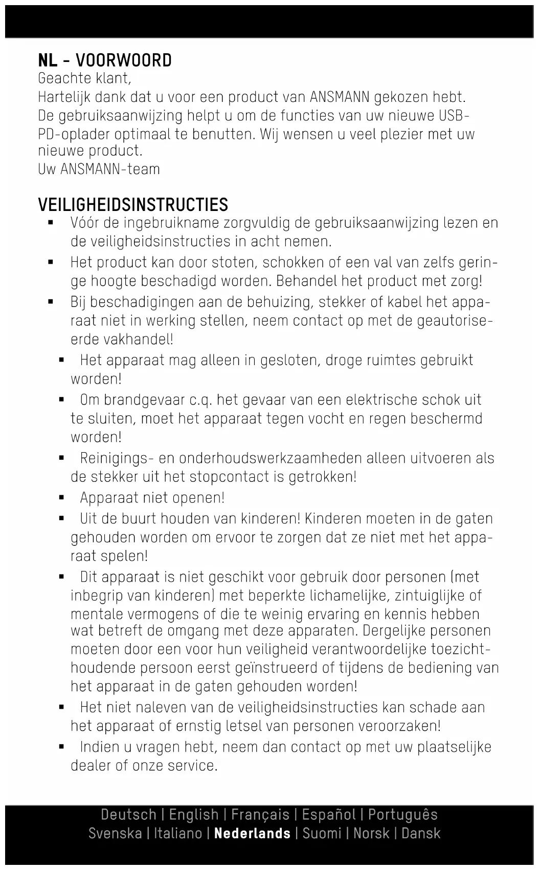Per questo apparecchio concediamo 3 anni di garanzia. La garanzia non è valida per qualsiasi danno all‘apparecchio che sia provocato dall‘inosservanza delle istruzioni. Con riserva di modifiche tecniche. Non ci assumiamo nessuna res- ponsabilità per eventuali errori di stampa. 06/2019 Le nostre condizioni di garanzia sono contenute online sul sito www. ansmann.deNL - VOORWOORD Geachte klant, Hartelijk dank dat u voor een product van ANSMANN gekozen hebt. De gebruiksaanwijzing helpt u om de functies van uw nieuwe USB- PD-oplader optimaal te benutten. Wij wensen u veel plezier met uw nieuwe product. Uw ANSMANN-team VEILIGHEIDSINSTRUCTIES Vóór de ingebruikname zorgvuldig de gebruiksaanwijzing lezen en de veiligheidsinstructies in acht nemen. Het product kan door stoten, schokken of een val van zelfs gerin- ge hoogte beschadigd worden. Behandel het product met zorg! Bij beschadigingen aan de behuizing, stekker of kabel het appa- raat niet in werking stellen, neem contact op met de geautorise- erde vakhandel! Het apparaat mag alleen in gesloten, droge ruimtes gebruikt worden! Om brandgevaar c.q. het gevaar van een elektrische schok uit te sluiten, moet het apparaat tegen vocht en regen beschermd worden! Reinigings- en onderhoudswerkzaamheden alleen uitvoeren als de stekker uit het stopcontact is getrokken! Apparaat niet openen! Uit de buurt houden van kinderen! Kinderen moeten in de gaten gehouden worden om ervoor te zorgen dat ze niet met het appa- raat spelen! Dit apparaat is niet geschikt voor gebruik door personen (met inbegrip van kinderen) met beperkte lichamelijke, zintuiglijke of mentale vermogens of die te weinig ervaring en kennis hebben wat betreft de omgang met deze apparaten. Dergelijke personen moeten door een voor hun veiligheid verantwoordelijke toezicht- houdende persoon eerst geïnstrueerd of tijdens de bediening van het apparaat in de gaten gehouden worden! Het niet naleven van de veiligheidsinstructies kan schade aan het apparaat of ernstig letsel van personen veroorzaken! Indien u vragen hebt, neem dan contact op met uw plaatselijke dealer of onze service. Deutsch | English | Français | Español | Português Svenska | Italiano | Nederlands | Suomi | Norsk | Dansk Het product mag niet permanent in combinatie met een reisad- apter worden gebruikt. INGEBRUIKNAME Compatibile con PD Compatibile con PD Compatibile con USB tipo C PD Ricarica rapida Elevata potenza APPARATEN OPLADEN Gebruik de meegeleverde USB-PD-kabel of de originele laadkabel voor uw apparaat om een apparaat zoals bijv. een smartphone op te laden De USB-PD-oplader heeft een type-C en USB-A-uitgang. Gebruik hier- voor een geschikte type-C-kabel. Steek de USB-/type-C-stekker van de kabel in de USB-PD-oplader en het andere uiteinde in uw apparaat. De laadprocedure start automatisch. De USB-PD-oplader is voorzien van USB- en een Power Delivery (PD)-protocol. Controleer om deze technologie te kunnen gebruiken of uw eindapparaat daarmee compatibel is. Het gelijktijdig opladen van meerdere eindapparaten is beperkt moge- lijk. Dit is afhankelijk van de in totaal benodigde laadstroomsterkte en de laadspanning. De USB-PD-oplader wordt na het succesvol opladen automatisch uitgeschakeld. Koppel na het succesvol opladen uw apparaat los van de USB-PD-oplader. Afhankelijk van het benodigde uitgangsvermogen kan de USB-PD- oplader een beetje warm worden. GERUIK