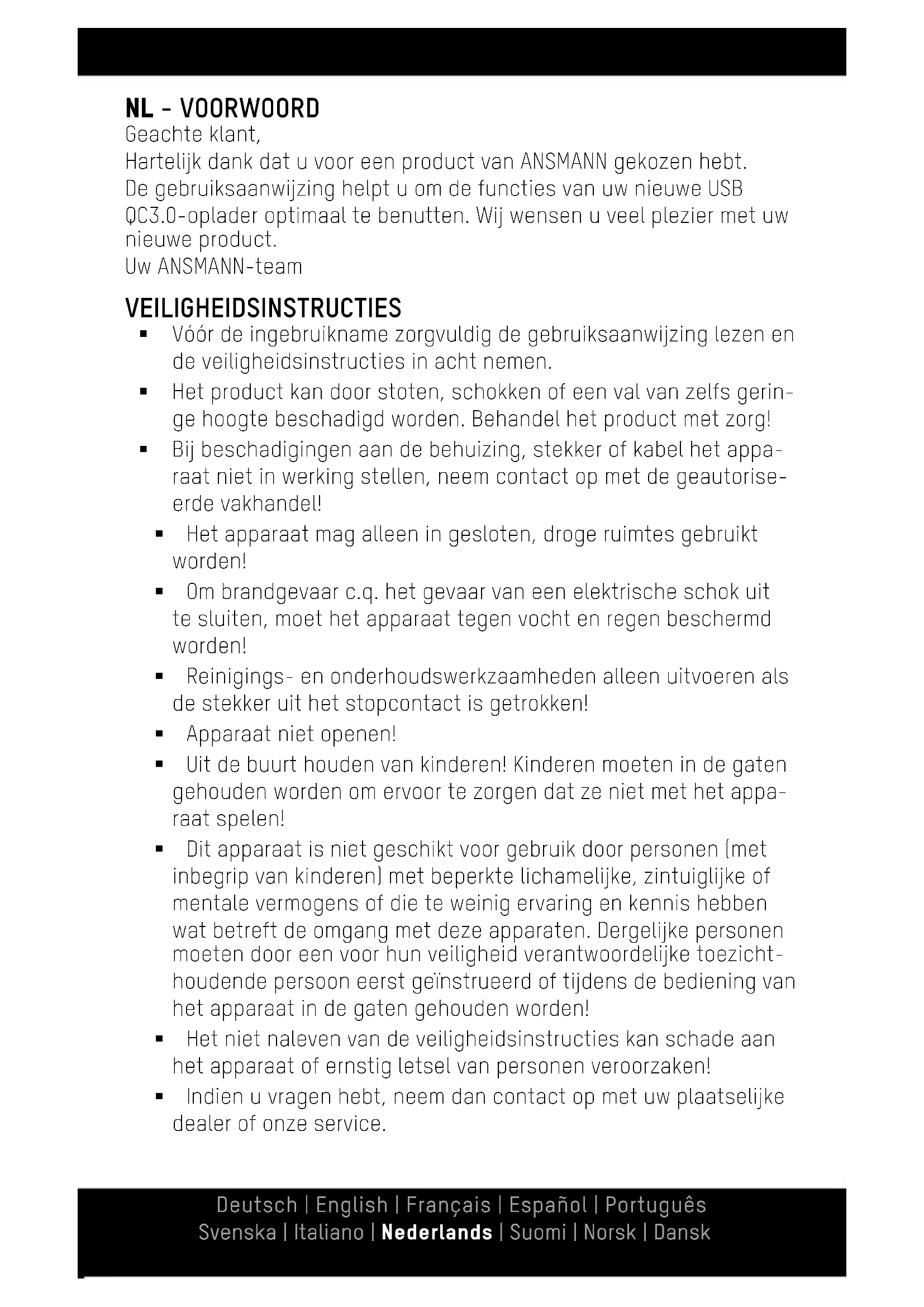 Per questo apparecchio concediamo 3 anni di garanzia. La garanzia non è valida per qualsiasi danno all‘apparecchio che sia provocato dall‘inosservanza delle istruzioni. Le nostre condizioni di garanzia sono contenute online sul sito www.ansmann.de Con riserva di modifiche tecniche. Non ci assumiamo nessuna responsabilità per eventuali errori di stampa. 08/2019NL - VOORWOORD Geachte klant, Hartelijk dank dat u voor een product van ANSMANN gekozen hebt. De gebruiksaanwijzing helpt u om de functies van uw nieuwe USB QC3.0-oplader optimaal te benutten. Wij wensen u veel plezier met uw nieuwe product. Uw ANSMANN-team VEILIGHEIDSINSTRUCTIES Vóór de ingebruikname zorgvuldig de gebruiksaanwijzing lezen en de veiligheidsinstructies in acht nemen. Het product kan door stoten, schokken of een val van zelfs gerin- ge hoogte beschadigd worden. Behandel het product met zorg! Bij beschadigingen aan de behuizing, stekker of kabel het appa- raat niet in werking stellen, neem contact op met de geautorise- erde vakhandel! Het apparaat mag alleen in gesloten, droge ruimtes gebruikt worden! Om brandgevaar c.q. het gevaar van een elektrische schok uit te sluiten, moet het apparaat tegen vocht en regen beschermd worden! Reinigings- en onderhoudswerkzaamheden alleen uitvoeren als de stekker uit het stopcontact is getrokken! Apparaat niet openen! Uit de buurt houden van kinderen! Kinderen moeten in de gaten gehouden worden om ervoor te zorgen dat ze niet met het appa- raat spelen! Dit apparaat is niet geschikt voor gebruik door personen (met inbegrip van kinderen) met beperkte lichamelijke, zintuiglijke of mentale vermogens of die te weinig ervaring en kennis hebben wat betreft de omgang met deze apparaten. Dergelijke personen moeten door een voor hun veiligheid verantwoordelijke toezicht- houdende persoon eerst geïnstrueerd of tijdens de bediening van het apparaat in de gaten gehouden worden! Het niet naleven van de veiligheidsinstructies kan schade aan het apparaat of ernstig letsel van personen veroorzaken! Indien u vragen hebt, neem dan contact op met uw plaatselijke dealer of onze service. Deutsch | English | Français | Español | Português Svenska | Italiano | Nederlands | Suomi | Norsk | Dansk Het product mag niet permanent in combinatie met een reisad- apter worden gebruikt. INGEBRUIKNAME APPARATEN OPLADEN Gebruik de meegeleverde USB QC3.0-kabel of de originele laadkabel voor uw apparaat om een apparaat zoals bijv. een smartphone op te laden De USB QC3.0-oplader heeft een USB-A-uitgang. Gebruik hiervoor een geschikte kabel. Steek de USB-stekker van de kabel in de USB QC3.0-oplader en het andere uiteinde in uw apparaat. De laadprocedu- re start automatisch. De USB QC3.0-oplader is voorzien van USB- en een Qualcomm Quick Charge (QC3.0)-protocol. Controleer om deze technologie te kunnen gebruiken of uw eindapparaat daarmee compatibel is. Het gelijktijdig opladen van meerdere eindapparaten is beperkt moge- lijk. Dit is afhankelijk van de in totaal benodigde laadstroomsterkte en de laadspanning. De USB QC3.0-oplader wordt na het succesvol opladen automatisch uitgeschakeld. Koppel na het succesvol opladen uw apparaat los van de USB QC3.0-oplader. Afhankelijk van het benodigde uitgangsvermogen kan de USB QC3.0-oplader een beetje warm worden. GERUIK
