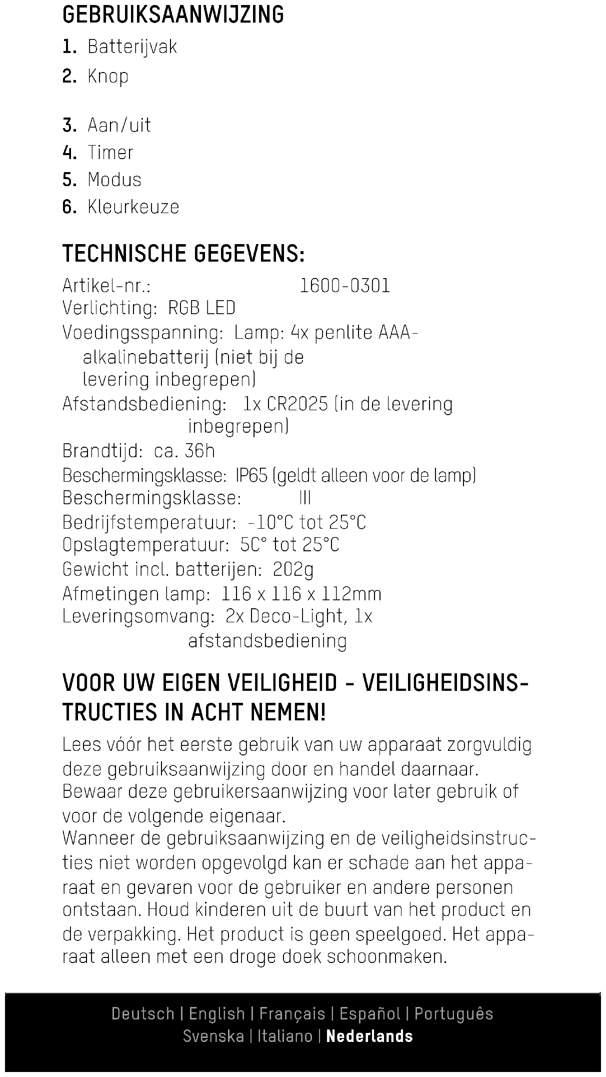 TECHNISCHE GEGEVENS: Artikel-nr.: 1600-0301 Verlichting: RGB LED Voedingsspanning: Lamp: 4x penlite AAA- alkalinebatterij (niet bij de levering inbegrepen) Afstandsbediening: 1x CR2025 (in de levering inbegrepen) Brandtijd: ca. 36h Beschermingsklasse: IP65 (geldt alleen voor de lamp) Beschermingsklasse: III Bedrijfstemperatuur: -10°C tot 25°C Opslagtemperatuur: 5C° tot 25°C Gewicht incl. batterijen: 202g Afmetingen lamp: 116 x 116 x 112mm Leveringsomvang: 2x Deco-Light, 1x afstandsbediening