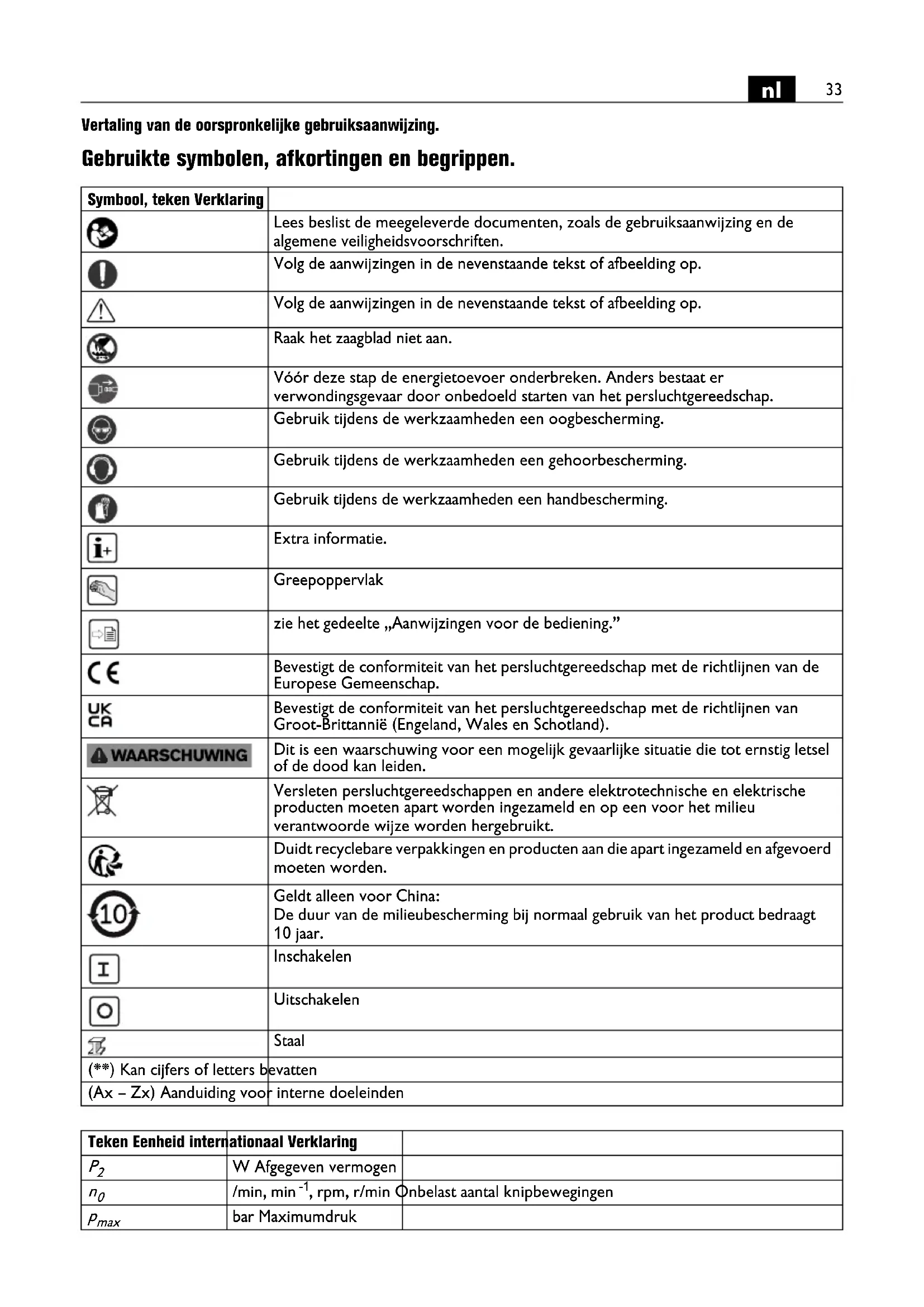Vertaling van de oorspronkelijke gebruiksaanwijzing. Gebruikte symbolen, afkortingen en begrippen. Symbool, teken Verklaring Lees beslist de meegeleverde documenten, zoals de gebruiksaanwijzing en de algemene veiligheidsvoorschriften. Volg de aanwijzingen in de nevenstaande tekst of afbeelding op. Volg de aanwijzingen in de nevenstaande tekst of afbeelding op. Raak het zaagblad niet aan. Vóór deze stap de energietoevoer onderbreken. Anders bestaat er verwondingsgevaar door onbedoeld starten van het persluchtgereedschap. Gebruik tijdens de werkzaamheden een oogbescherming. Gebruik tijdens de werkzaamheden een gehoorbescherming. Gebruik tijdens de werkzaamheden een handbescherming. Extra informatie. Greepoppervlak zie het gedeelte „Aanwijzingen voor de bediening.” Bevestigt de conformiteit van het persluchtgereedschap met de richtlijnen van de Europese Gemeenschap. Bevestigt de conformiteit van het persluchtgereedschap met de richtlijnen van Groot-Brittannië (Engeland, Wales en Schotland). Dit is een waarschuwing voor een mogelijk gevaarlijke situatie die tot ernstig letsel of de dood kan leiden. Versleten persluchtgereedschappen en andere elektrotechnische en elektrische producten moeten apart worden ingezameld en op een voor het milieu verantwoorde wijze worden hergebruikt. Duidt recyclebare verpakkingen en producten aan die apart ingezameld en afgevoerd moeten worden. Geldt alleen voor China: De duur van de milieubescherming bij normaal gebruik van het product bedraagt 10 jaar. Inschakelen Uitschakelen Staal (**) Kan cijfers of letters bevatten (Ax – Zx) Aanduiding voor interne doeleinden Teken Eenheid internationaal Verklaring