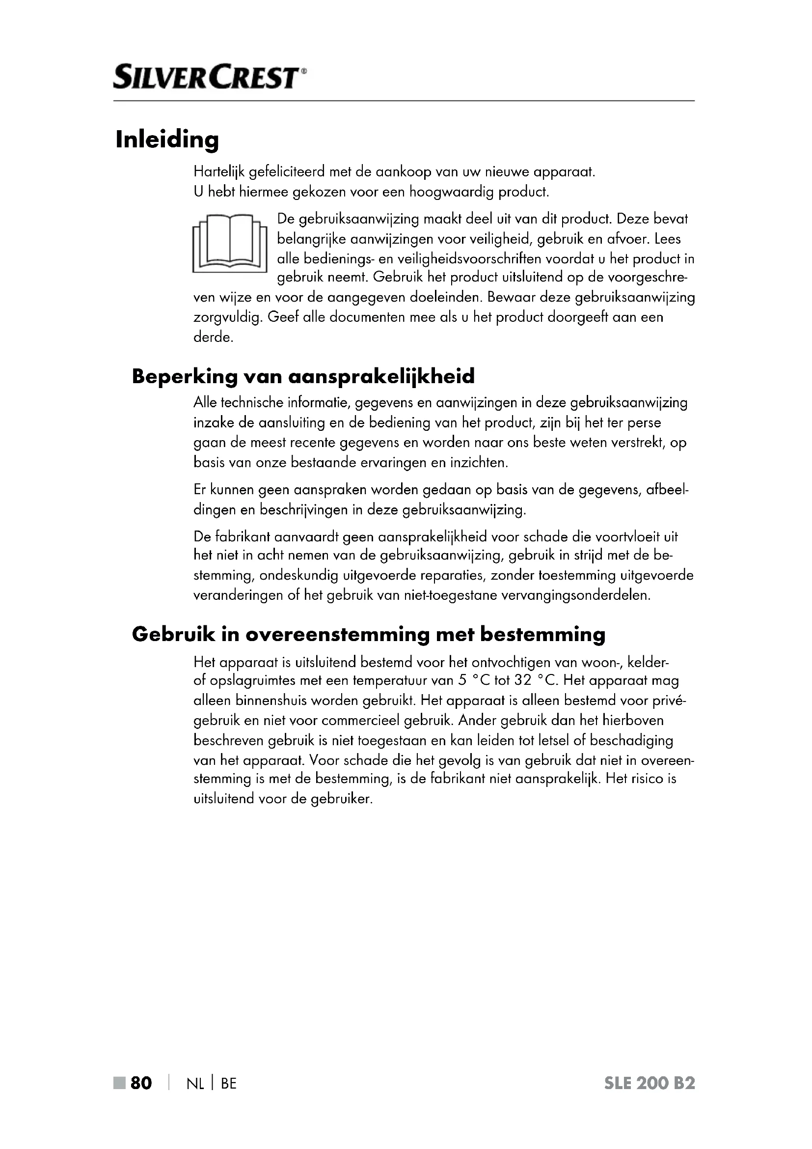 SLE 200 B2 Inleiding Hartelijk gefeliciteerd met de aankoop van uw nieuwe apparaat. U hebt hiermee gekozen voor een hoogwaardig product. De gebruiksaanwijzing maakt deel uit van dit product. Deze bevat belangrijke aanwijzingen voor veiligheid, gebruik en afvoer. Lees alle bedienings- en veiligheidsvoorschriften voordat u het product in gebruik neemt. Gebruik het product uitsluitend op de voorgeschre- ven wijze en voor de aangegeven doeleinden. Bewaar deze gebruiksaanwijzing zorgvuldig. Geef alle documenten mee als u het product doorgeeft aan een derde. Beperking van aansprakelijkheid Alle technische informatie, gegevens en aanwijzingen in deze gebruiksaanwijzing inzake de aansluiting en de bediening van het product, zijn bij het ter perse gaan de meest recente gegevens en worden naar ons beste weten verstrekt, op basis van onze bestaande ervaringen en inzichten. Er kunnen geen aanspraken worden gedaan op basis van de gegevens, afbeel- dingen en beschrijvingen in deze gebruiksaanwijzing. De fabrikant aanvaardt geen aansprakelijkheid voor schade die voortvloeit uit het niet in acht nemen van de gebruiksaanwijzing, gebruik in strijd met de be- stemming, ondeskundig uitgevoerde reparaties, zonder toestemming uitgevoerde veranderingen of het gebruik van niet-toegestane vervangingsonderdelen. Gebruik in overeenstemming met bestemming Het apparaat is uitsluitend bestemd voor het ontvochtigen van woon-, kelder- of opslagruimtes met een temperatuur van 5 °C tot 32 °C. Het apparaat mag alleen binnenshuis worden gebruikt. Het apparaat is alleen bestemd voor privé- gebruik en niet voor commercieel gebruik. Ander gebruik dan het hierboven beschreven gebruik is niet toegestaan en kan leiden tot letsel of beschadiging van het apparaat. Voor schade die het gevolg is van gebruik dat niet in overeen- stemming is met de bestemming, is de fabrikant niet aansprakelijk. Het risico is uitsluitend voor de gebruiker.NL