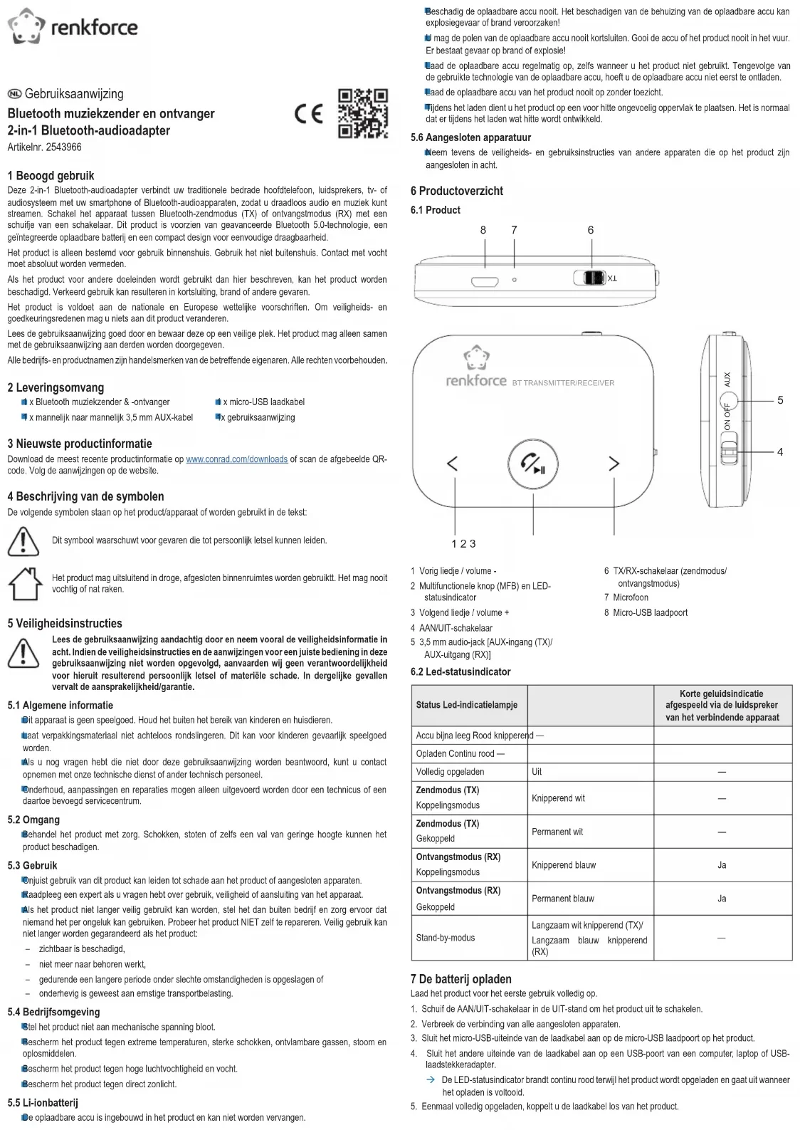 en koppelt u het product los van het audioapparaat. 10 Beknopte handleiding Functie Methode Basisbediening: Voeding aan Schuif de AAN/UIT-schakelaar naar “AAN”. Stroom uit Schuif de AAN/UIT-schakelaar naar “UIT”. Bluetooth-zendmodus (TX) Schuif de TX/RX-schakelaar naar “TX”. Bluetooth-ontvangstmodus (RX) Schuif de TX/RX-schakelaar naar “RX”. ZENDMODUS (TX) Volume – / volume + Tik en houd “<” of “>” ingedrukt om het volume aan te passen. Dempen/dempen opheffen tv Druk eenmaal op de MFB-knop. ONTVANGSTMODUS (RX) Muziek afspelen: Muziek afspelen/pauzeren Druk een keer op de MFB-knop om af te spelen, nogmaals om te pauzeren. Ga naar vorige/volgende nummer Tik eenmaal op “<” of “>”. Volume – / volume + Tik en houd “<” of “>” ingedrukt om het volume aan te passen.Dit is een publicatie van Conrad Electronic SE, Klaus-Conrad-Str. 1, D-92240 Hirschau (www.conrad.com). Alle rechten, vertaling inbegrepen, voorbehouden. Reproducties van welke aard dan ook, bijvoorbeeld fotokopie, microverlming of de registratie in elektronische gegevensverwerkingsapparatuur, vereisen de schriftelijke toestemming van de uitgever. Nadruk, ook van uittreksels, verboden. De publicatie voldoet aan de technische stand ten tijde van het drukken. Copyright 2022 by Conrad Electronic SE. *2543966_v1_0622_02_DS_m_4L_(1) Functie Methode Oproepen beheren: Een inkomend gesprek beantwoorden Druk eenmaal op de MFB-knop. Het gesprek beëindigen Druk tijdens het gesprek eenmaal op de MFB-knop. Overschakelen naar privégesprek Houd tijdens het gesprek de MFB-knop gedurende 2 seconden ingedrukt om het gesprek naar uw smartphone te schakelen om privé verder te gaan. Inkomend gesprek weigeren Druk de MFB-knop en houd deze gedurende 2 seconden ingedrukt. Laatste nummer opnieuw kiezen Druk twee keer op de MFB-knop om automatisch het laatst gekozen nummer te bellen. 11 Onderhoud en reiniging Belangrijk: – Gebruik geen agressieve schoonmaakmiddelen, schoonmaakalcohol of andere chemische oplossingen. Ze beschadigen de behuizing en kunnen een storing aan het product veroorzaken. – Dompel het product niet in water. Spoel het product niet af onder de kraan en stel het niet bloot aan vocht.