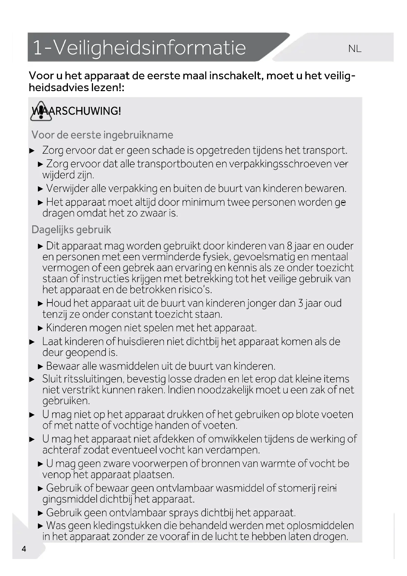 dragen omdat het zo zwaar is. Dagelks gebruik ▶ Dit apparaat mag worden gebruikt door kinderen van 8 jaar en ouder en personen met een verminderde fysiek, gevoelsmatig en mentaal vermogen of een gebrek aan ervaring en kennis als ze onder toezicht staan of instructies krijgen met betrekking tot het veilige gebruik van het apparaat en de betrokken risico’s. ▶ Houd het apparaat uit de buurt van kinderen jonger dan 3 jaar oud tenzij ze onder constant toezicht staan. ▶ Kinderen mogen niet spelen met het apparaat. ▶ Laat kinderen of huisdieren niet dichtbij het apparaat komen als de deur geopend is. ▶ Bewaar alle wasmiddelen uit de buurt van kinderen. ▶ Sluit ritssluitingen, bevestig losse draden en let erop dat kleine items niet verstrikt kunnen raken. Indien noodzakelijk moet u een zak of net gebruiken. ▶ U mag niet op het apparaat drukken of het gebruiken op blote voeten of met natte of vochtige handen of voeten. ▶ U mag het apparaat niet afdekken of omwikkelen tijdens de werking of achteraf zodat eventueel vocht kan verdampen. ▶ U mag geen zware voorwerpen of bronnen van warmte of vocht bo