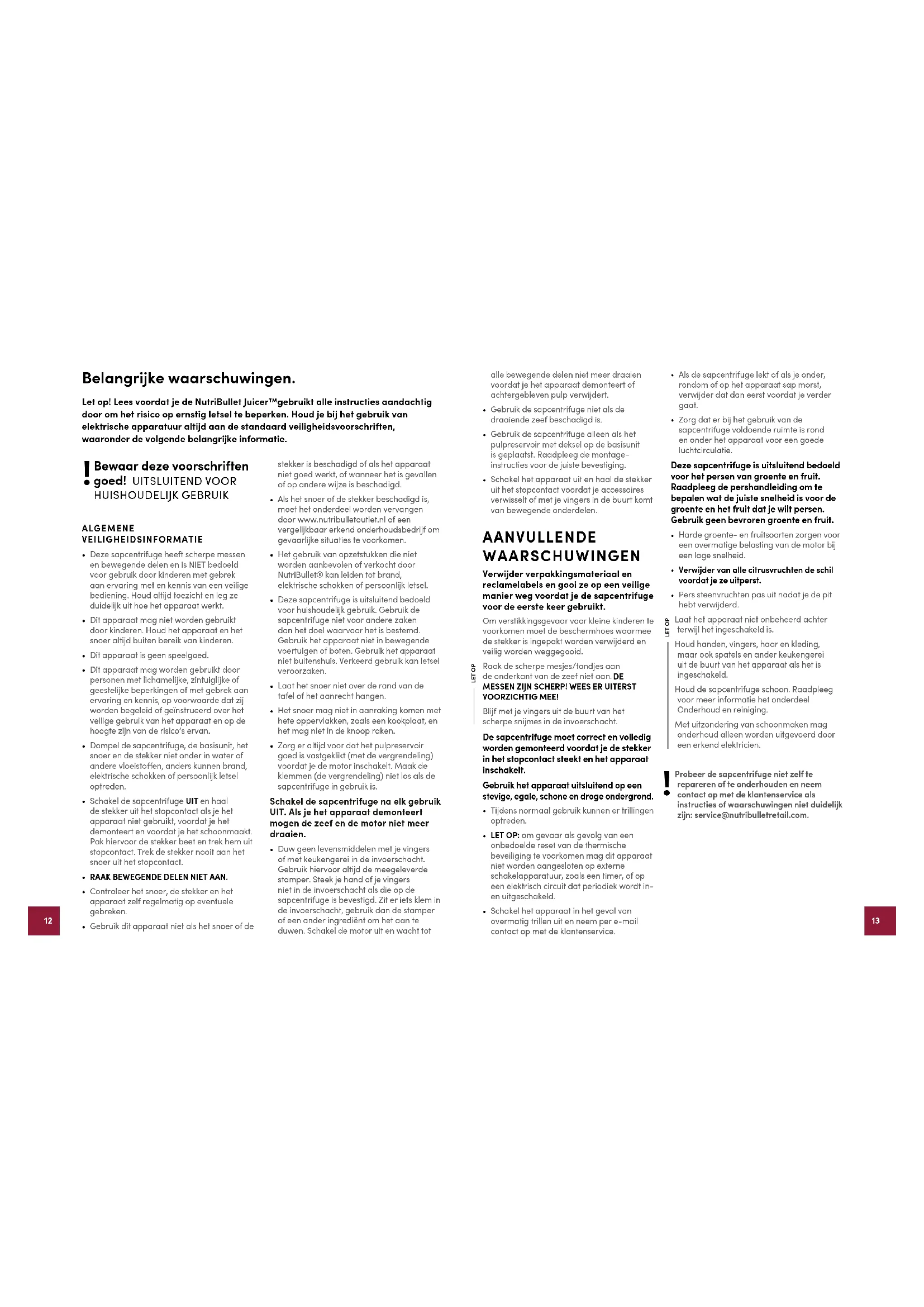 Met het dikke uiteinde van het schoonmaakborsteltje schraap je de pulp er gemakke-lijk uit, waarna je hem kunt verwerken in andere recepten of kunt composteren. Je kunt het pulpreservoir ook legen in je afvalemmer of gft-bak.1. Haal altijd eerst de stekker van de basisunit uit het stopcontact voordat je het apparaat monteert, demonteert, schoonmaakt of opbergt.2. Zodra het pulpreservoir leeg is, spoel je alle onderdelen af onder de kraan.3. Gebruik het schoonmaakborsteltje om de zeef af te borstelen onder de kraan. Maak de zeef na elk gebruik goed schoon. Restjes groente en fruit kunnen zich ophopen in de zeef, waardoor de gaatjes verstopt kunnen raken en de hoeveelheid geperst sap niet maximaal is. WAARSCHUWING: Wees altijd voorzichtig als je de zeef schoonmaakt: de tandjes aan de onderkant van de schijf zijn scherp. TIP: Maak de zeef altijd zo snel mogelijk na het persen schoon met het schoonmaakborsteltje. Als je de pulp niet meteen van de zeef verwijdert, droogt die op en dan zijn verstopte gaatjes lastiger schoon te krijgen. Is dit het geval, laat de zeef dan 30 minuten weken in warm water.4. Alle onderdelen, met uitzondering van de stamper en de basisunit, zijn geschikt voor de vaatwasser. Je kunt ook warm water met afwasmiddel gebruiken. TIP: Gebruik níet het sterilisatieprogramma van de vaatwasser om de onderdelen van de sapcentrifuge schoon te maken, omdat ze hierdoor kunnen vervormen.5. Veeg de basisunit af met een schone, vochtige doek. WAARSCHUWING: Dompel de basisunit nooit onder in water of een andere vloeistof.Ga voor het bestellen van vervangende onder-delen en/of accessoires naar nutribulletliving.shop of neem contact op met de klantenservice: info@nutribulletretail.com. Voor Scandinavische landen: www.nutribullet.nu.Bewaar de sapkan rechtop en sluit hem af met het deksel. Plaats geen voorwerpen op het sapkandeksel. Berg de overige onderdelen op een veilige plaats op waar ze niet beschadigd kunnen raken en en waar niemand zich kan bezeren aan de scherpe delen.Ga naar nutriliving.shop om de nieuwe NutriBullet Juicer™ te registreren.Hiervoor moet je het serienummer* van het apparaat, de datum en plaats van aankoop invoeren. alsmede de naam van de winkel of webshop waar je de sapcentrifuge hebt gekocht.Via deze registratie kunnen wij contact met je opnemen in het onverhoopte geval van een terugroepactie. Door je product te registreren, bevestig je dat je de instructies heb gelezen en de waarschuwingen hebt begrepen, zoals vermeld in deze handleiding. Demontage. Onderhoudsinstructie. Vervangende onderdelen. Opbergen. Registratie voor garantie. Happy met je NutriBullet? Deel je recepten, posts, stories, tips & tricks! Like & volg ons @nutribullet.nl / .beTag je creaties: #nutrilovers #nutribullet.nl #nutribullet.be SERVICE NODIG? Voor een onderhouds- c.q. schoonmaakbeurt bevelen wij ons Service Centrum aan: www.NutriBulletOutlet.nl, service@nutribulletoutlet.nl. Voor een gering bedrag maken zij je NutriBullet® weer als nieuw en sturen ze hem nog aan je terug ook! VRIENDENDEAL Geef 10%, krijg 10% Deel je positieve ervaringen! Verras een vriend door hem / haar 10% korting te geven op een eigen NutriBullet, naar keuze!Code: 4MYFRIEND10 Om je te bedanken voor het delen, krijg jij zelf 10% korting bij een vervolgaankoop met de code THANKU10.Wil je meteen beginnen? Download dan deze receptengids via www.nutriliving.shop. Je vindt er alles wat je nodig hebt om het sapmaken onder de knie te krijgen. Naast recepten met een duidelijke uitleg en handige tips lees je hoe je de lekkerste dingen maakt van overgebleven groente- en fruitpulp, zodat er geen waardevolle plantaardige voedingsstoen verloren gaan. De toekomst ziet er ineens een stuk fruitiger uit! De afbeeldingen kunnen afwijken van het daadwerkelijke product. Als gevolg van onze doorlopende inspanningen om onze producten te verbeteren, kunnen de specificaties in dit document op elk moment en zonder kennisgeving worden gewijzigd. Ple
