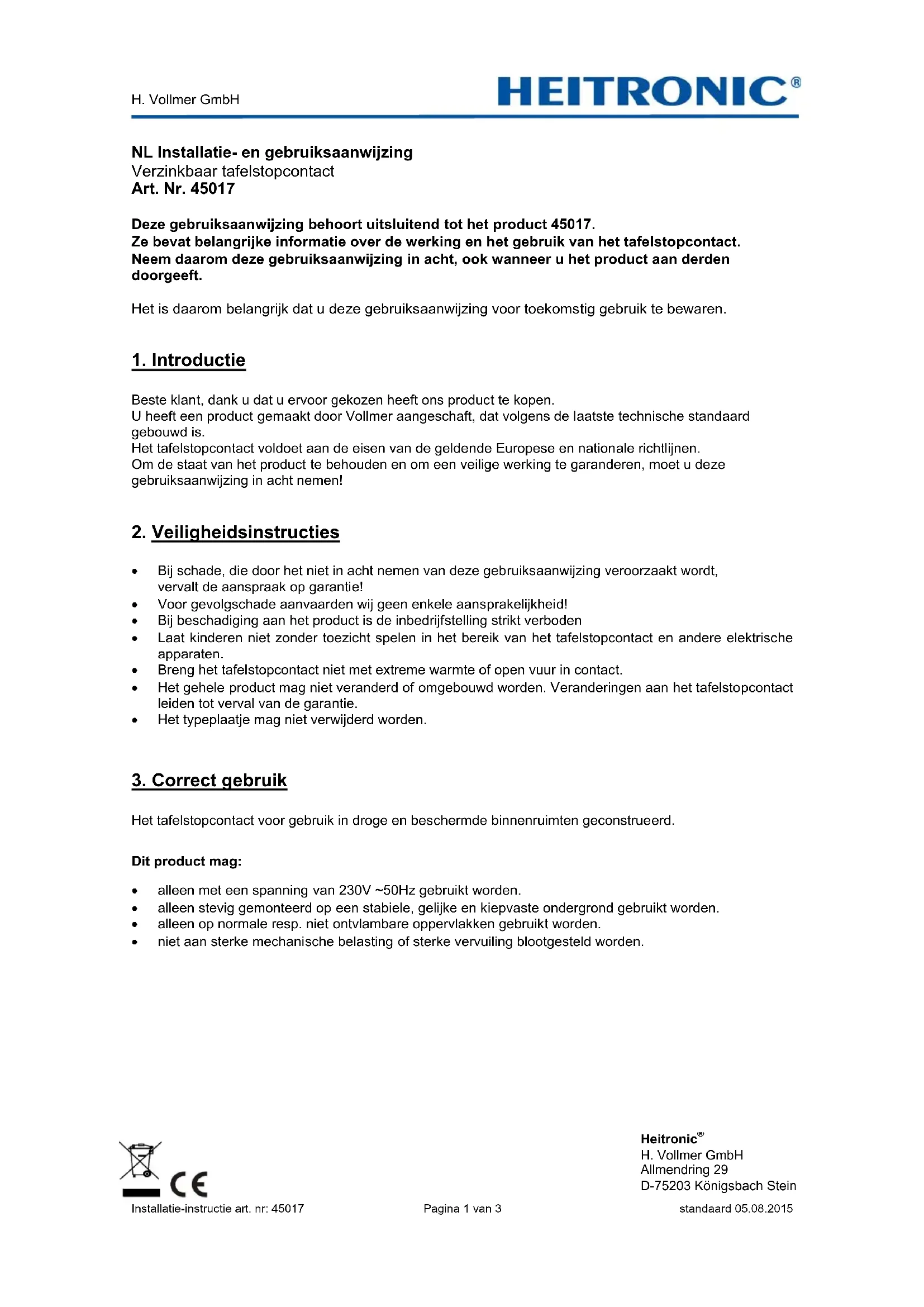 Beste klant, dank u dat u ervoor gekozen heeft ons product te kopen. U heeft een product gemaakt door Vollmer aangeschaft, dat volgens de laatste technische standaard gebouwd is. Het tafelstopcontact voldoet aan de eisen van de geldende Europese en nationale richtlijnen. Om de staat van het product te behouden en om een veilige werking te garanderen, moet u deze gebruiksaanwijzing in acht nemen!