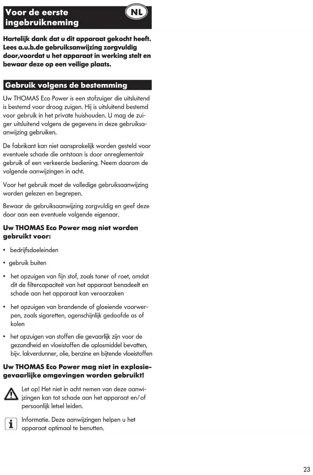 Uw THOMAS Eco Power is een stofzuiger die uitsluitend is bestemd voor droog zuigen. Hij is uitsluitend bestemd voor gebruik in het private huishouden. U mag de zui-ger uitsluitend volgens de gegevens in deze gebruiksanaanwijzing gebruiken.