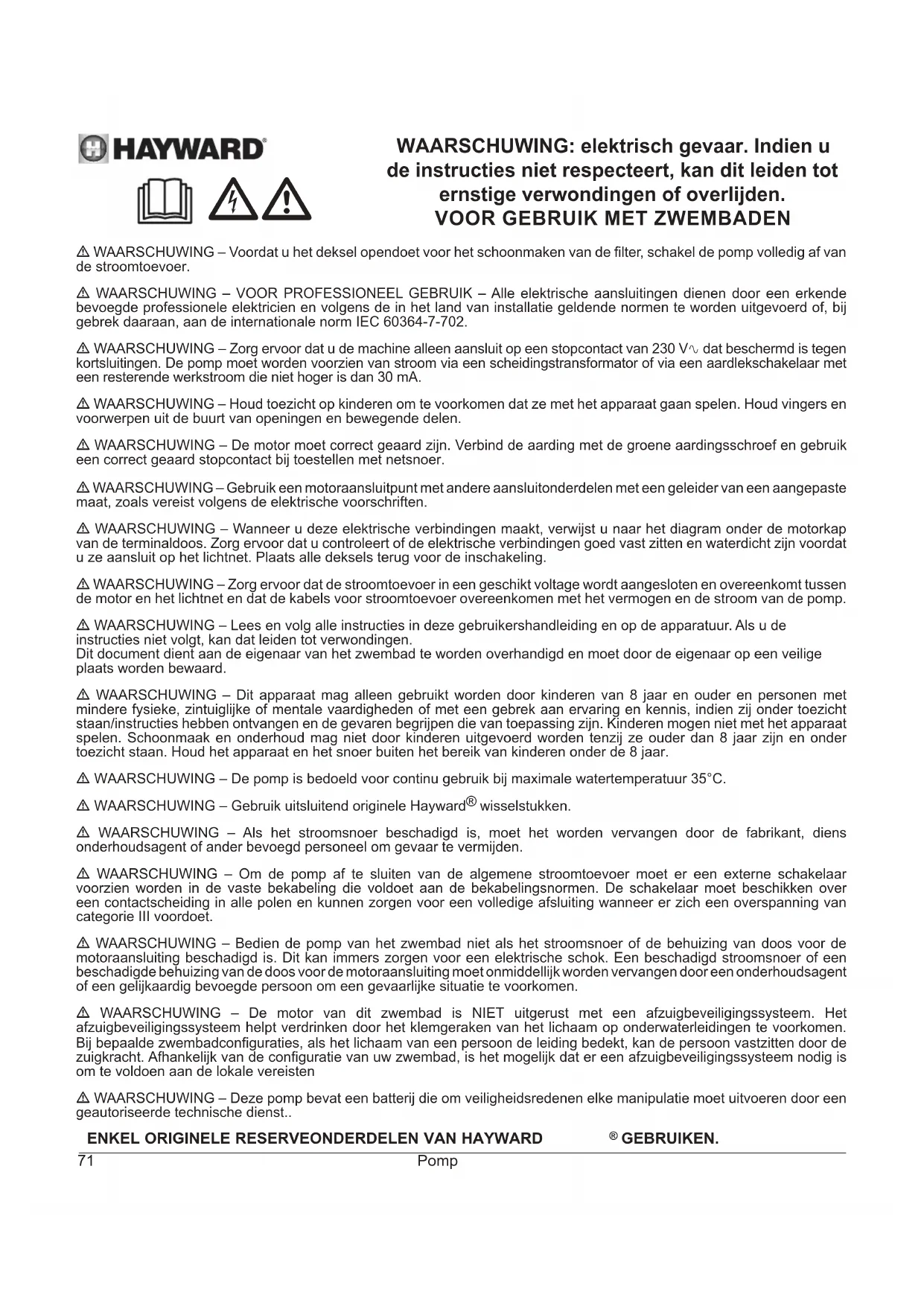 - WAARSCHUWING – Gebruik uitsluitend originele Hayward