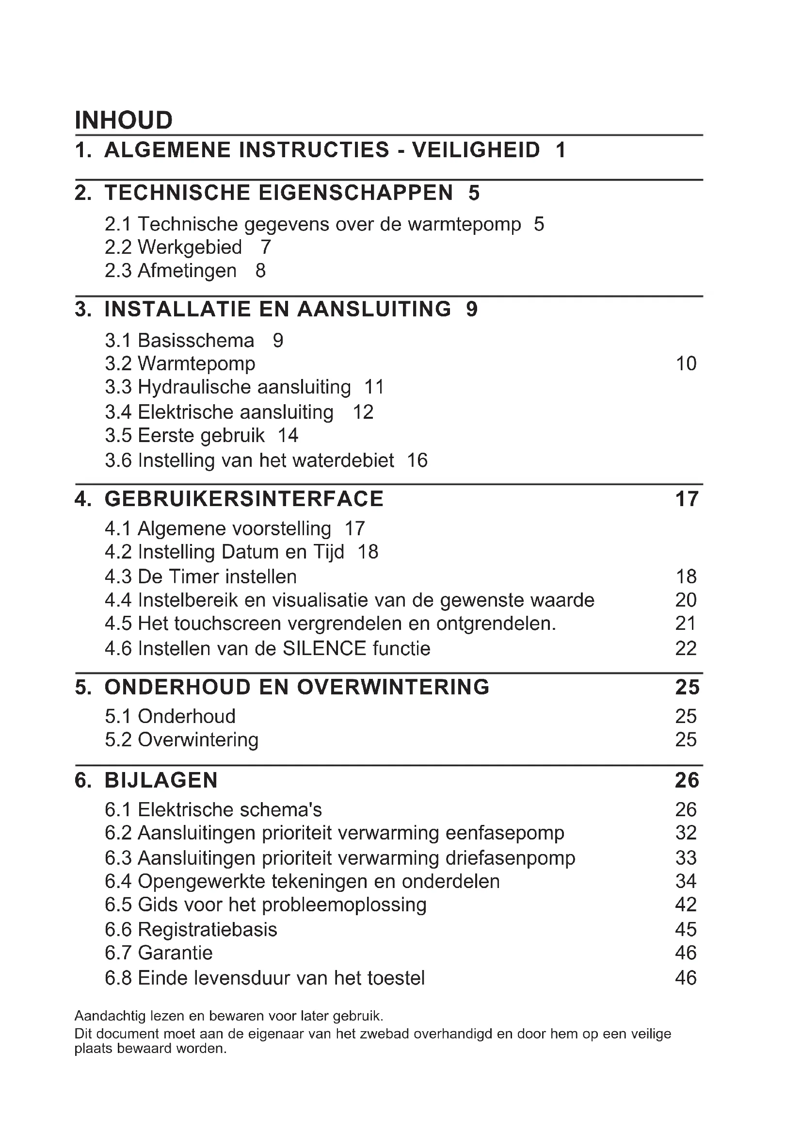 - Bedek de warmtepomp met de meegeleverde overwinteringshoes. Eender welke schade veroorzaakt door een slechte overwintering, zorgt ervoor dat de garantie geannuleerd wordt. Gebruiksvoorwaarden Dit toestel kan worden gebruikt door kinderen vanaf 8 jaar oud en door personen met beperkte lichamelijke, zintuiglijke of geestelijke vermogens, of met gebrek aan ervaring of kennis, indien zij onder adequaat toezicht staan of indien zij instructies hebben gekregen over het veilige gebruik van het toestel en de daaraan verbonden risico’s hebben begrepen. Laat kinderen niet met het toestel spelen. Reiniging en onderhoud door de gebruiker mogen niet worden uitgevoerd door kinderen zonder toezicht.5