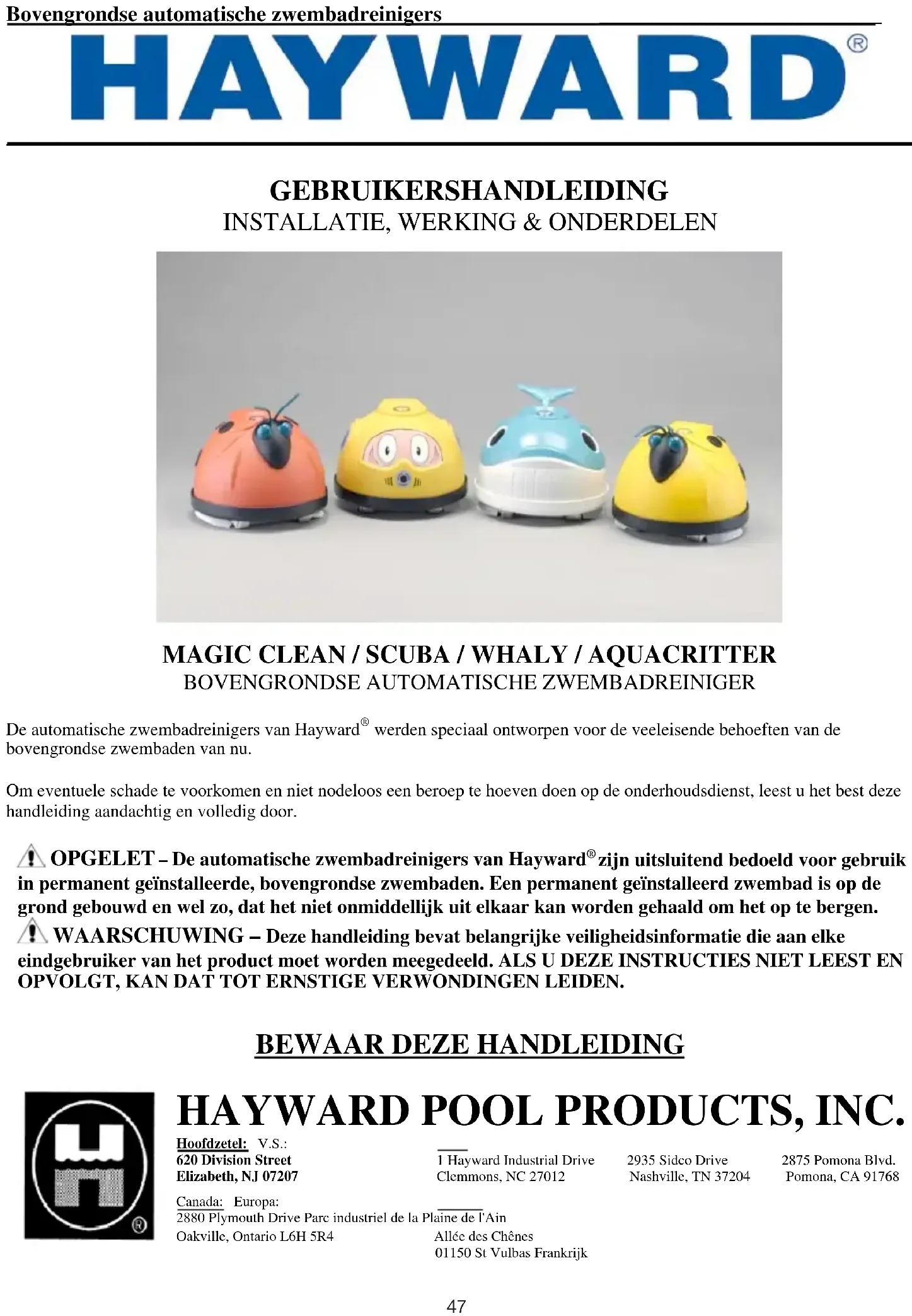 HAYWARD POOL PRODUCTS, INC. Hoofdzetel: V.S.: 620 Division Street 1 Hayward Industrial Drive 2935 Sidco Drive 2875 Pomona Blvd. Elizabeth, NJ 07207 Clemmons, NC 27012 Nashville, TN 37204 Pomona, CA 91768 Canada: Europa:2880 Plymouth Drive Parc industriel de la Plaine de l'AinOakville, Ontario L6H 5R4 Allée des Chênes 01150 St Vulbas Frankrijk 47Bovengrondse automatische zwembadreinigers __________________________ Belangrijke veiligheidsinformatie BELANGRIJKE VEILIGHEIDSINSTRUCTIES Neem bij het installeren en gebruiken van elektrische uitrusting steeds de basisregels voor de veiligheid in acht.
