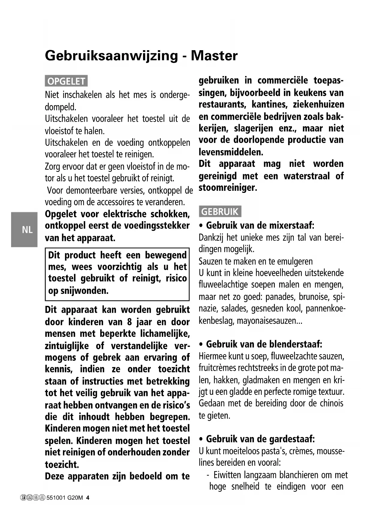 - Niveau de pression acoustique / Noise Level / Geräusch / Livello del rumore / Ruído / Geluidsniveau / Nível de pressão acústica / Akustisen paineen : ............................................................70 dB Description / Description / Beschreibung / Descrizione / Descripción / Omschrijving / Descrição / Kuvaus 551001 G20M 3NL Gebruiksaanwijzing - Master OPGELET Niet inschakelen als het mes is onderge- dompeld. Uitschakelen vooraleer het toestel uit de vloeistof te halen. Uitschakelen en de voeding ontkoppelen vooraleer het toestel te reinigen. Zorg ervoor dat er geen vloeistof in de mo- tor als u het toestel gebruikt of reinigt. Voor demonteerbare versies, ontkoppel de voeding om de accessoires te veranderen. Opgelet voor elektrische schokken, ontkoppel eerst de voedingsstekker van het apparaat. Dit product heeft een bewegend mes, wees voorzichtig als u het toestel gebruikt of reinigt, risico op snijwonden. Dit apparaat kan worden gebruikt door kinderen van 8 jaar en door mensen met beperkte lichamelijke, zintuiglijke of verstandelijke ver- mogens of gebrek aan ervaring of kennis, indien ze onder toezicht staan of instructies met betrekking tot het veilig gebruik van het appa- raat hebben ontvangen en de risico’s die dit inhoudt hebben begrepen. Kinderen mogen niet met het toestel spelen. Kinderen mogen het toestel niet reinigen of onderhouden zonder toezicht. Deze apparaten zijn bedoeld om te gebruiken in commerciële toepas- singen, bijvoorbeeld in keukens van restaurants, kantines, ziekenhuizen en commerciële bedrijven zoals bak- kerijen, slagerijen enz., maar niet voor de doorlopende productie van levensmiddelen. Dit apparaat mag niet worden gereinigd met een waterstraal of stoomreiniger. GEBRUIK