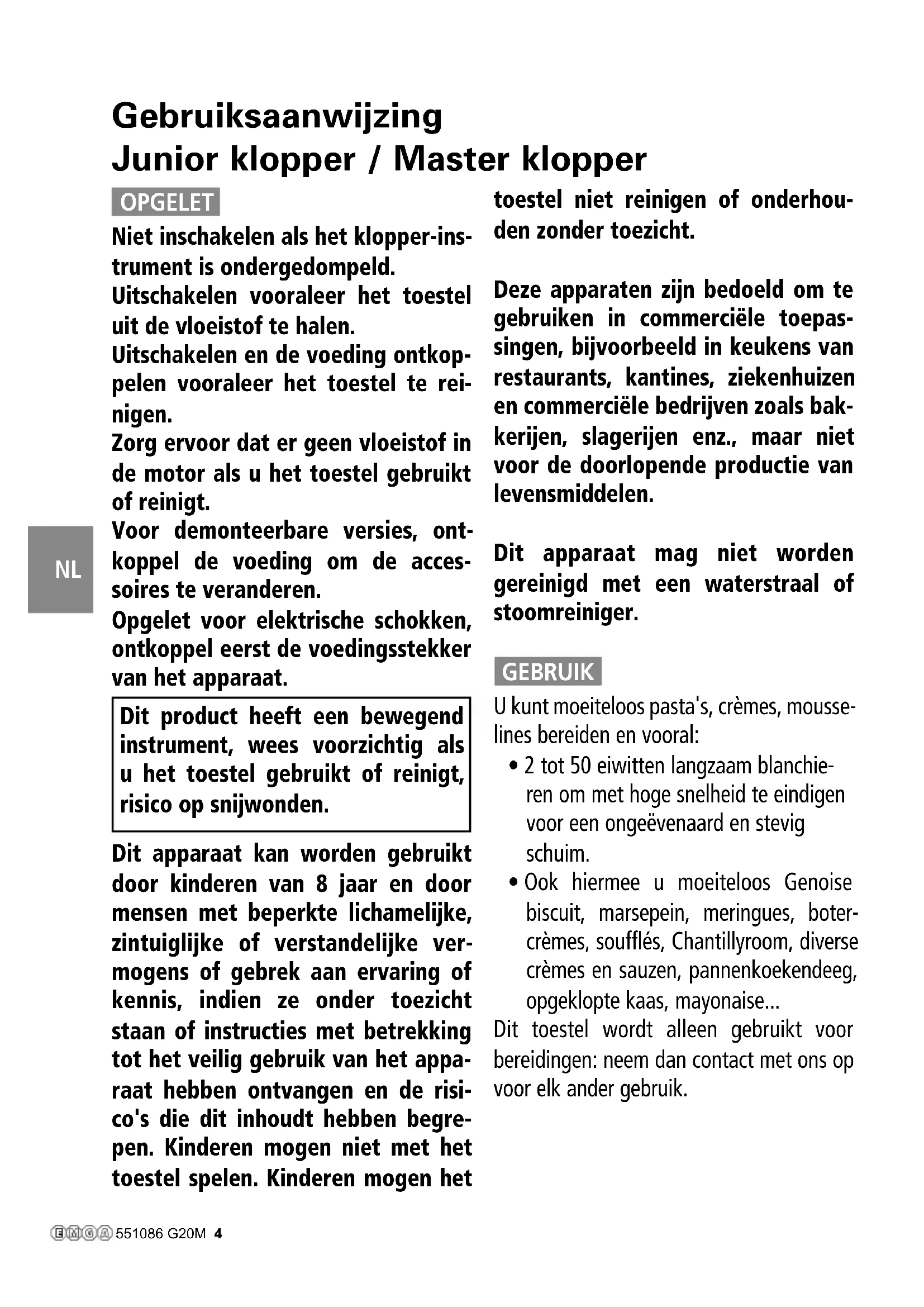 - Niveau de pression acoustique / Noise Level / Geräusch / Livello del rumore / Ruído / Geluidsniveau / Nível de pressão acústica / Akustisen paineen: ............................................................................................................................................................................................60 dB Description / Description / Beschreibung / Descrizione / Descripción / Omschrijving / Descrição / Kuvaus 551086 G20M 3NL Gebruiksaanwijzing Junior klopper / Master klopper OPGELET Niet inschakelen als het klopper-ins- trument is ondergedompeld. Uitschakelen vooraleer het toestel uit de vloeistof te halen. Uitschakelen en de voeding ontkop- pelen vooraleer het toestel te rei- nigen. Zorg ervoor dat er geen vloeistof in de motor als u het toestel gebruikt of reinigt. Voor demonteerbare versies, ont- koppel de voeding om de acces- soires te veranderen. Opgelet voor elektrische schokken, ontkoppel eerst de voedingsstekker van het apparaat. Dit product heeft een bewegend instrument, wees voorzichtig als u het toestel gebruikt of reinigt, risico op snijwonden. Dit apparaat kan worden gebruikt door kinderen van 8 jaar en door mensen met beperkte lichamelijke, zintuiglijke of verstandelijke ver- mogens of gebrek aan ervaring of kennis, indien ze onder toezicht staan of instructies met betrekking tot het veilig gebruik van het appa- raat hebben ontvangen en de risi- co's die dit inhoudt hebben begre- pen. Kinderen mogen niet met het toestel spelen. Kinderen mogen het toestel niet reinigen of onderhou- den zonder toezicht. Deze apparaten zijn bedoeld om te gebruiken in commerciële toepas- singen, bijvoorbeeld in keukens van restaurants, kantines, ziekenhuizen en commerciële bedrijven zoals bak- kerijen, slagerijen enz., maar niet voor de doorlopende productie van levensmiddelen. Dit apparaat mag niet worden gereinigd met een waterstraal of stoomreiniger. GEBRUIK U kunt moeiteloos pasta's, crèmes, mousse- lines bereiden en vooral:
