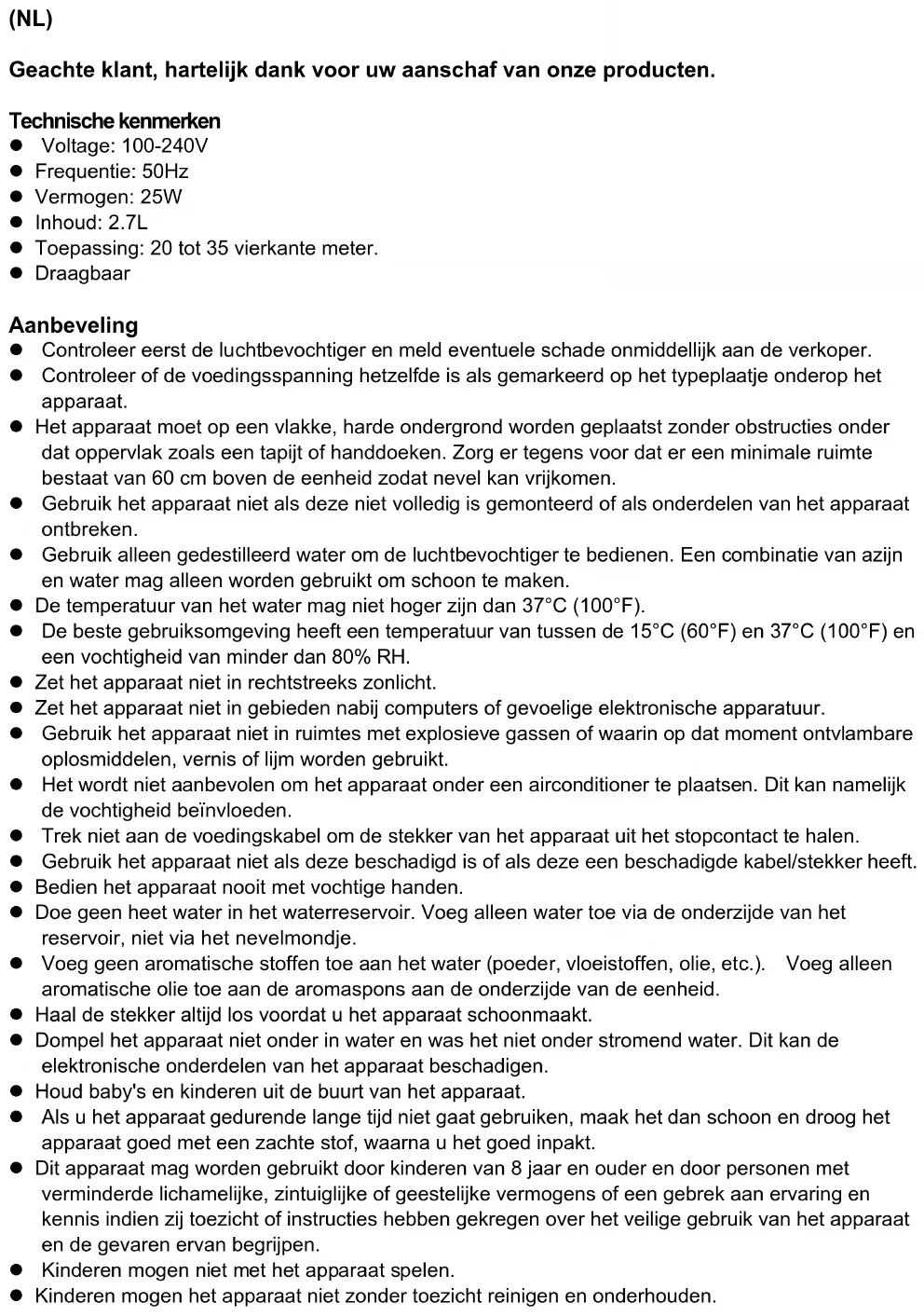 Rangement Nettoyez l'humidificateur conformément à la procédure de NETTOYAGE et séchez-le soigneusement. N'enroulez pas le câble autour de l'appareil. Conservez l'appareil dans son emballage d'origine, à température ambiante, loin des bébés et des enfants. Remarque : Le fabricant se réserve le droit d'apporter, sans préavis, des modifications à l'appareil qui ne portent pas atteinte à ses caractéristiques techniques et qui résultent d'améliorations apportées à sa conception ou à sa technologie de production. Élimination Débarrassez-vous de l'appareil en respectant l'environnement. Il ne doit pas être jeté avec les ordures ménagères. Veuillez vous en débarrasser dans un point de recyclage pour les appareils électriques et électroniques usagés. Vous pourrez si vous le désirez obtenir un complément d'informations auprès de vos autorités locales.(NL) Geachte klant, hartelijk dank voor uw aanschaf van onze producten. Technische kenmerken l Voltage: 100-240V l Frequentie: 50Hz l Vermogen: 25W l Inhoud: 2.7L l Toepassing: 20 tot 35 vierkante meter. l Draagbaar Aanbeveling l Controleer eerst de luchtbevochtiger en meld eventuele schade onmiddellijk aan de verkoper. l Controleer of de voedingsspanning hetzelfde is als gemarkeerd op het typeplaatje onderop het apparaat. l Het apparaat moet op een vlakke, harde ondergrond worden geplaatst zonder obstructies onder dat oppervlak zoals een tapijt of handdoeken. Zorg er tegens voor dat er een minimale ruimte bestaat van 60 cm boven de eenheid zodat nevel kan vrijkomen. l Gebruik het apparaat niet als deze niet volledig is gemonteerd of als onderdelen van het apparaat ontbreken. l Gebruik alleen gedestilleerd water om de luchtbevochtiger te bedienen. Een combinatie van azijn en water mag alleen worden gebruikt om schoon te maken. l De temperatuur van het water mag niet hoger zijn dan 37°C (100°F). l De beste gebruiksomgeving heeft een temperatuur van tussen de 15°C (60°F) en 37°C (100°F) en een vochtigheid van minder dan 80% RH. l Zet het apparaat niet in rechtstreeks zonlicht. l Zet het apparaat niet in gebieden nabij computers of gevoelige elektronische apparatuur. l Gebruik het apparaat niet in ruimtes met explosieve gassen of waarin op dat moment ontvlambare oplosmiddelen, vernis of lijm worden gebruikt. l Het wordt niet aanbevolen om het apparaat onder een airconditioner te plaatsen. Dit kan namelijk de vochtigheid beïnvloeden. l Trek niet aan de voedingskabel om de stekker van het apparaat uit het stopcontact te halen. l Gebruik het apparaat niet als deze beschadigd is of als deze een beschadigde kabel/stekker heeft. l Bedien het apparaat nooit met vochtige handen. l Doe geen heet water in het waterreservoir. Voeg alleen water toe via de onderzijde van het reservoir, niet via het nevelmondje. l Voeg geen aromatische stoffen toe aan het water (poeder, vloeistoffen, olie, etc.). Voeg alleen aromatische olie toe aan de aromaspons aan de onderzijde van de eenheid. l Haal de stekker altijd los voordat u het apparaat schoonmaakt. l Dompel het apparaat niet onder in water en was het niet onder stromend water. Dit kan de elektronische onderdelen van het apparaat beschadigen. l Houd baby's en kinderen uit de buurt van het apparaat. l Als u het apparaat gedurende lange tijd niet gaat gebruiken, maak het dan schoon en droog het apparaat goed met een zachte stof, waarna u het goed inpakt. l Dit apparaat mag worden gebruikt door kinderen van 8 jaar en ouder en door personen met verminderde lichamelijke, zintuiglijke of geestelijke vermogens of een gebrek aan ervaring en kennis indien zij toezicht of instructies hebben gekregen over het veilige gebruik van het apparaat en de gevaren ervan begrijpen. l Kinderen mogen niet met het apparaat spelen. l Kinderen mogen het apparaat niet zonder toezicht reinigen en onderhouden.Vóór het eerste gebruik l Verwijder het apparaat uit de verpakking. l Laat de verpakking (plastic zakken, polystyreen, etc.) niet achter binnen bereik van baby's en kinderen. l Na vervoer bij een lage temperatuur dient het apparaat gedurende 2 uur in de ruimte te acclimatiseren voordat het kan worden gebruikt. l Doe alleen schoon water in het waterreservoir. Beschrijving