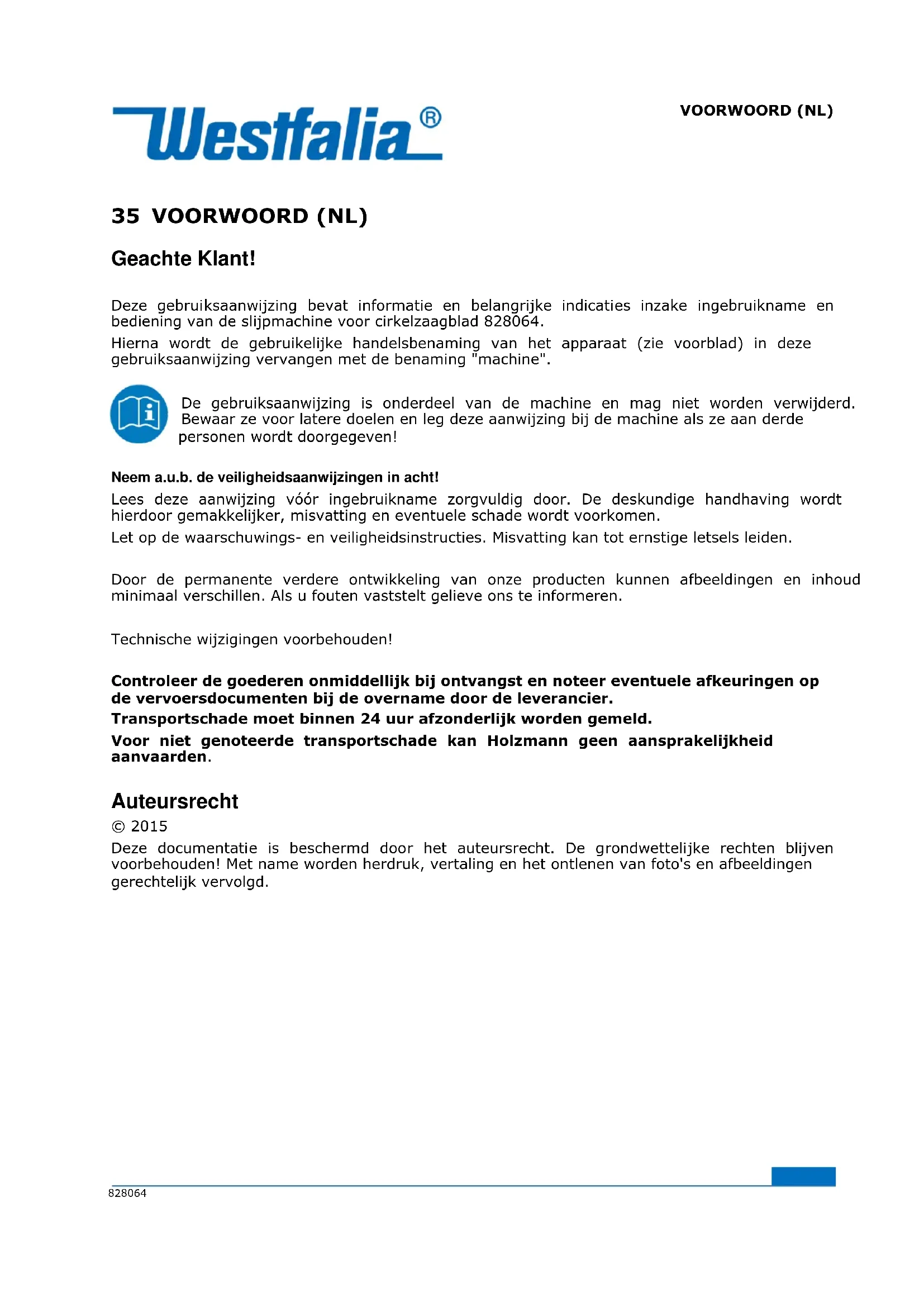 35 VOORWOORD (NL) Geachte Klant! Deze gebruiksaanwijzing bevat informatie en belangrijke indicaties inzake ingebruikname en bediening van de slijpmachine voor cirkelzaagblad 828064. Hierna wordt de gebruikelijke handelsbenaming van het apparaat (zie voorblad) in deze gebruiksaanwijzing vervangen met de benaming "machine". De gebruiksaanwijzing is onderdeel van de machine en mag niet worden verwijderd. Bewaar ze voor latere doelen en leg deze aanwijzing bij de machine als ze aan derde personen wordt doorgegeven! Neem a.u.b. de veiligheidsaanwijzingen in acht! Lees deze aanwijzing vóór ingebruikname zorgvuldig door. De deskundige handhaving wordt hierdoor gemakkelijker, misvatting en eventuele schade wordt voorkomen. Let op de waarschuwings- en veiligheidsinstructies. Misvatting kan tot ernstige letsels leiden. Door de permanente verdere ontwikkeling van onze producten kunnen afbeeldingen en inhoud minimaal verschillen. Als u fouten vaststelt gelieve ons te informeren. Technische wijzigingen voorbehouden! Controleer de goederen onmiddellijk bij ontvangst en noteer eventuele afkeuringen op de vervoersdocumenten bij de overname door de leverancier. Transportschade moet binnen 24 uur afzonderlijk worden gemeld. Voor niet genoteerde transportschade kan Holzmann geen aansprakelijkheid aanvaarden. Auteursrecht © 2015 Deze documentatie is beschermd door het auteursrecht. De grondwettelijke rechten blijven voorbehouden! Met name worden herdruk, vertaling en het ontlenen van foto's en afbeeldingen gerechtelijk vervolgd.VEILIGHEID