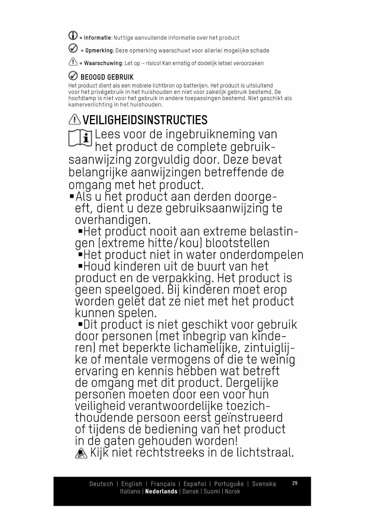 Let op de onderstaande tekens en woorden, die in de gebruiksaanwijzing, op het product en op de verpakking worden gebruikt. Deutsch | English | Français | Español | Português | Svenska Italiano | Nederlands | Dansk | Suomi | Norsk29 Deutsch | English | Français | Español | Português | Svenska Italiano | Nederlands | Dansk | Suomi | Norsk = Informatie: Nuttige aanvullende informatie over het product = Opmerking: Deze opmerking waarschuwt voor allerlei mogelijke schade = Waarschuwing: Let op – risico! Kan ernstig of dodelijk letsel veroorzaken BEOOGD GEBRUIK Het product dient als een mobiele lichtbron op batterijen. Het product is uitsluitend voor het privégebruik in het huishouden en niet voor zakelijk gebruik bestemd. De hoofdlamp is niet voor het gebruik in andere toepassingen bestemd. Niet geschikt als kamerverlichting in het huishouden. VEILIGHEIDSINSTRUCTIES Lees voor de ingebruikneming van het product de complete gebruik- saanwijzing zorgvuldig door. Deze bevat belangrijke aanwijzingen betreffende de omgang met het product. §Als u het product aan derden doorge- eft, dient u deze gebruiksaanwijzing te overhandigen. §Het product nooit aan extreme belastin- gen (extreme hitte/kou) blootstellen §Het product niet in water onderdompelen §Houd kinderen uit de buurt van het product en de verpakking. Het product is geen speelgoed. Bij kinderen moet erop worden gelet dat ze niet met het product kunnen spelen. §Dit product is niet geschikt voor gebruik door personen (met inbegrip van kinde- ren) met beperkte lichamelijke, zintuiglij- ke of mentale vermogens of die te weinig ervaring en kennis hebben wat betreft de omgang met dit product. Dergelijke personen moeten door een voor hun veiligheid verantwoordelijke toezich- thoudende persoon eerst geïnstrueerd of tijdens de bediening van het product in de gaten gehouden worden!