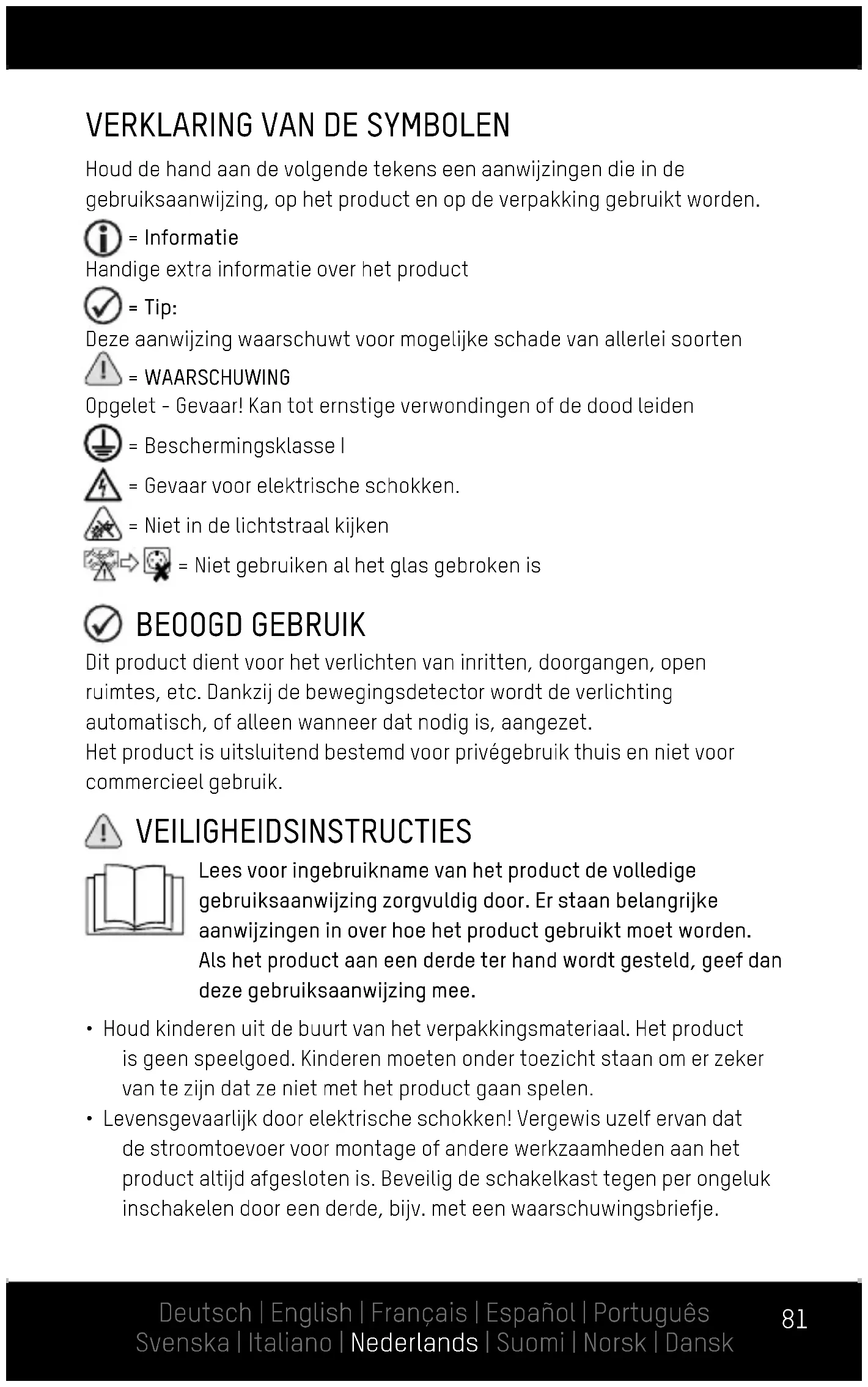Houd de hand aan de volgende tekens een aanwijzingen die in de gebruiksaanwijzing, op het product en op de verpakking gebruikt worden. = Informatie Handige extra informatie over het product = Tip: Deze aanwijzing waarschuwt voor mogelijke schade van allerlei soorten = WAARSCHUWING Opgelet - Gevaar! Kan tot ernstige verwondingen of de dood leiden = Beschermingsklasse I = Gevaar voor elektrische schokken. = Niet in de lichtstraal kijken = Niet gebruiken al het glas gebroken is BEOOGD GEBRUIK Dit product dient voor het verlichten van inritten, doorgangen, open ruimtes, etc. Dankzij de bewegingsdetector wordt de verlichting automatisch, of alleen wanneer dat nodig is, aangezet. Het product is uitsluitend bestemd voor privégebruik thuis en niet voor commercieel gebruik. VEILIGHEIDSINSTRUCTIES Lees voor ingebruikname van het product de volledige gebruiksaanwijzing zorgvuldig door. Er staan belangrijke aanwijzingen in over hoe het product gebruikt moet worden. Als het product aan een derde ter hand wordt gesteld, geef dan deze gebruiksaanwijzing mee.