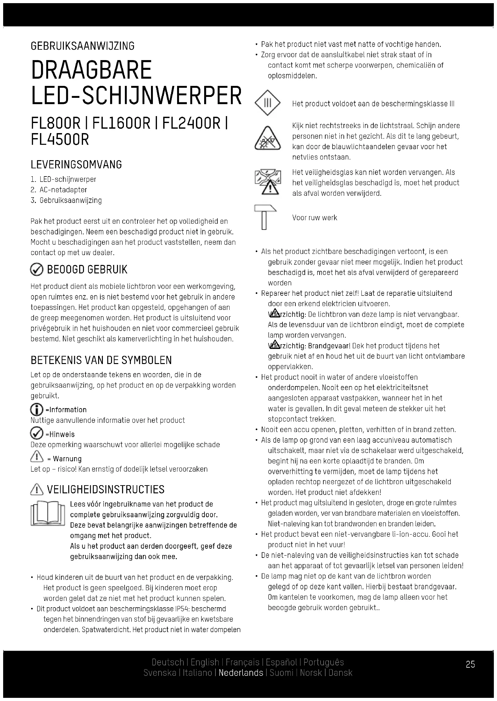 Pak het product eerst uit en controleer het op volledigheid en beschadigingen. Neem een beschadigd product niet in gebruik. Mocht u beschadigingen aan het product vaststellen, neem dan contact op met uw dealer. BEOOGD GEBRUIK Het product dient als mobiele lichtbron voor een werkomgeving, open ruimtes enz. en is niet bestemd voor het gebruik in andere toepassingen. Het product kan opgesteld, opgehangen of aan de greep meegenomen worden. Het product is uitsluitend voor privégebruik in het huishouden en niet voor commercieel gebruik bestemd. Niet geschikt als kamerverlichting in het huishouden.